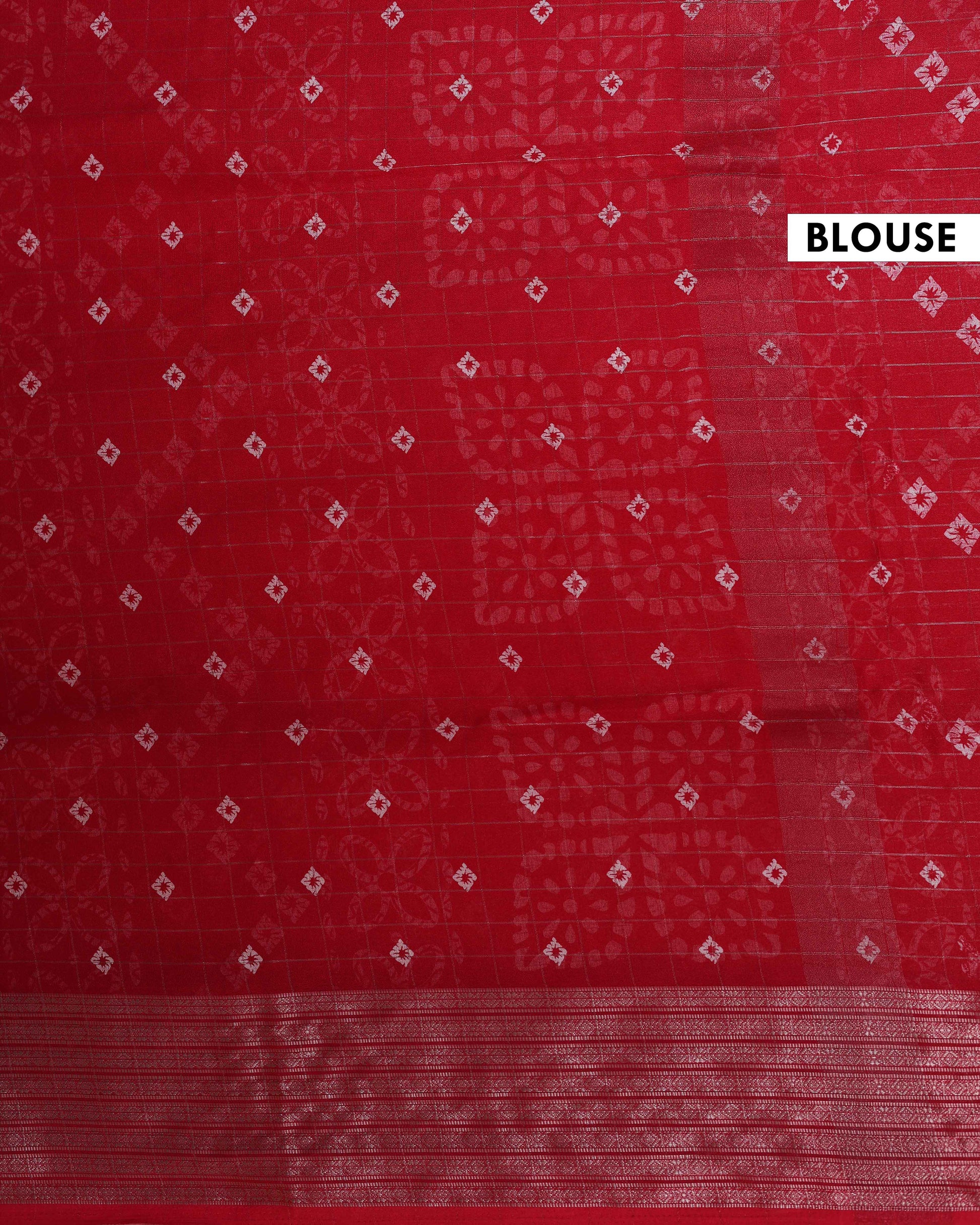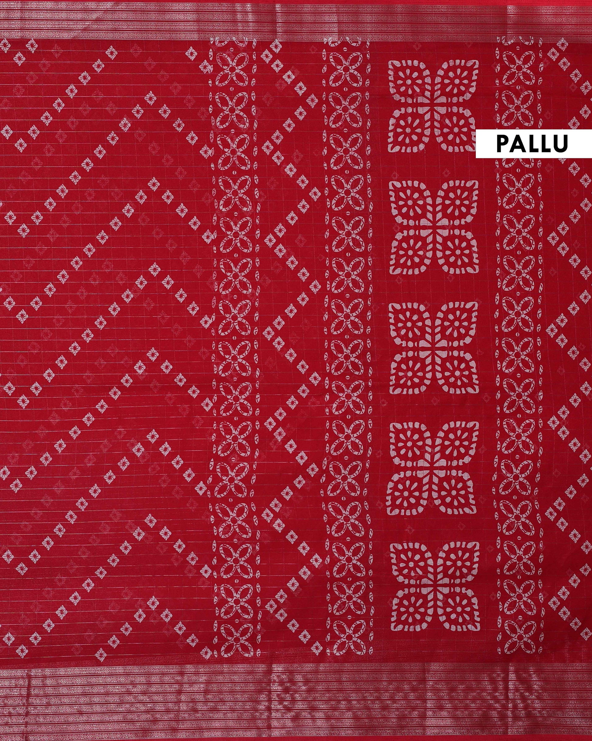 - Elevate your style with this stunning red Dola silk saree intricate white geometric and floral patterns