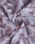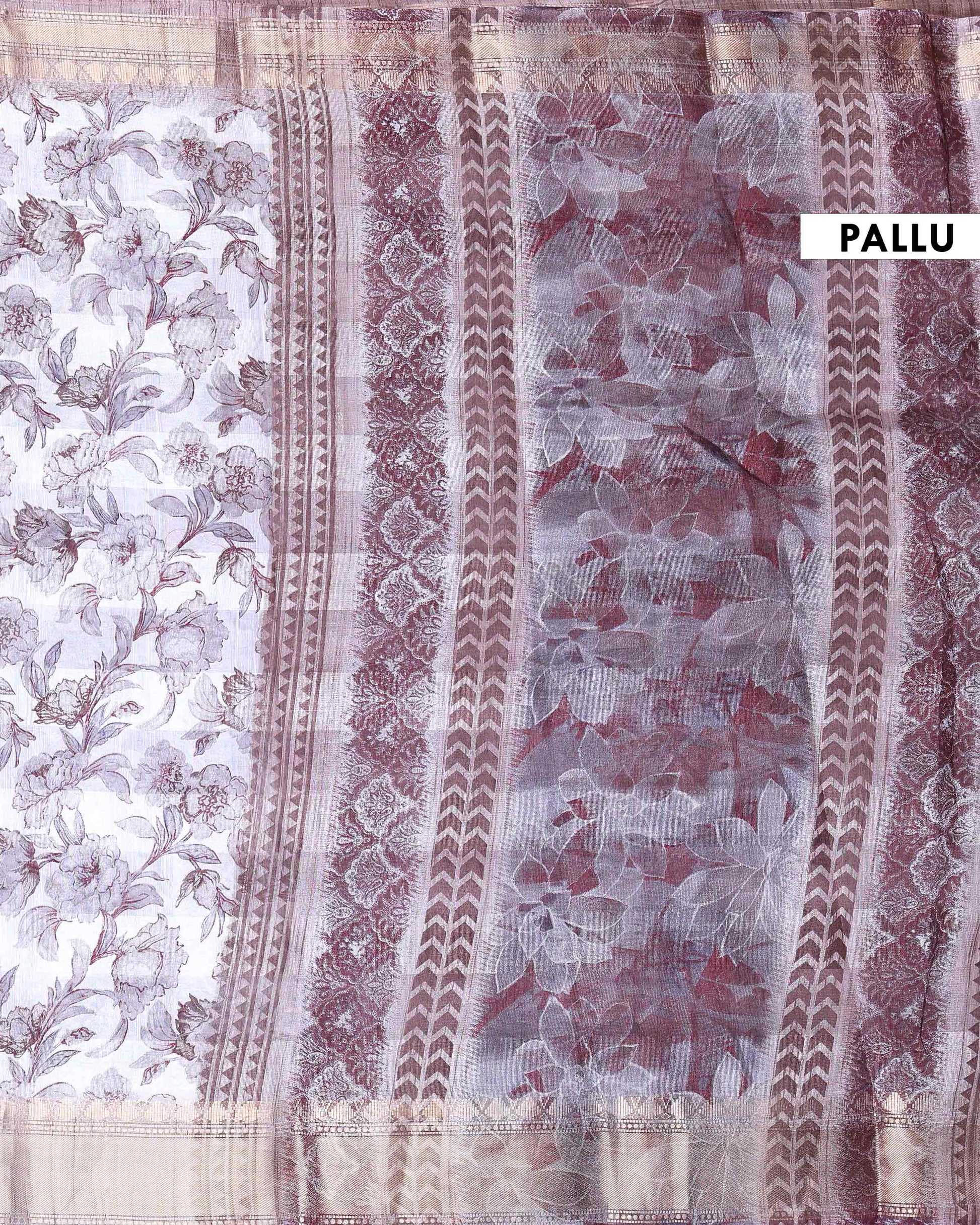 - Crafted in premium Dola silk, this saree features an all over floral print complemented by a finely woven border and graceful pallu.