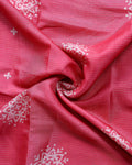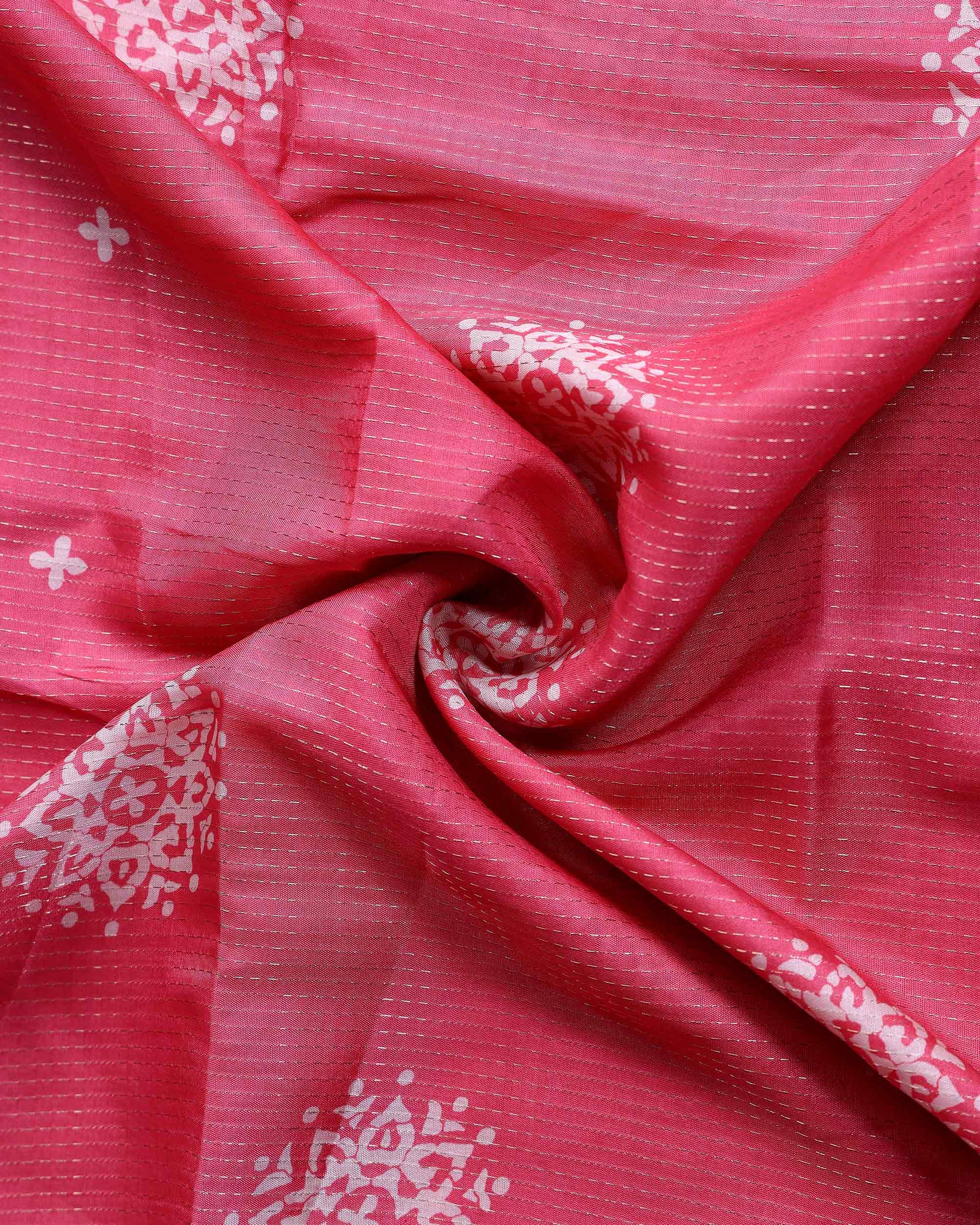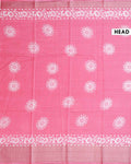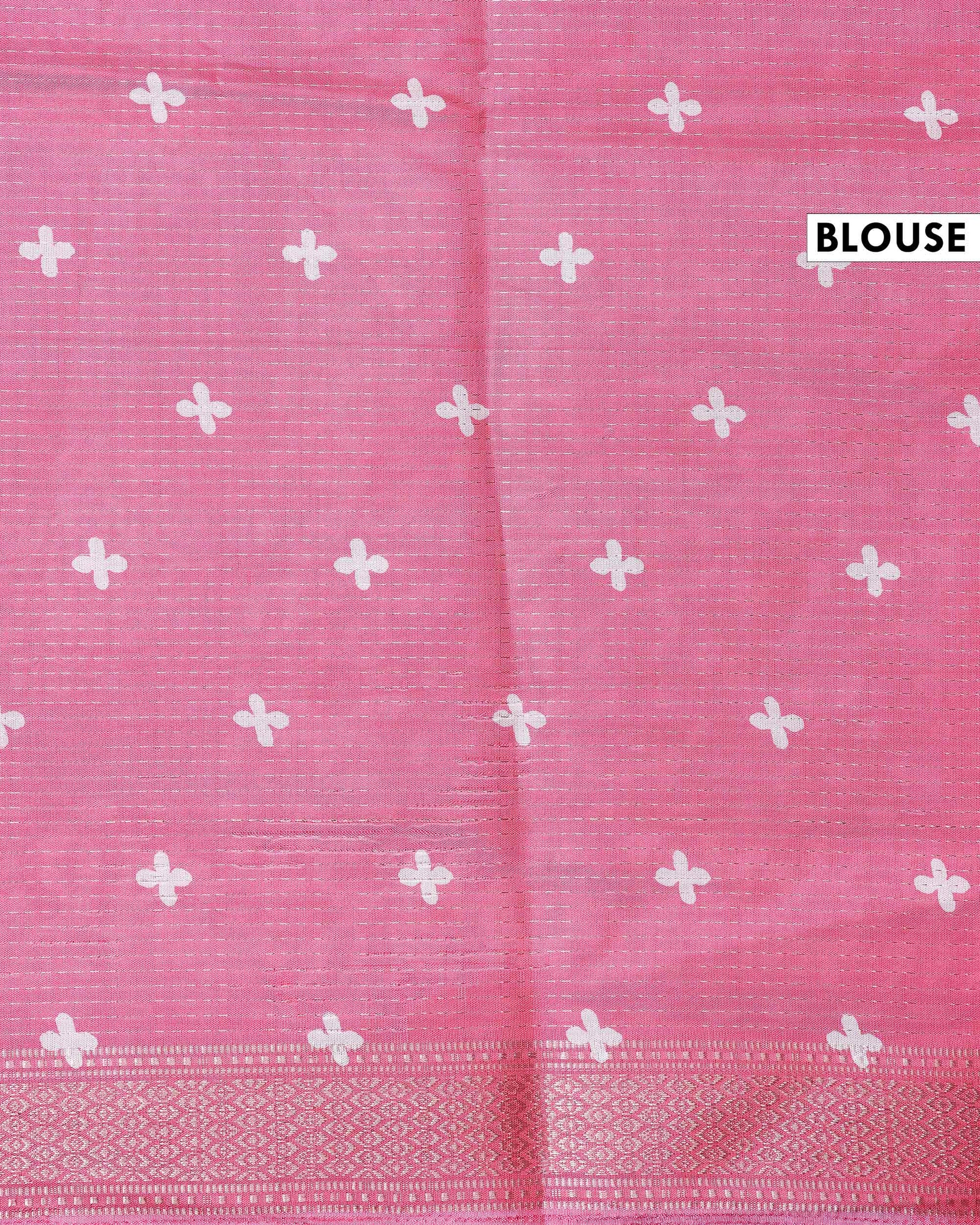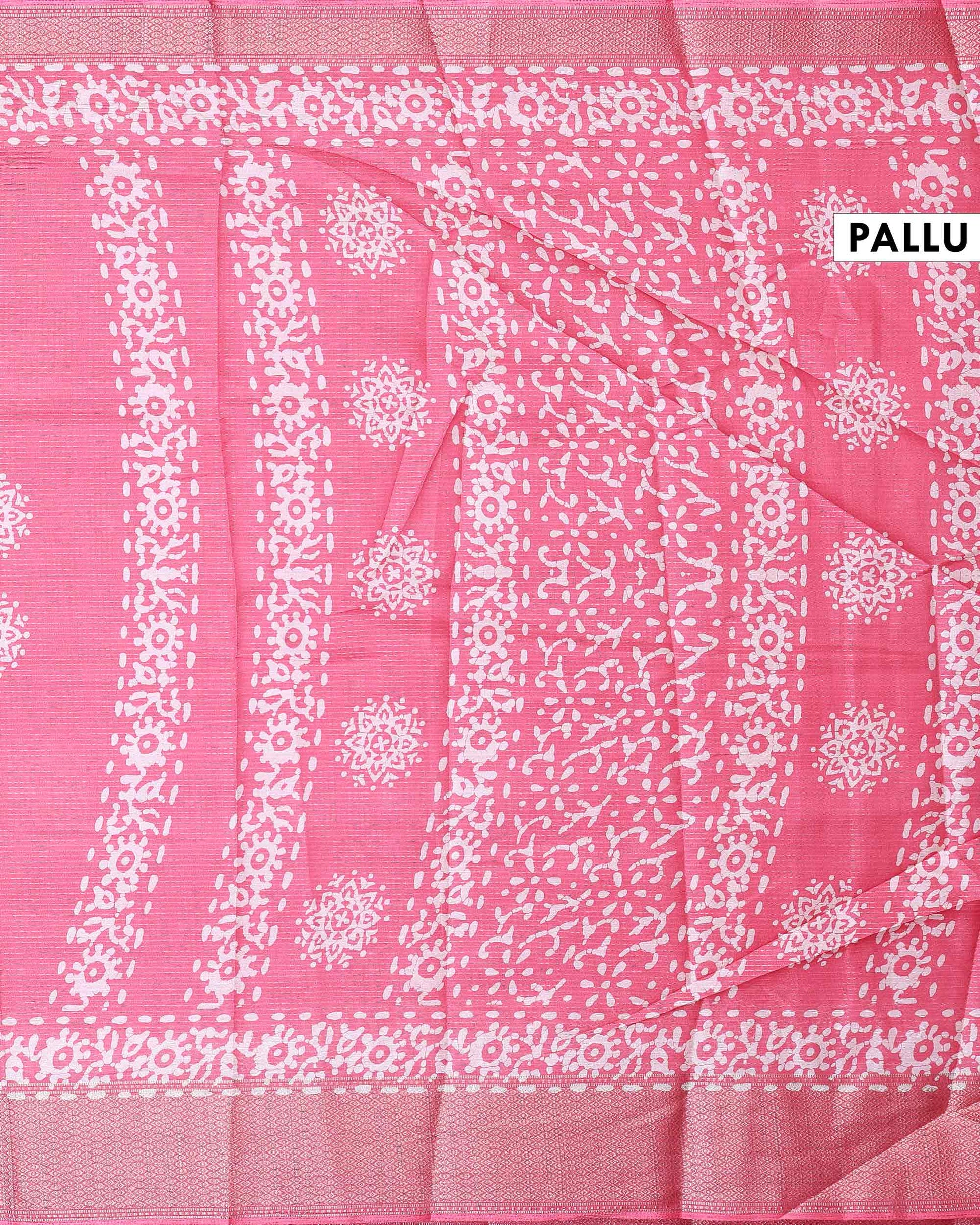 - Elegant pink Dola silk saree featuring delicate white floral and geometric motifs, perfect for festive and party occasions.