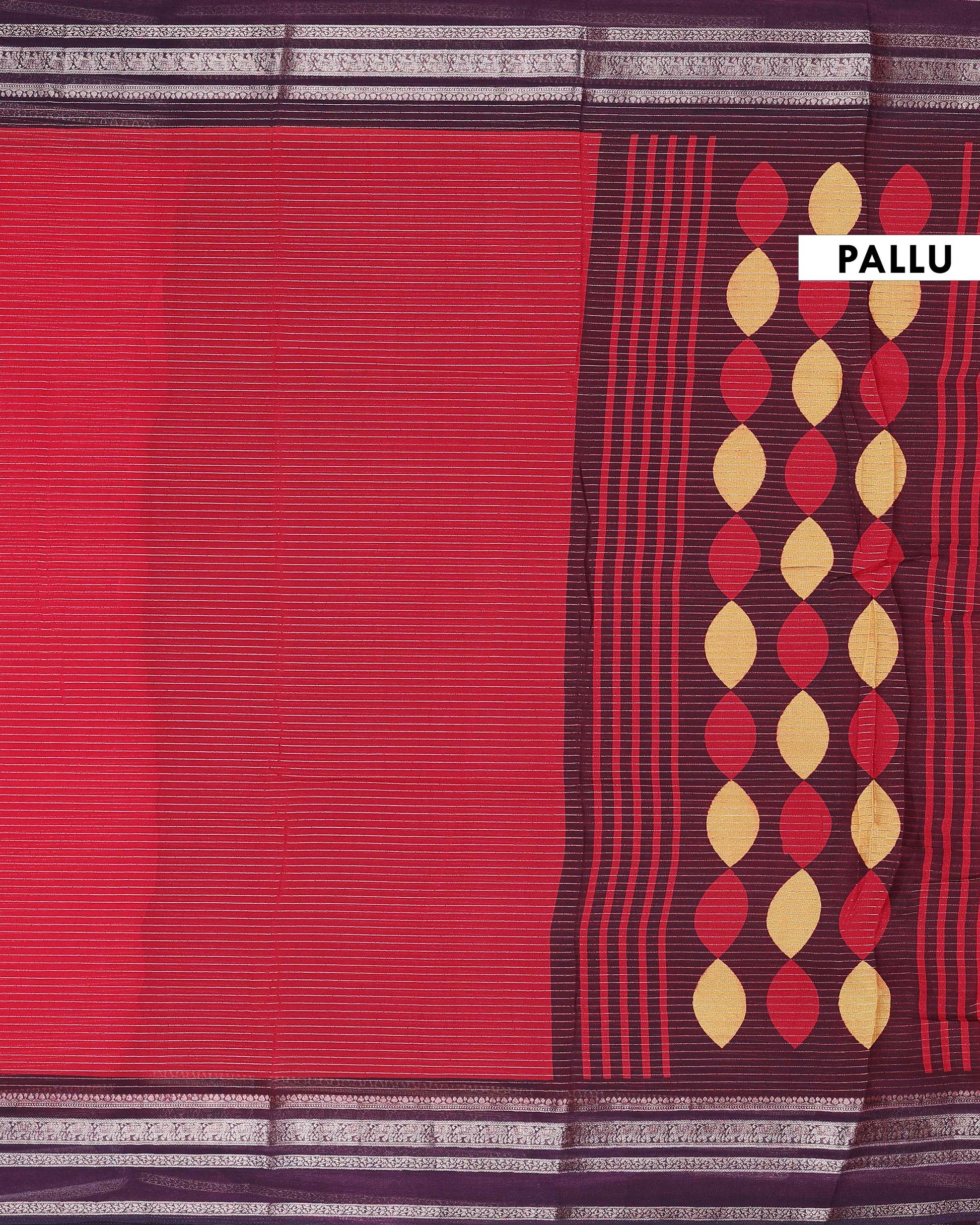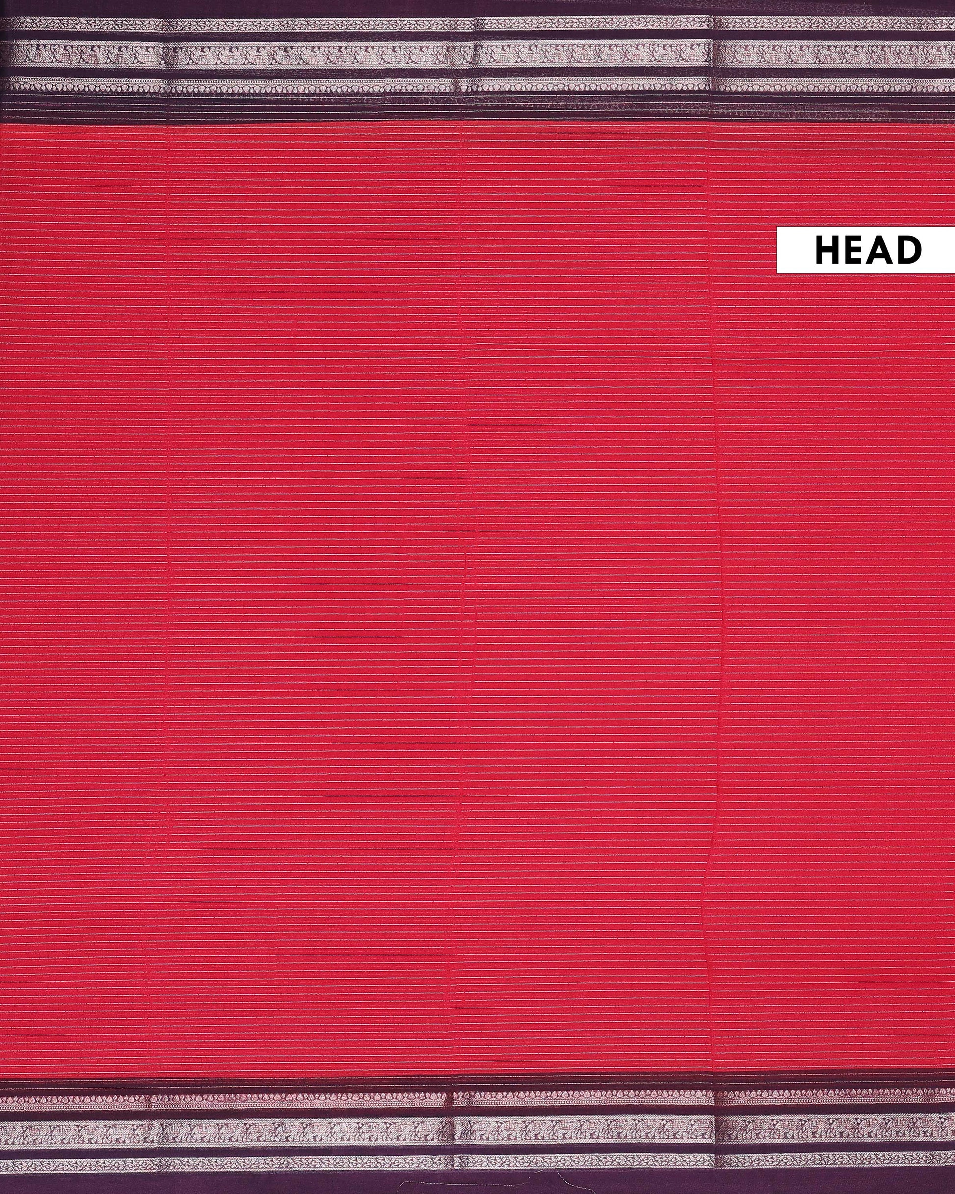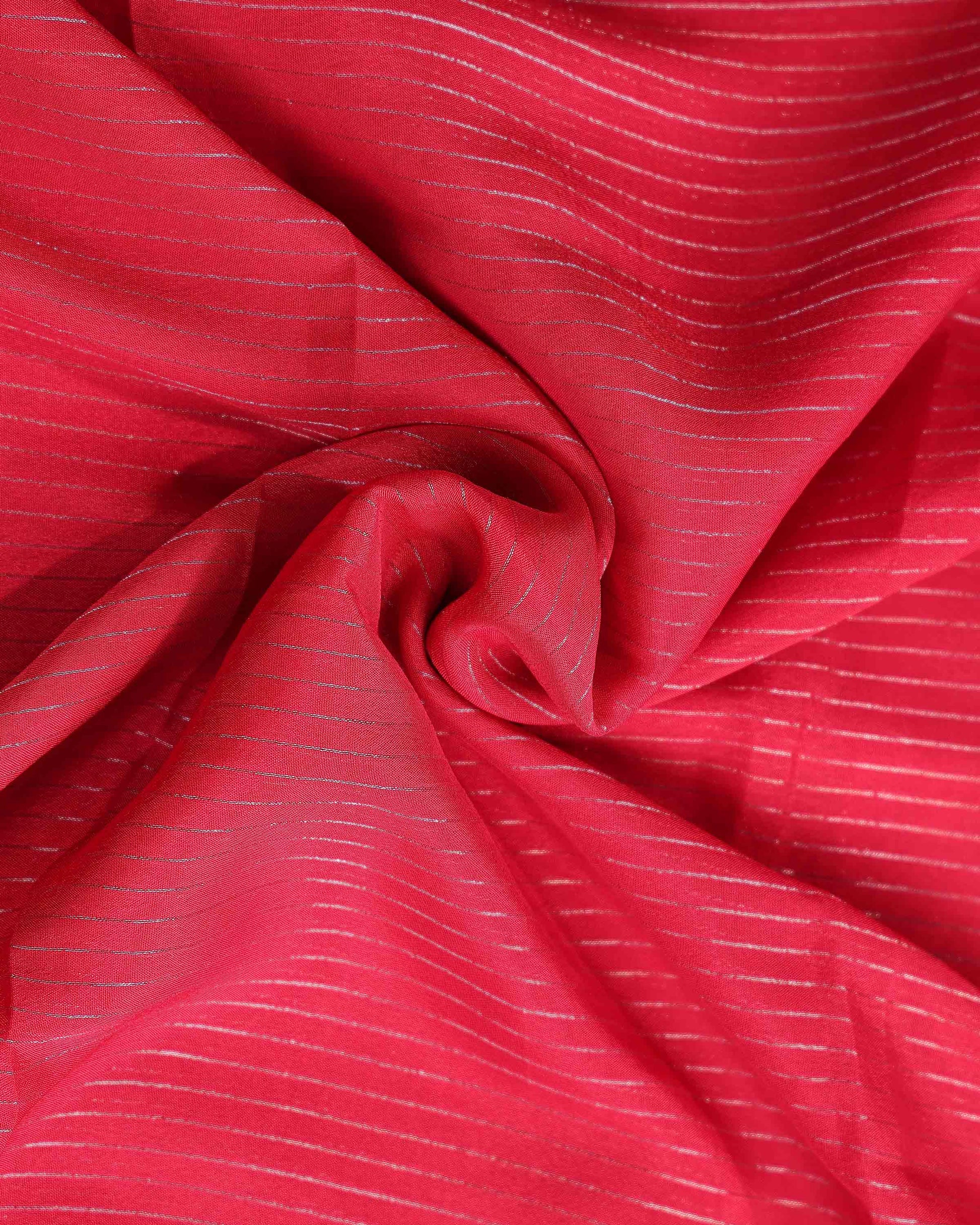 - Elegant red Dola silk saree featuring a refined silver striped body and a rich zari border for a timeless traditional look.