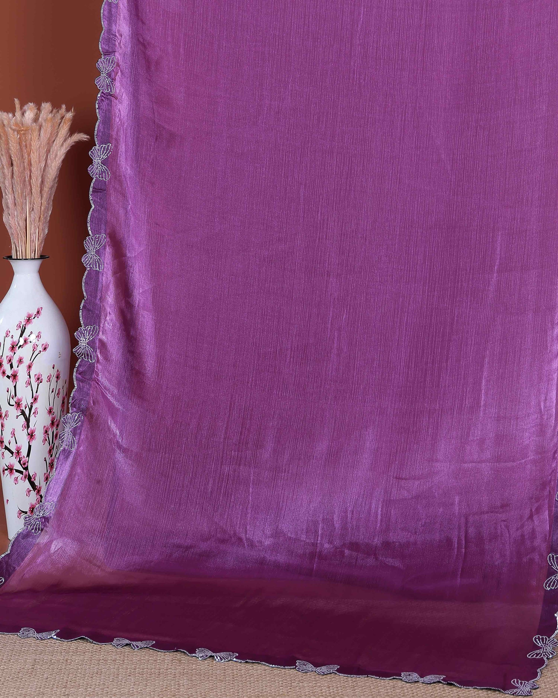 - Elevate your style with this stunning purple fancy saree delicate shimmering trim for a touch of elegance.