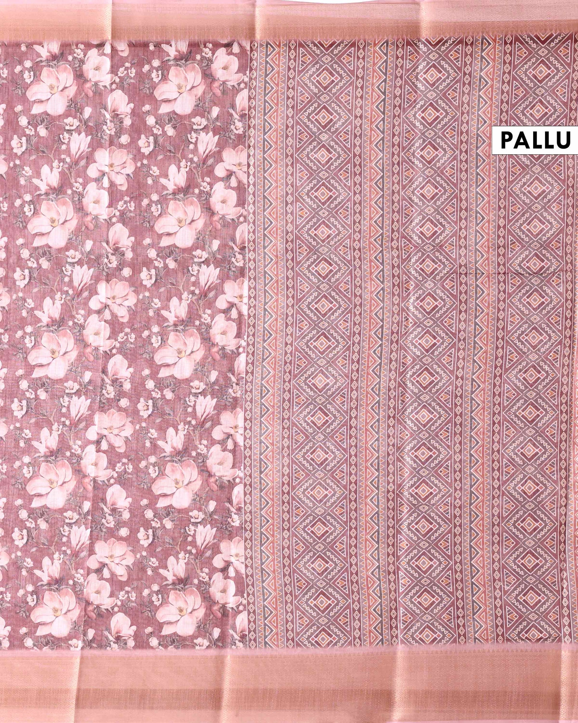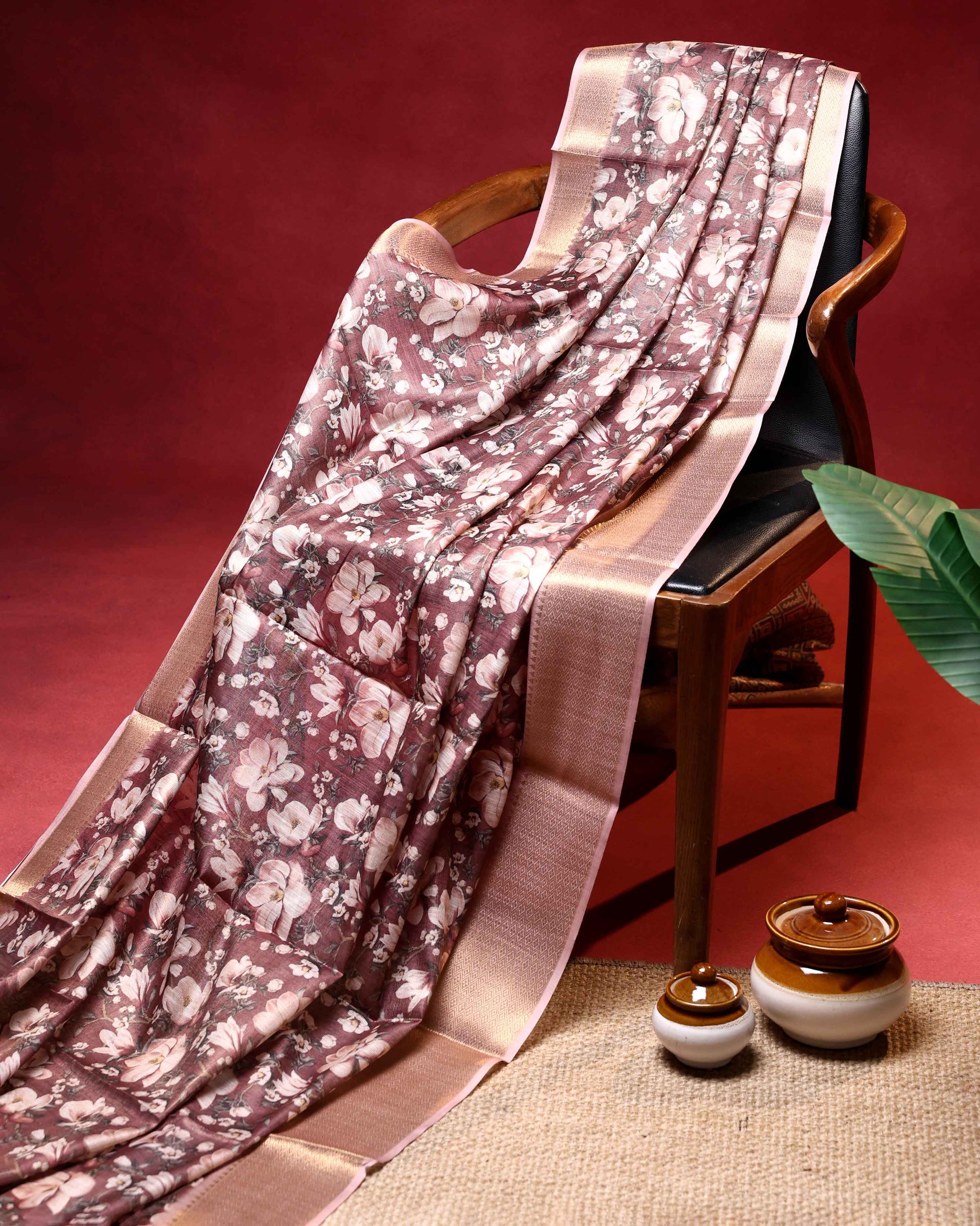 - Discover timeless elegance with this Brown floral printed linen tissue saree featuring bold floral motifs.