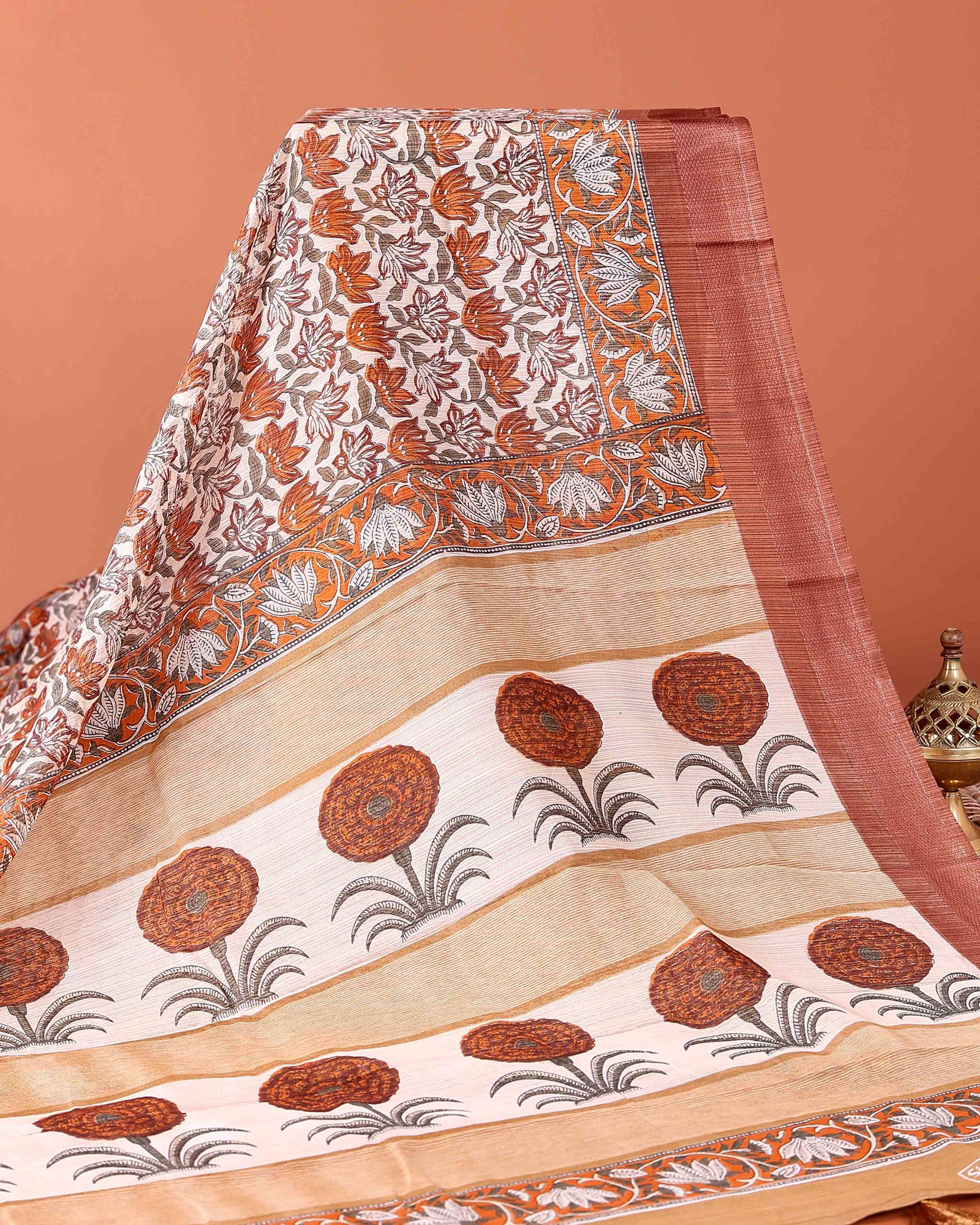 - This elegant Brown Georgette saree vibrant floral prints and a plain border for a graceful and stylish look