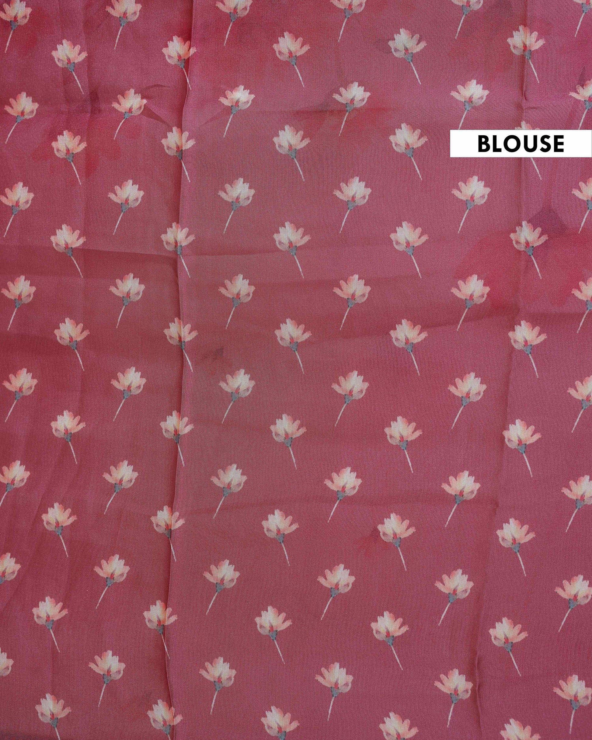 - Elevate your style with this stunning floral print Georgette saree, a delicate lace border and vibrant patterns
