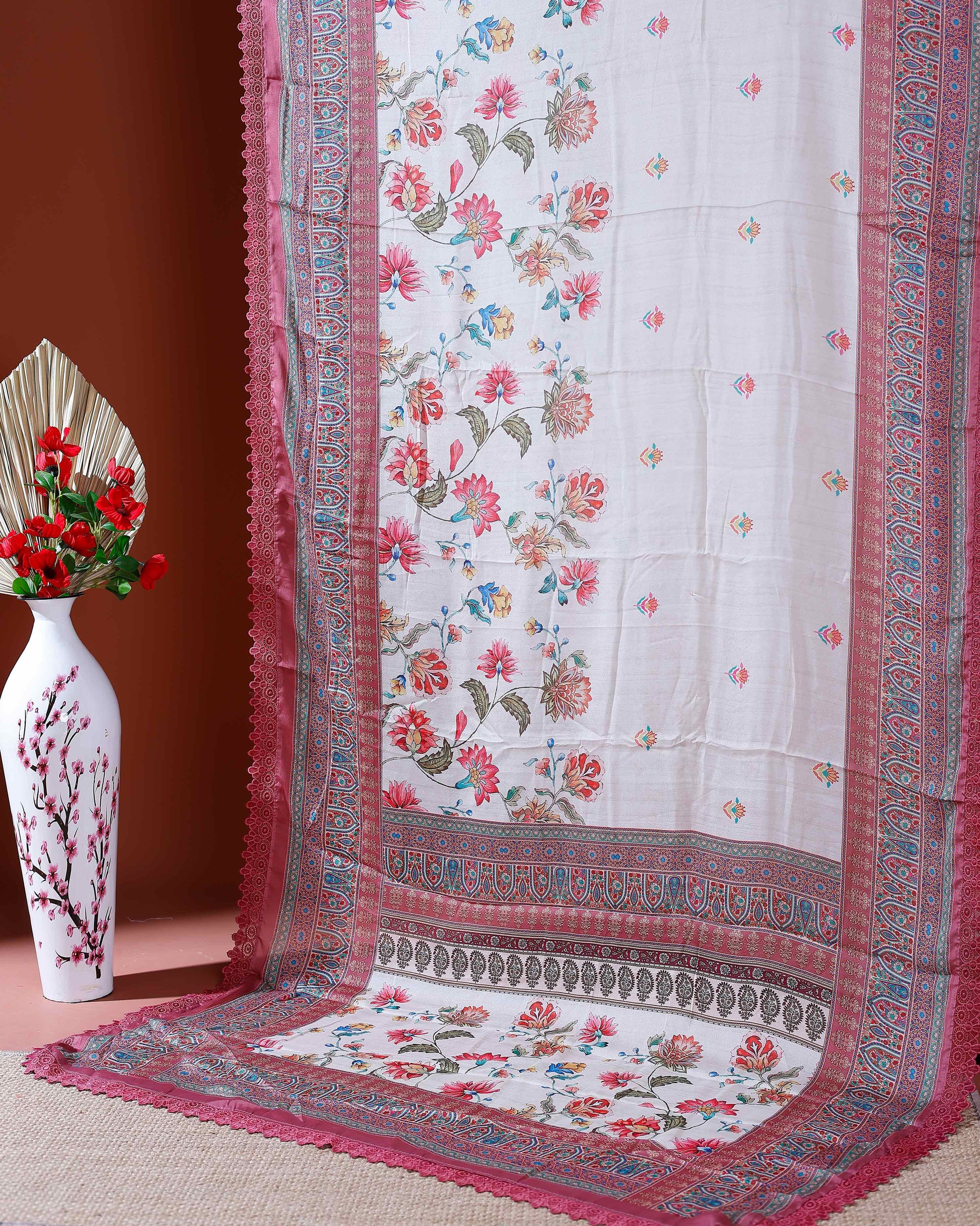 Elegant Georgette Saree with Intricate Floral Embroidery and Traditional Patterned Border - Cream