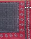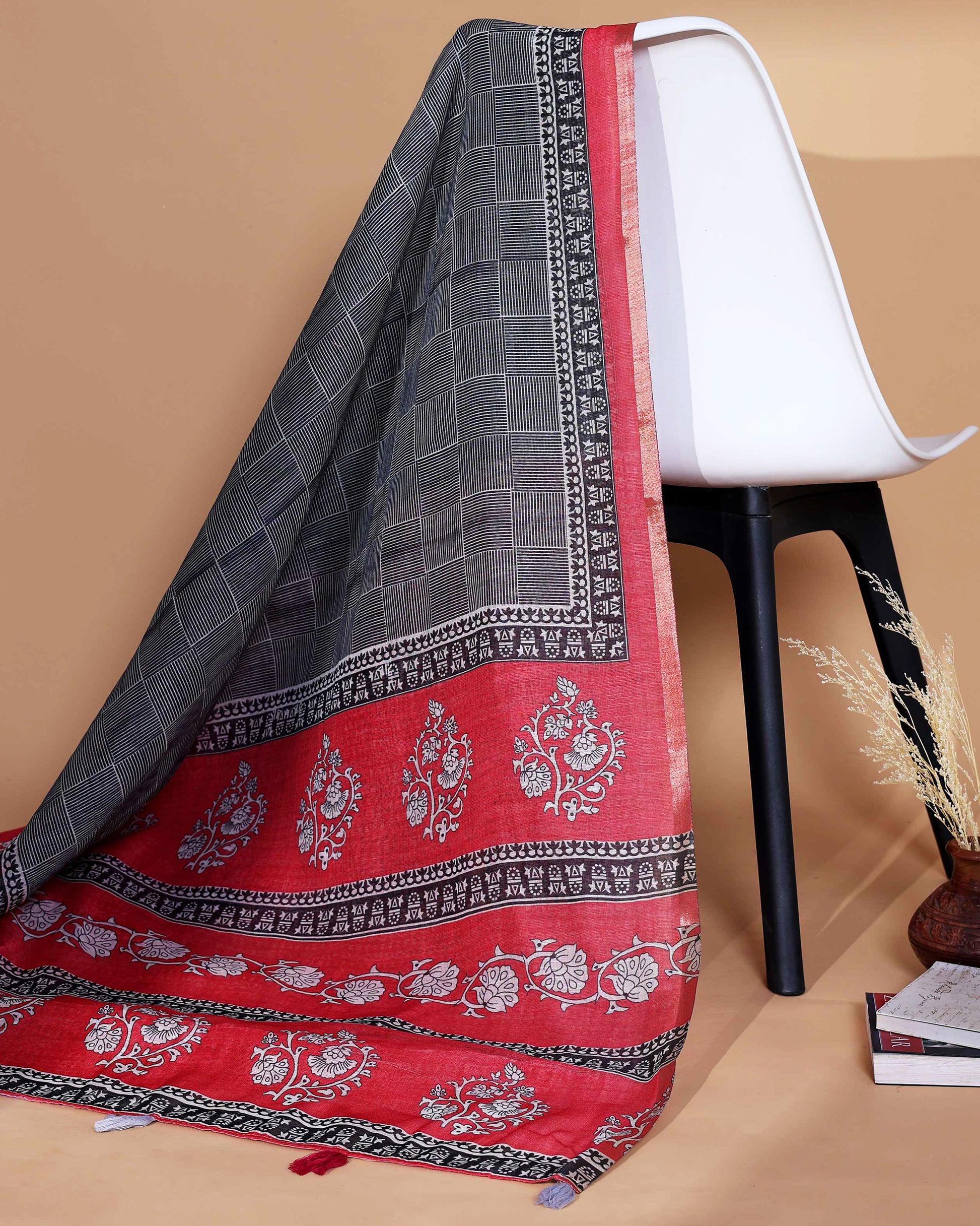 Elegant Grey and Red Linen Saree with Checked Body, Intricate Floral Motifs and Contrast Woven Border