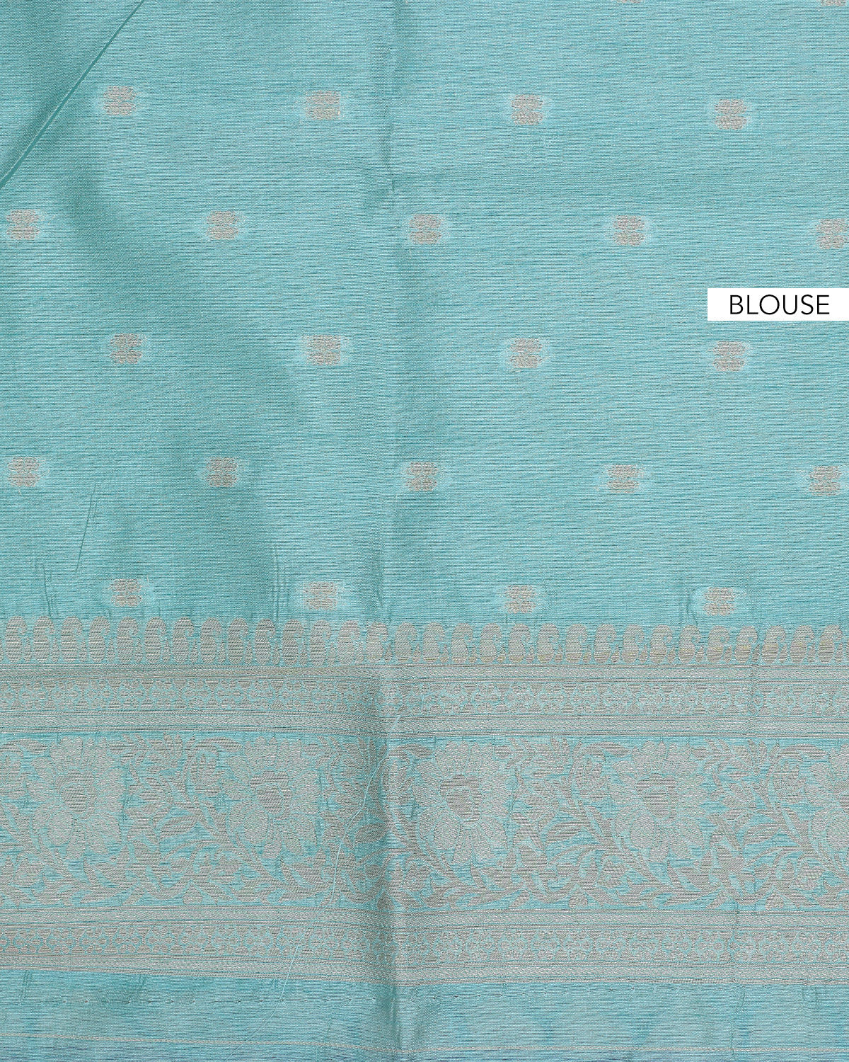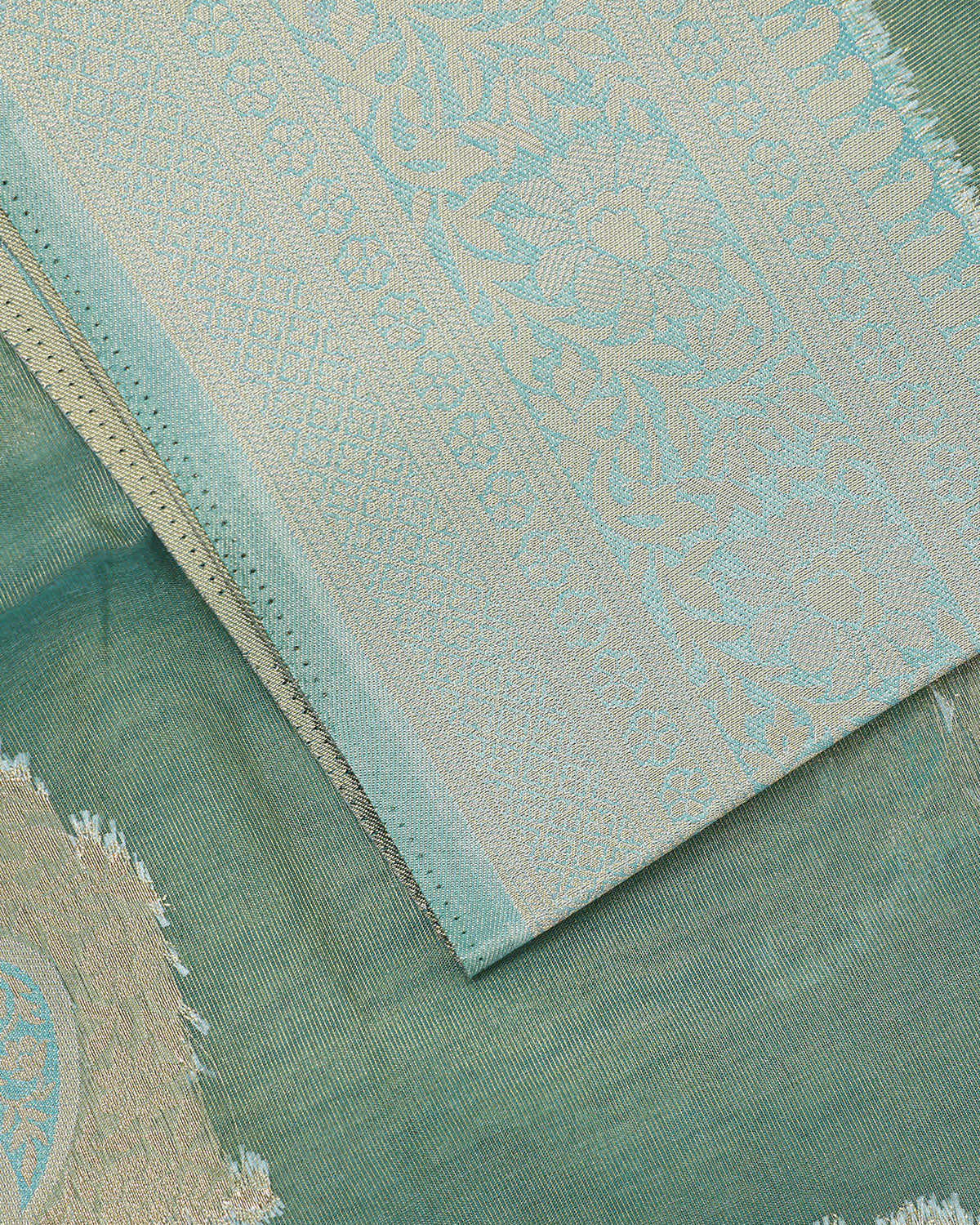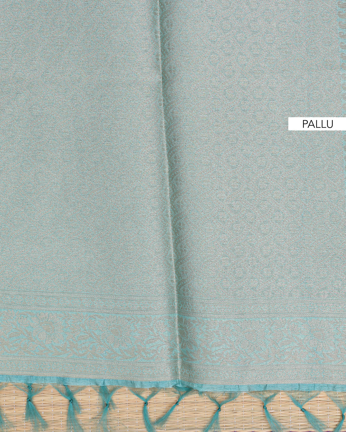 - This elegant tissue saree a refreshing mint green body adorned with subtle zari motifs.