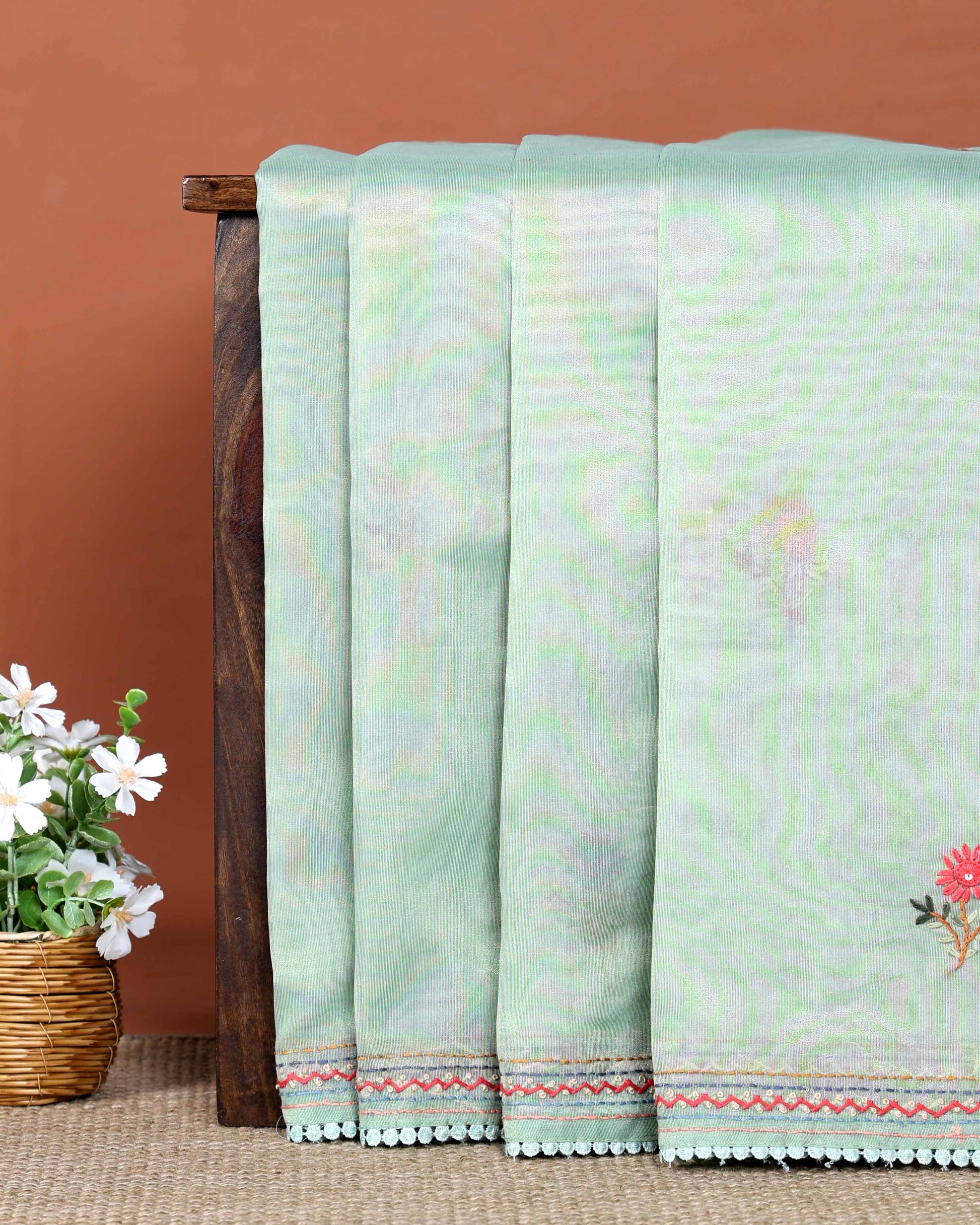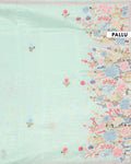 - Crafted from a lightweight Tussar fabric this elegant Green saree delicate floral motifs for a timeless appeal.