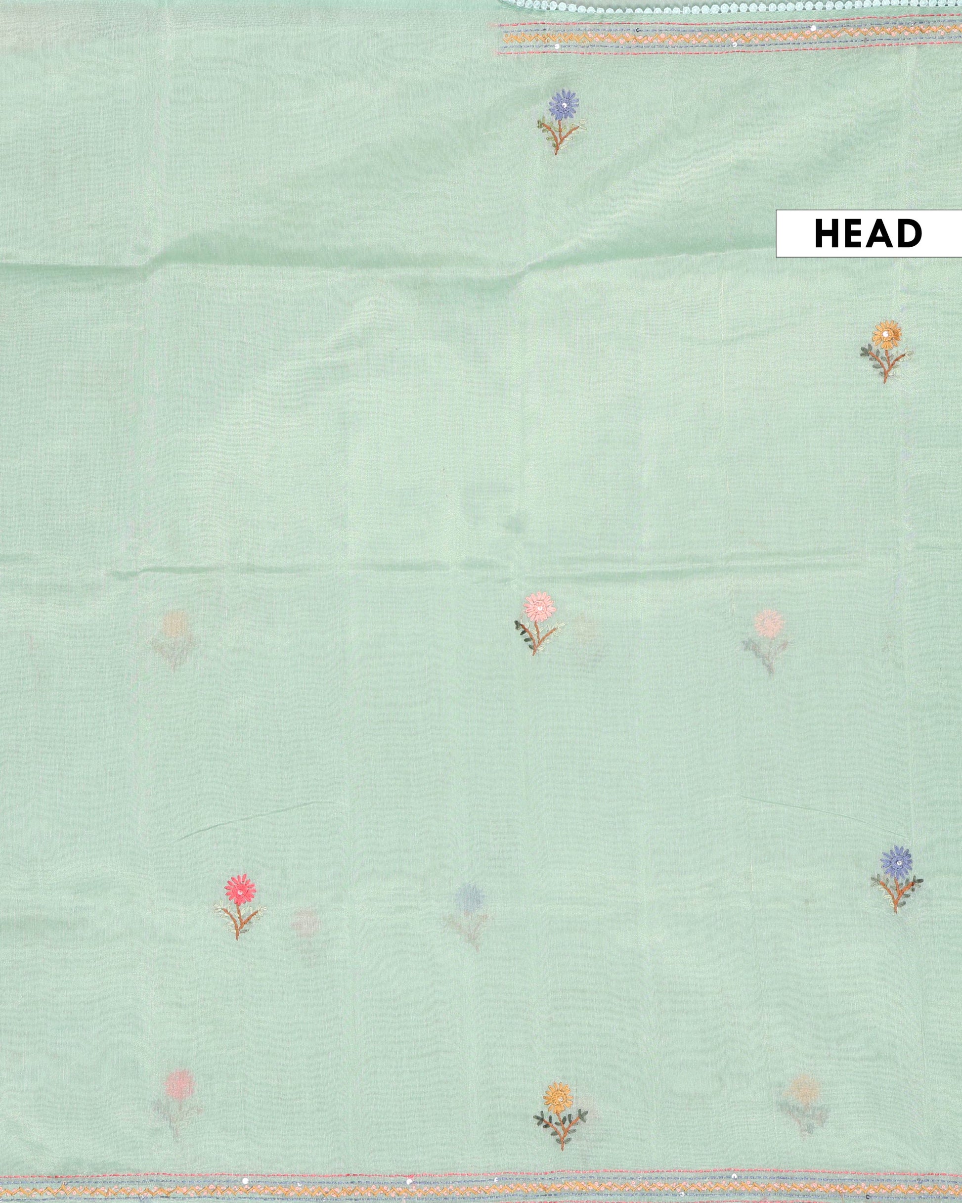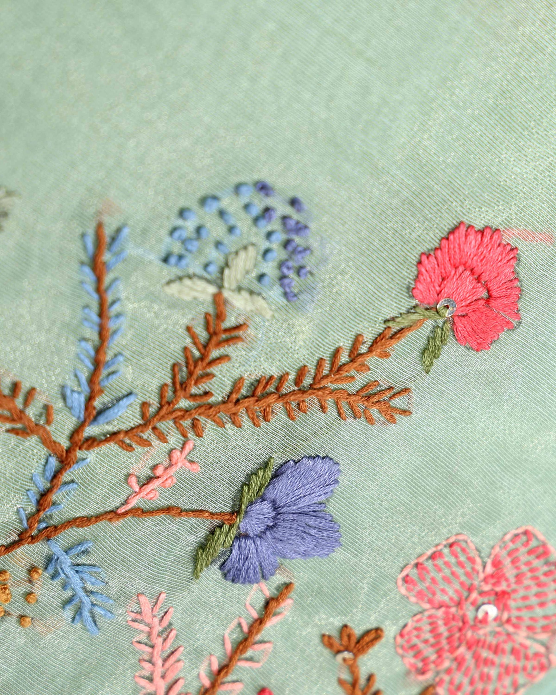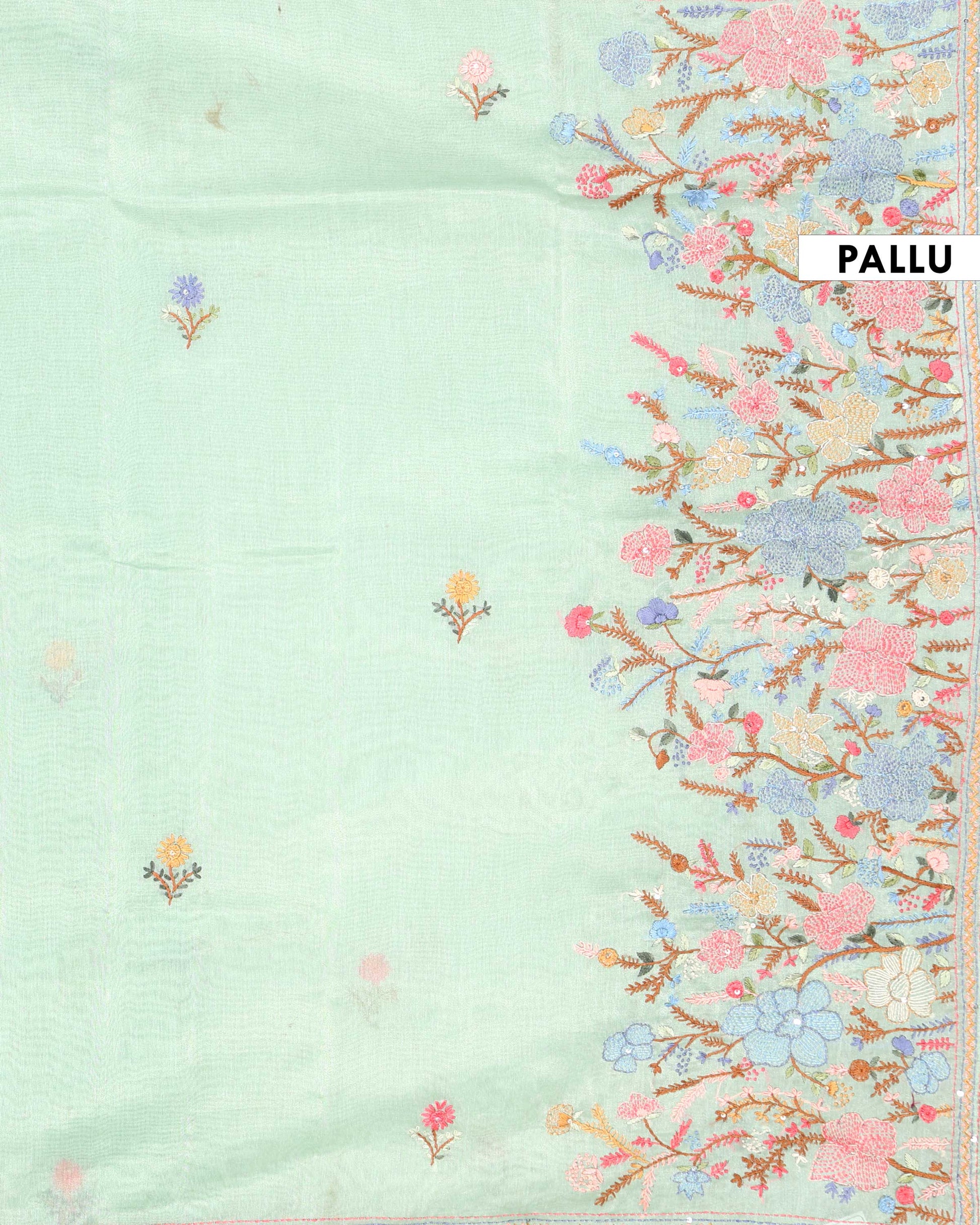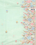 Elegant Hand Embroidered Kantha Work Saree with Delicate Floral Motif and Embroidered Border - Green