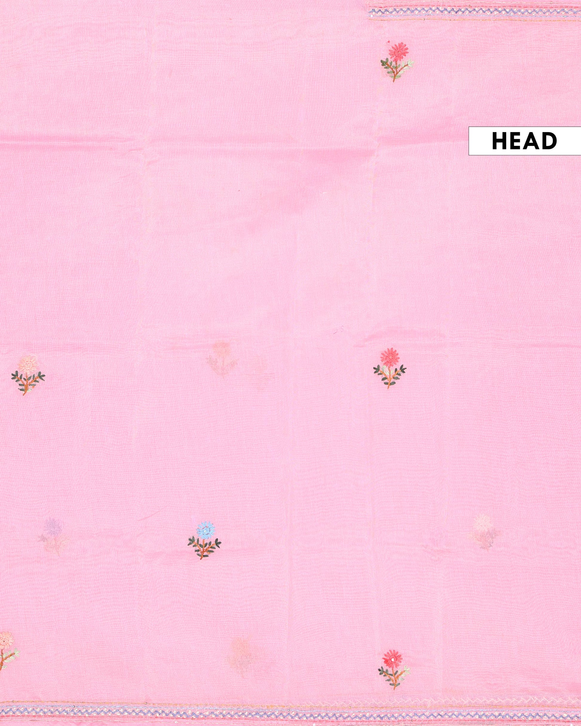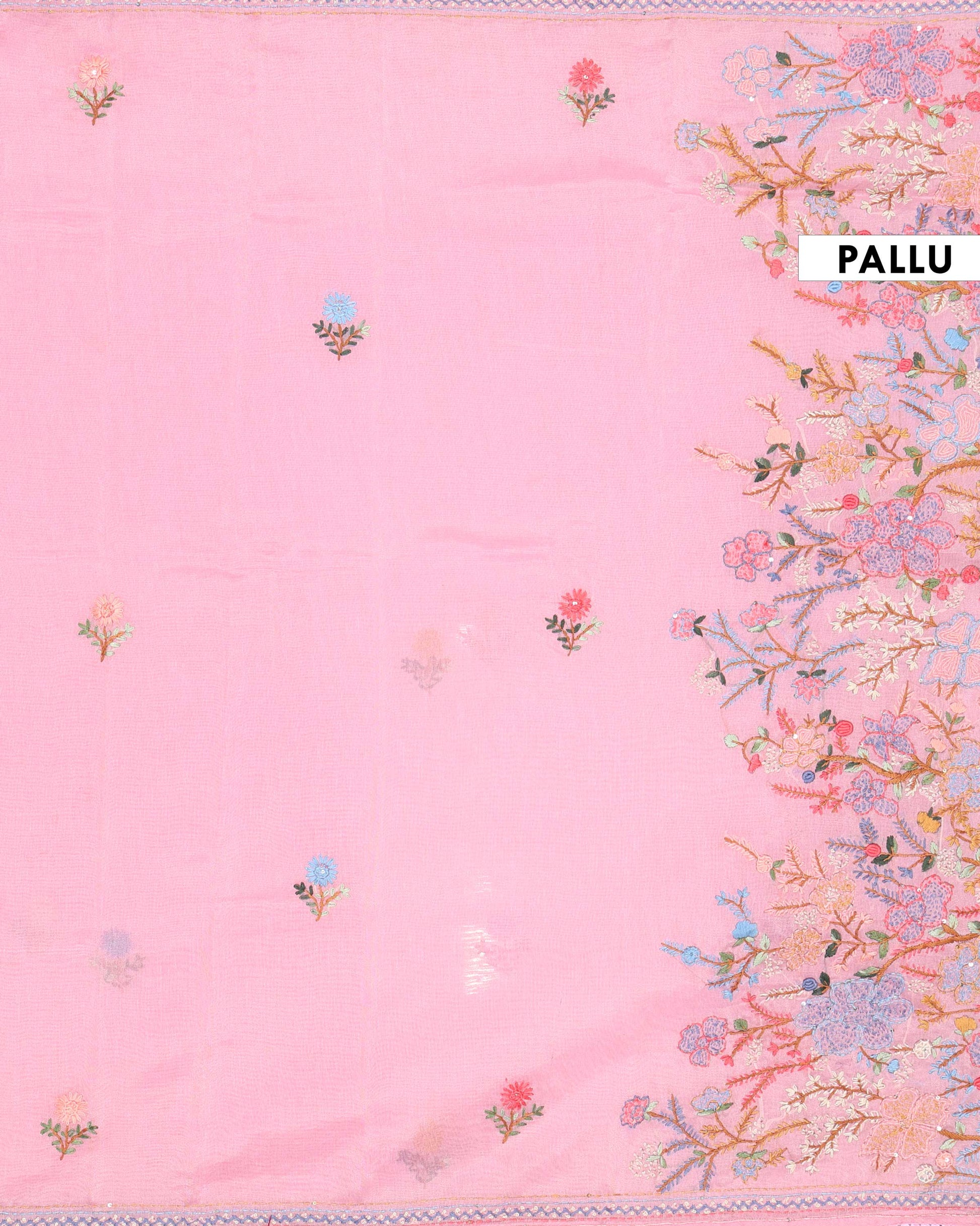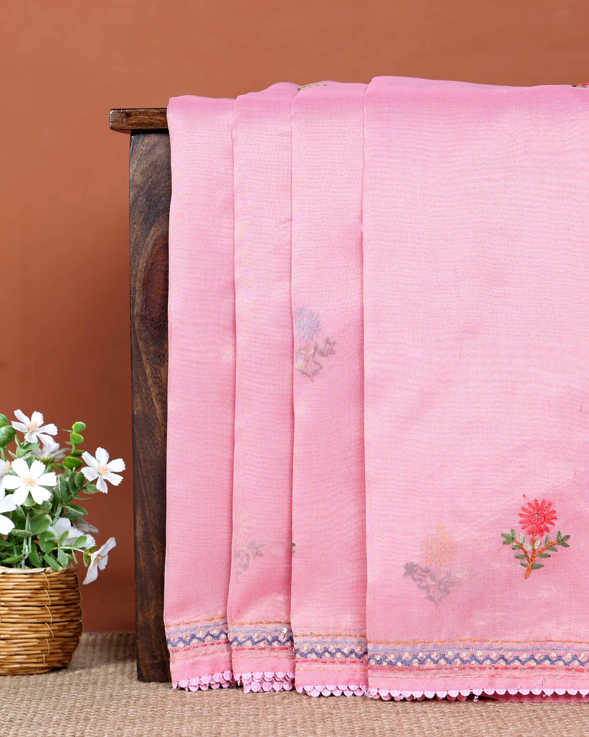 Elegant Hand Embroidered Kantha Work Saree with Delicate Floral Motif and Embroidered Border - Pink