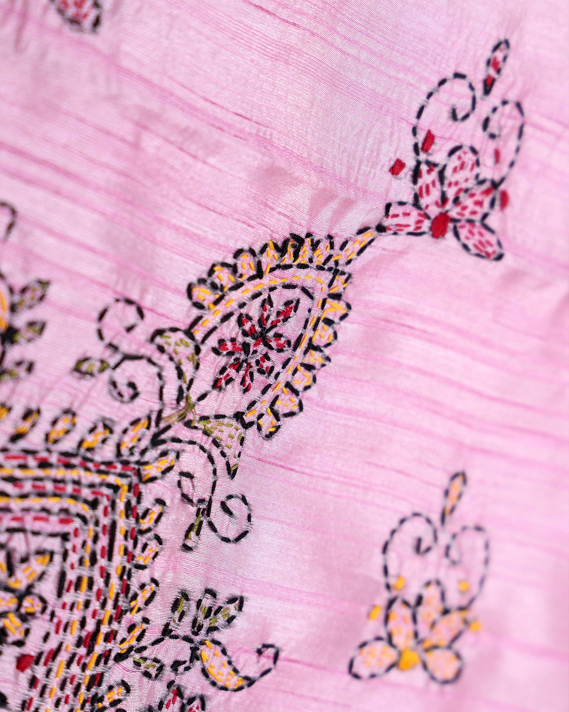 - This stunning pink Kantha work saree intricate colorful hand stitched floral and traditional motifs showcasing the rich heritage of unique embroidery craft.