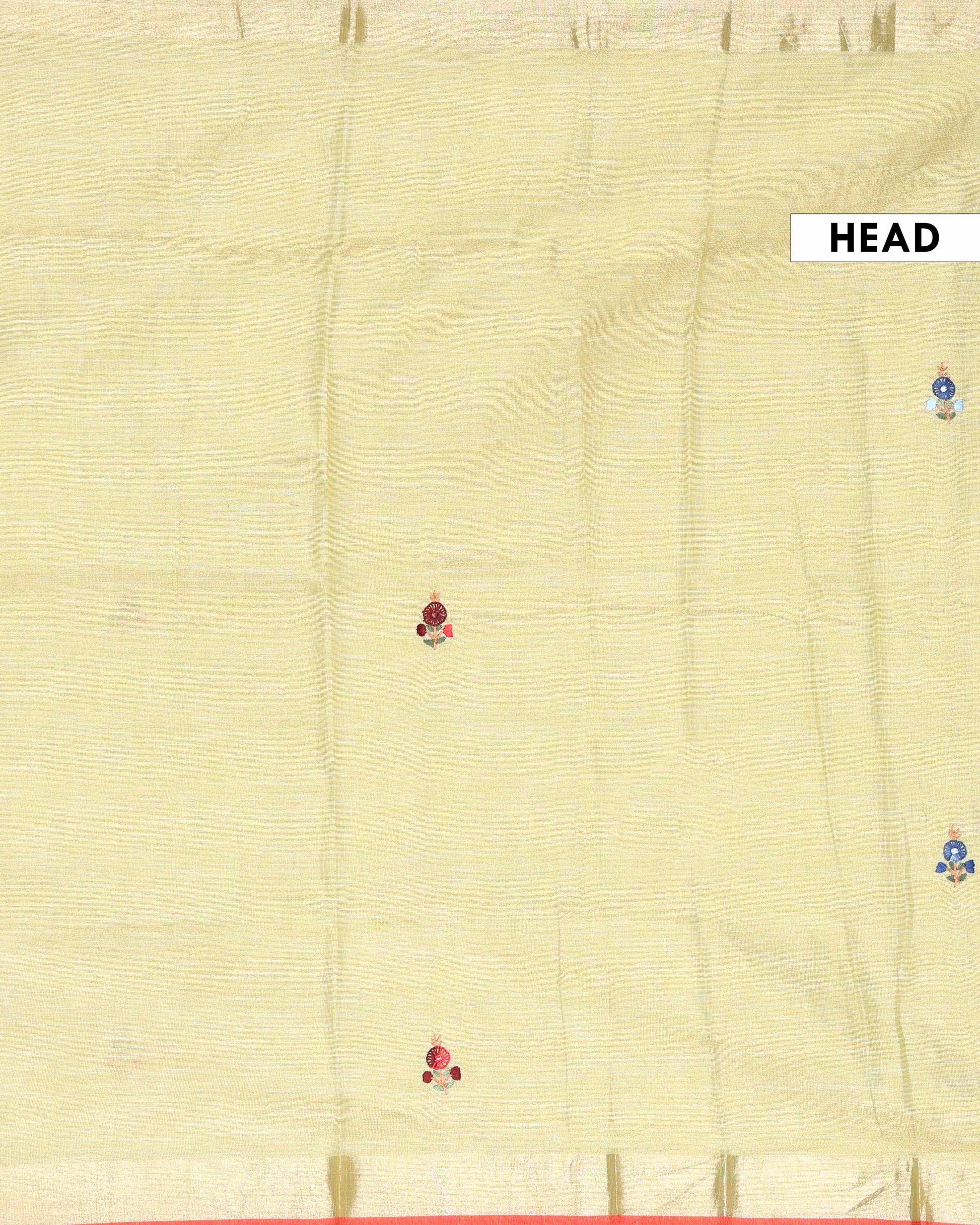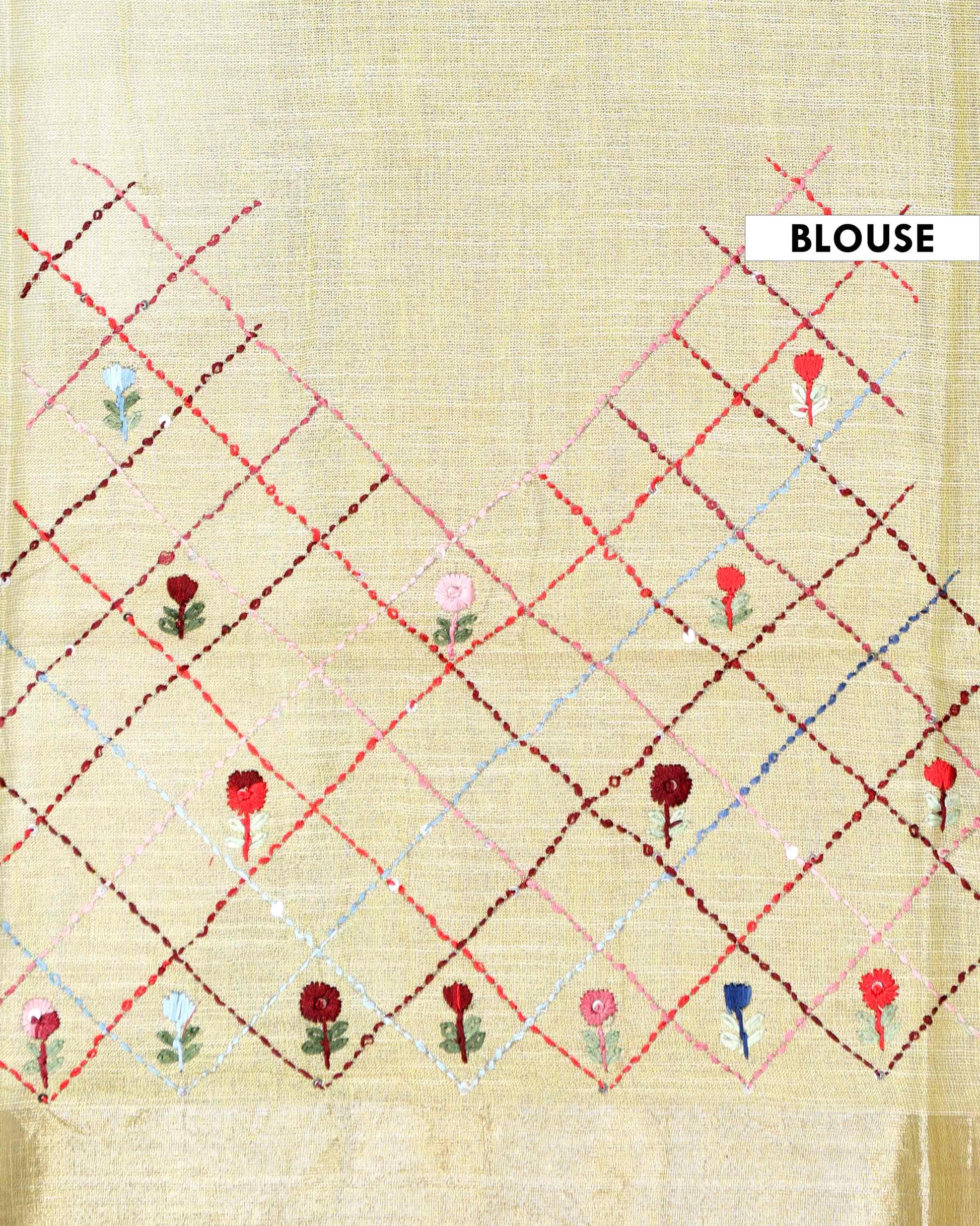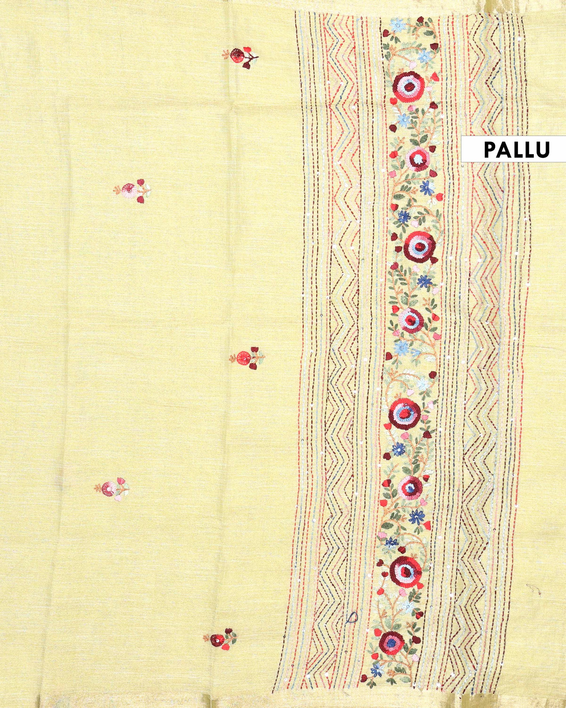 - This elegant Light Green Kantha Work Saree delicate floral Kantha embroidery and a distinct red and gold zari border, blending traditional artistry with contemporary style