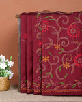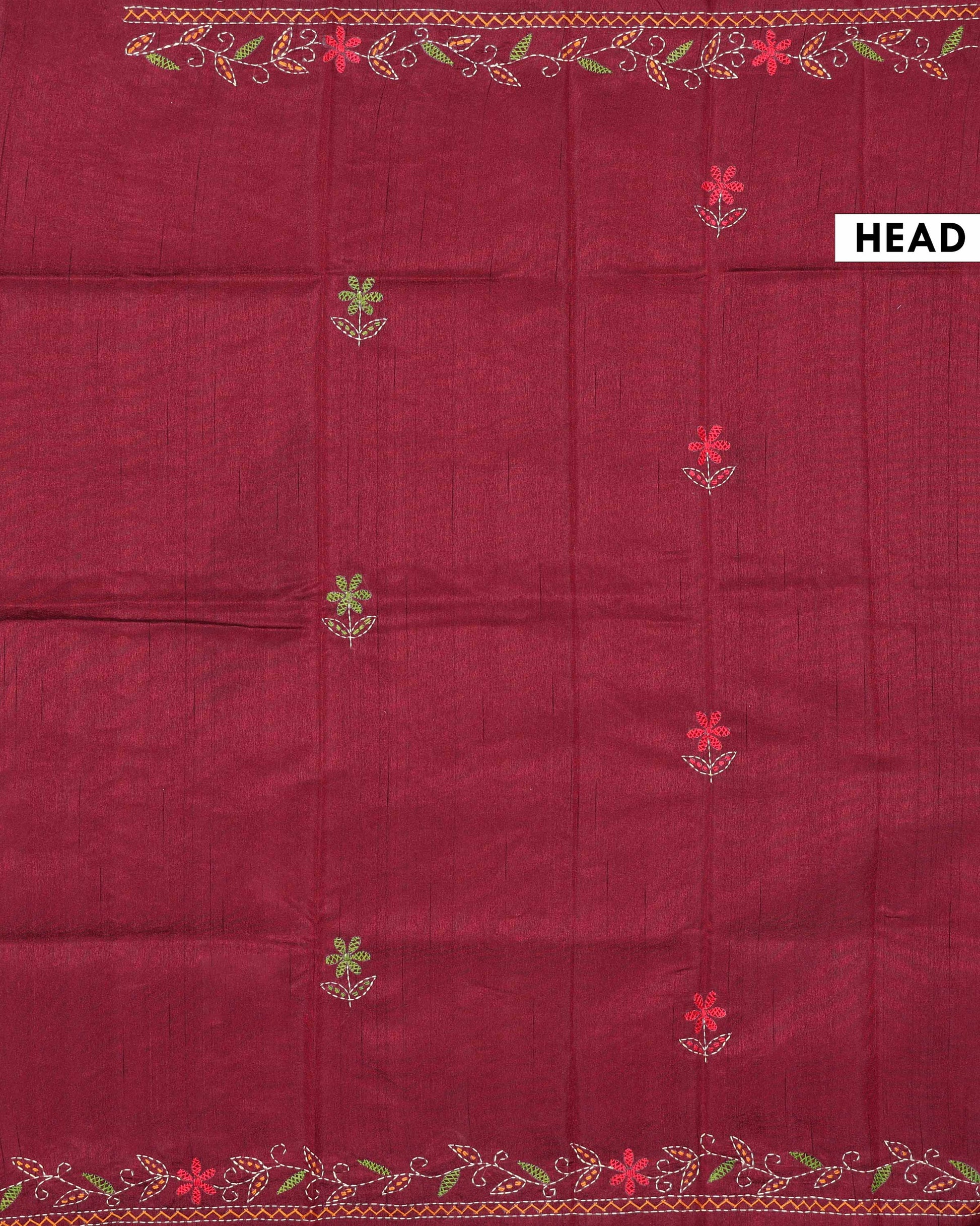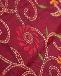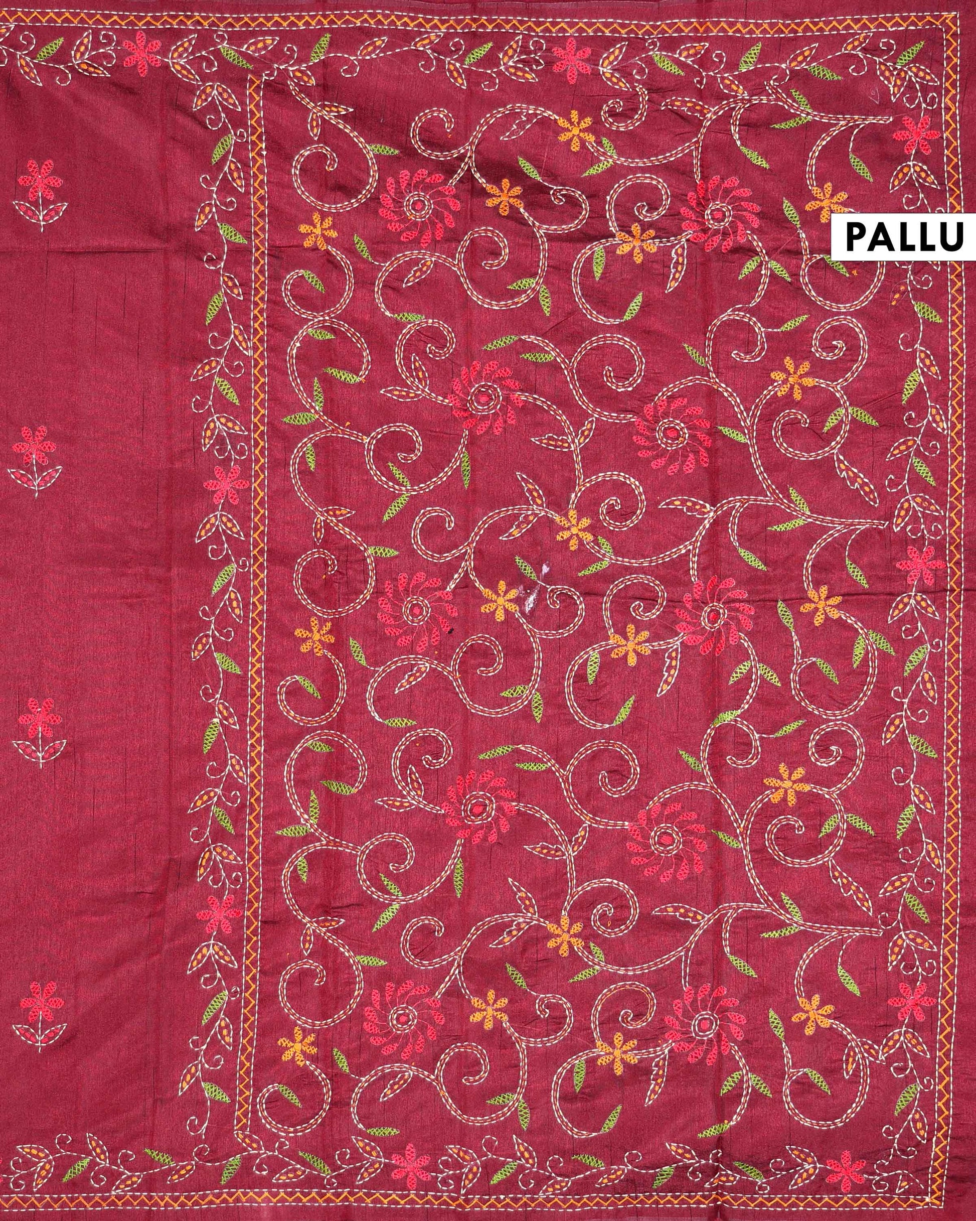 Adorned with intricate hand stitched Kantha embroidery this deep maroon saree blends traditional artistry with a versatile, elegant style perfect for any occasion.
