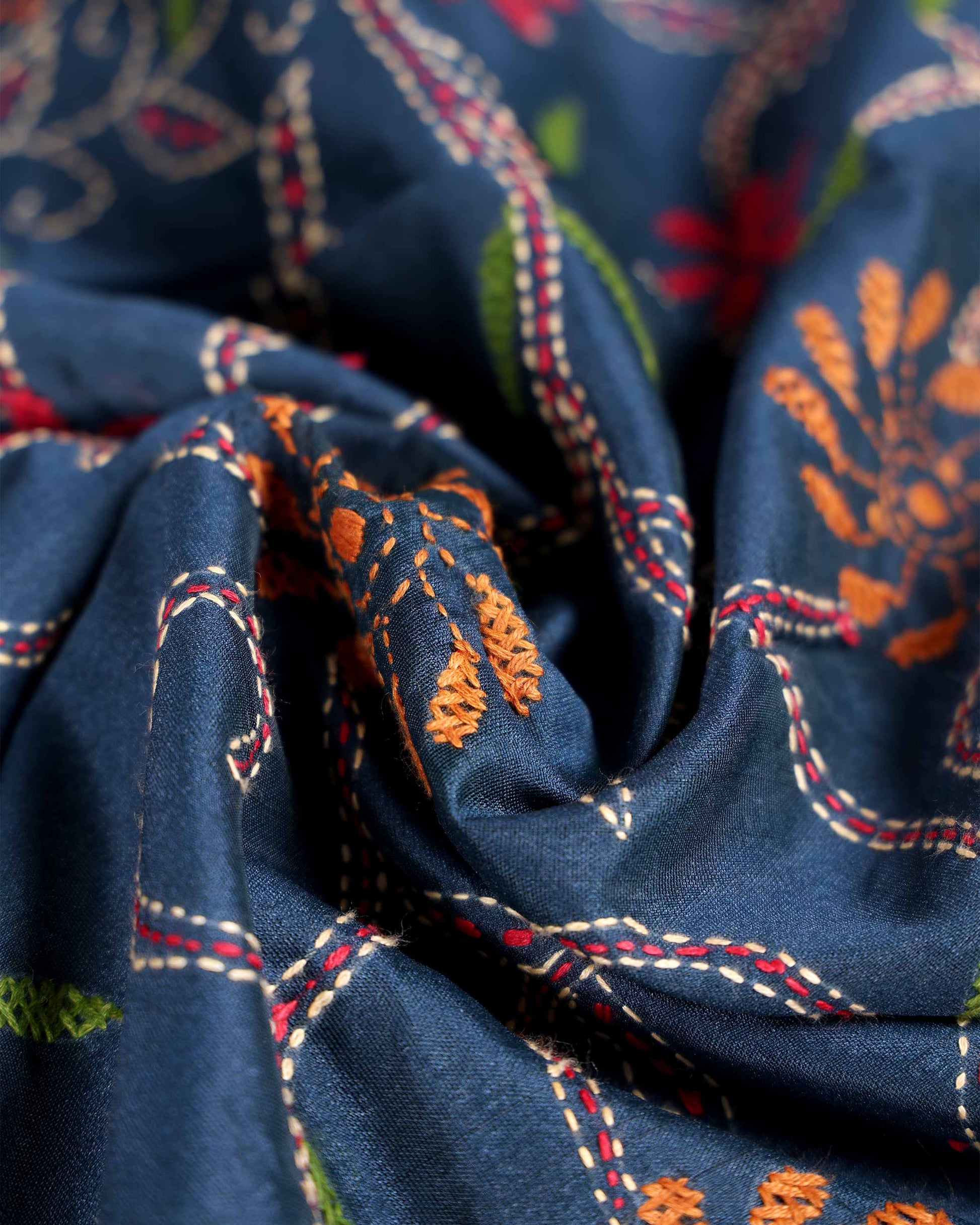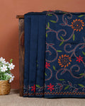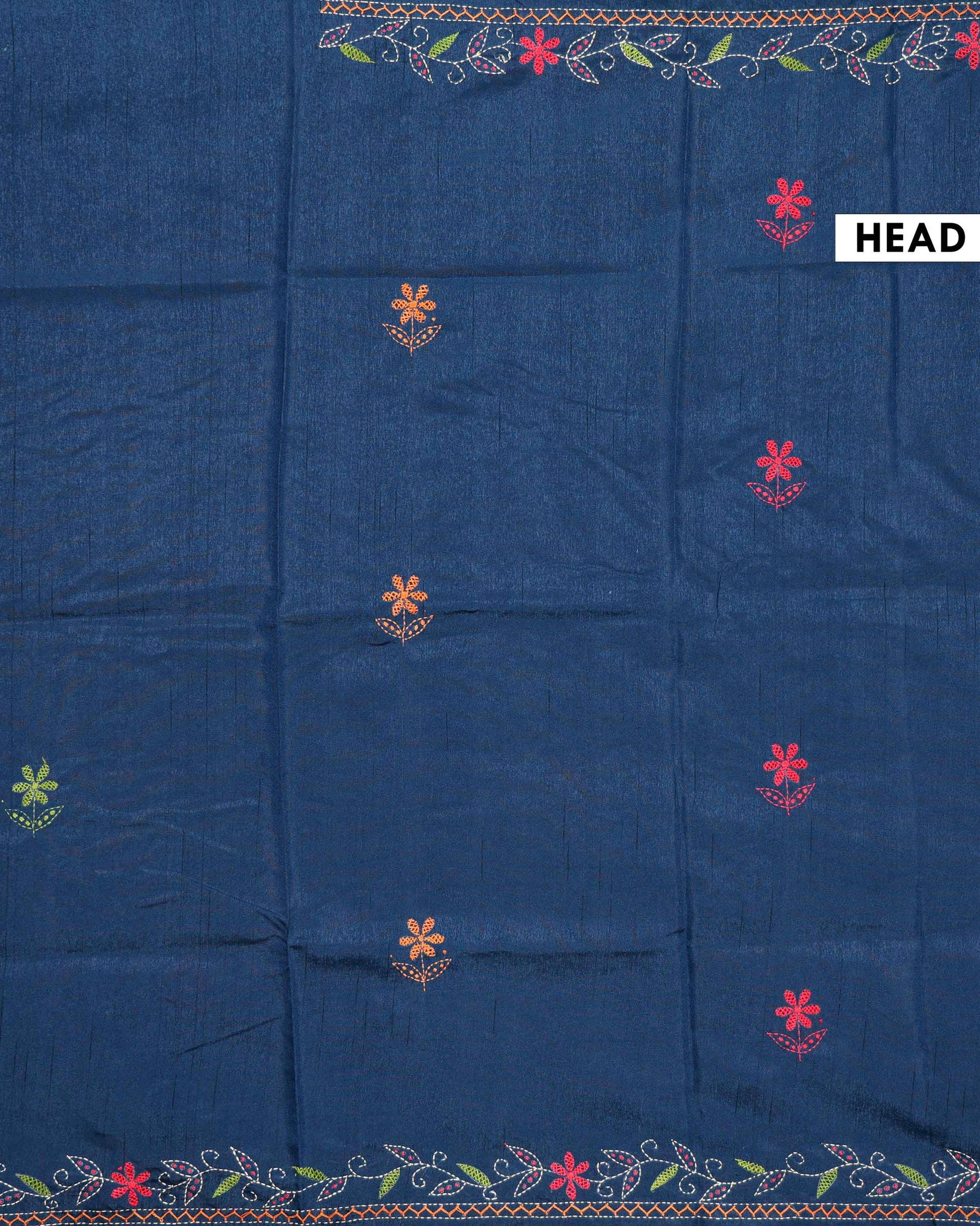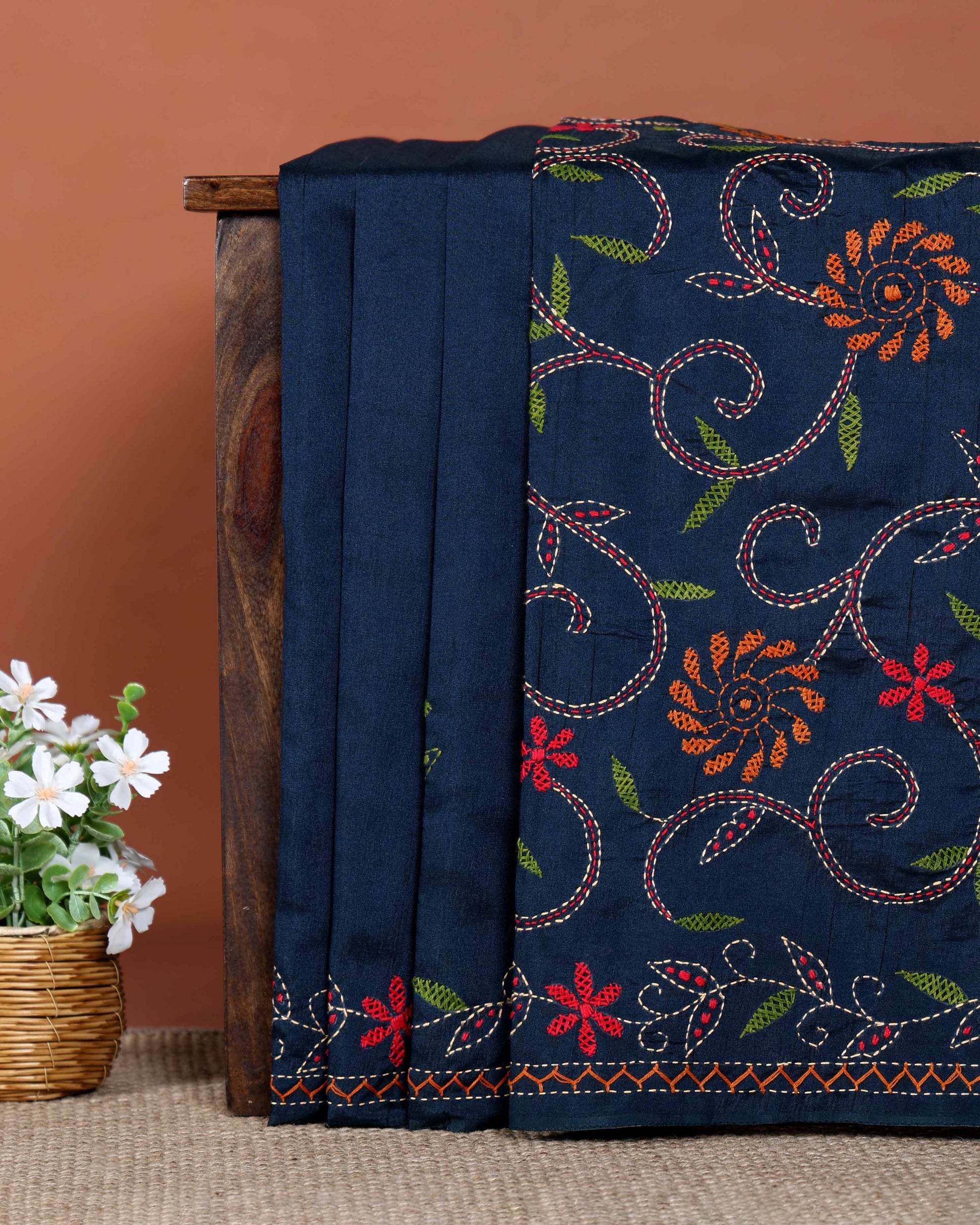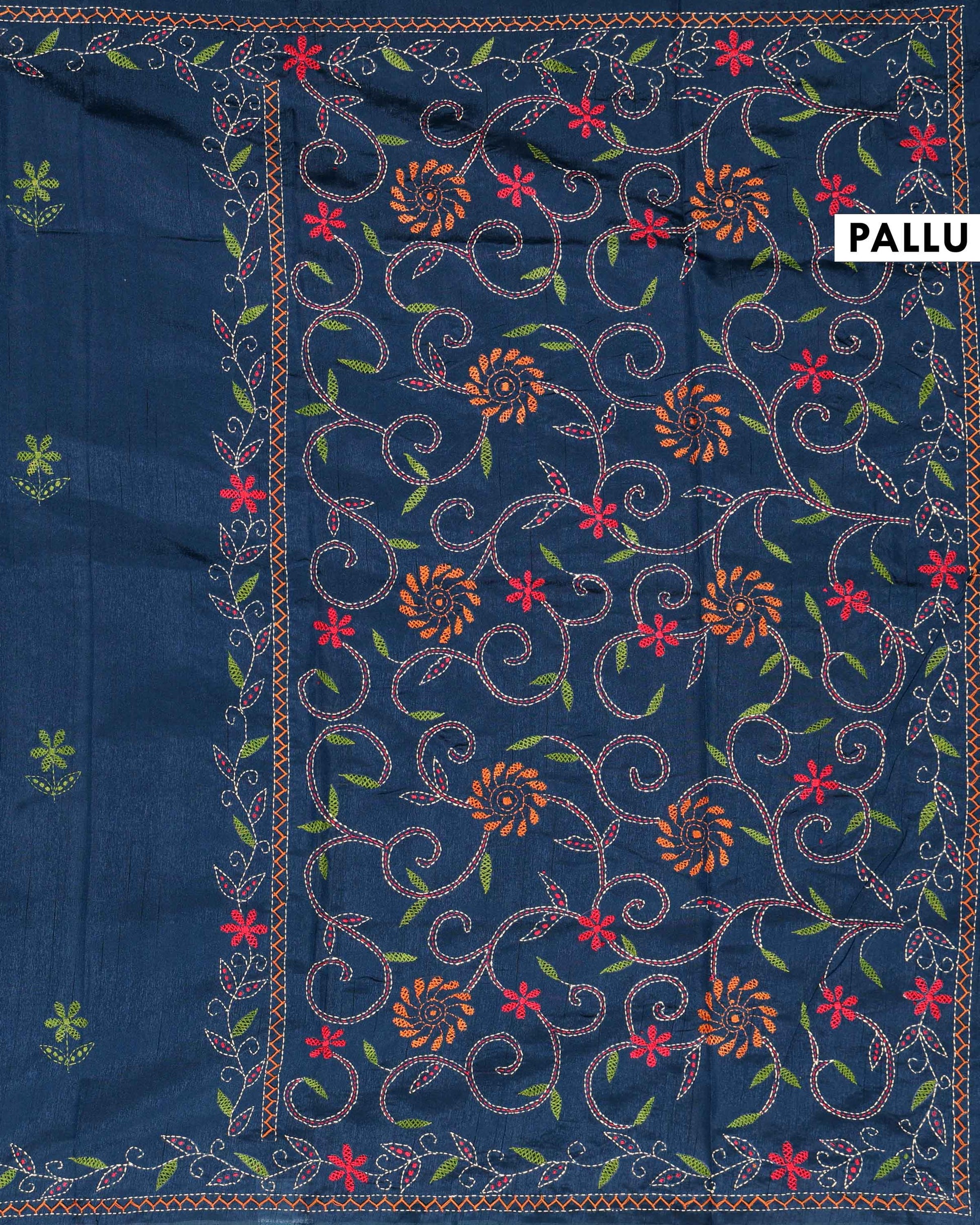 - This stunning Teal blue Kantha work saree intricate colorful hand embroidered floral motifs showcasing the delicate artistry and traditional running stitches