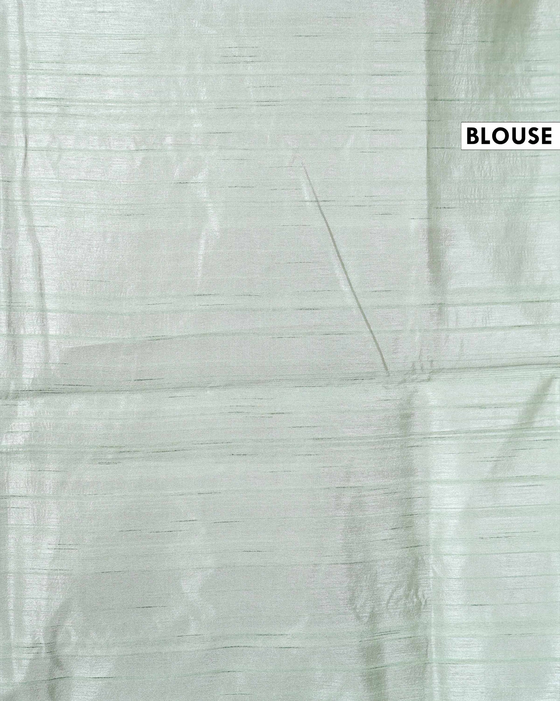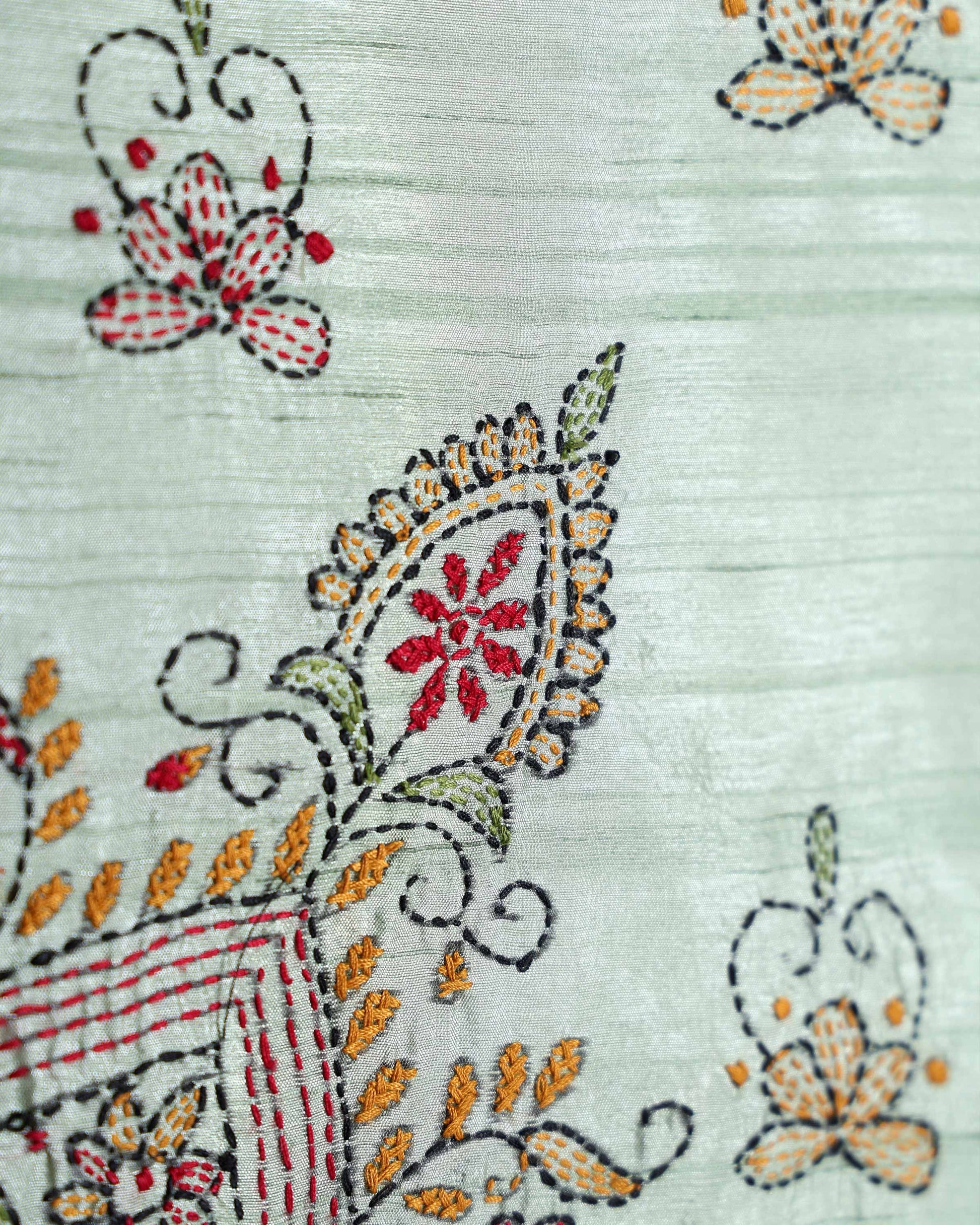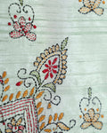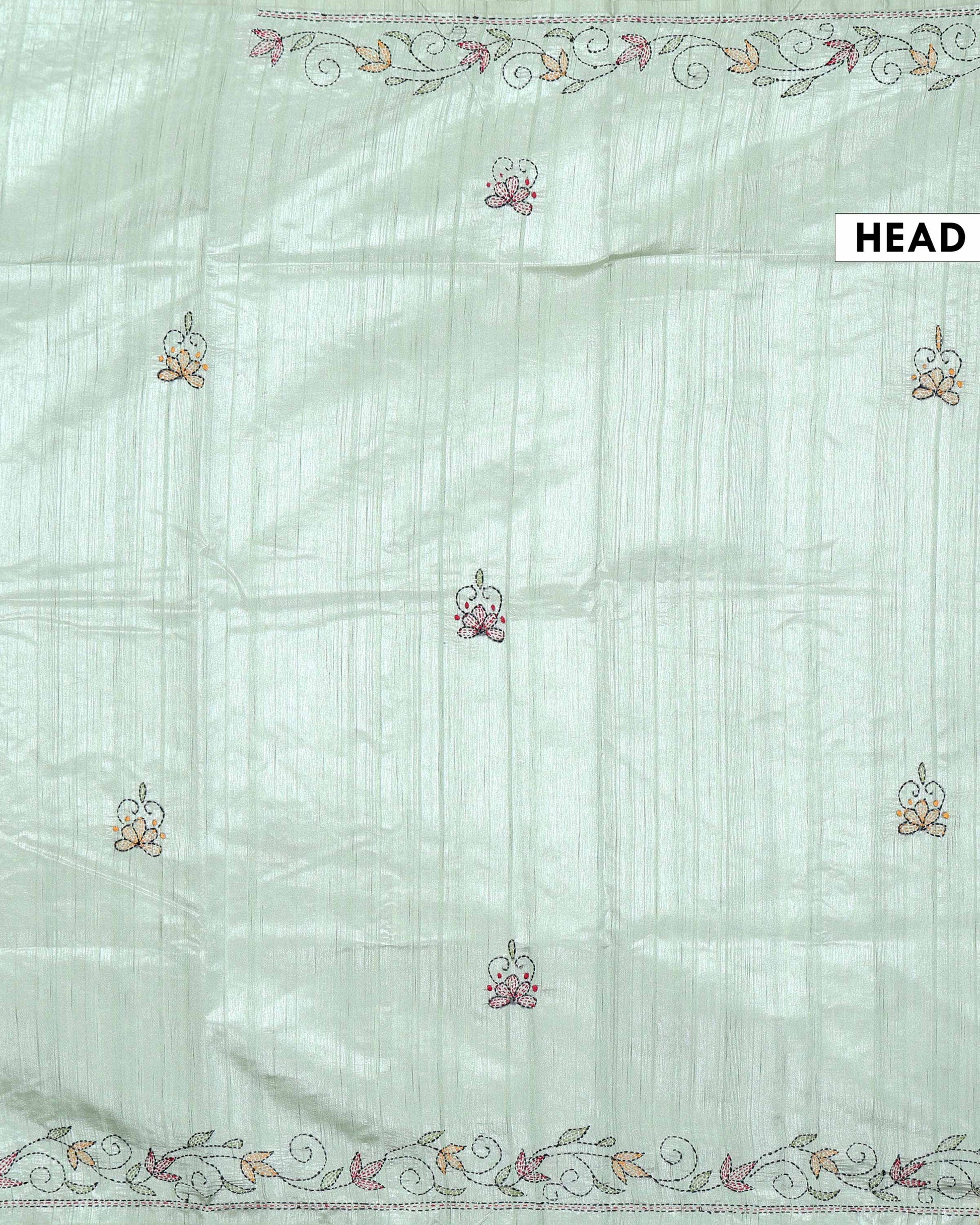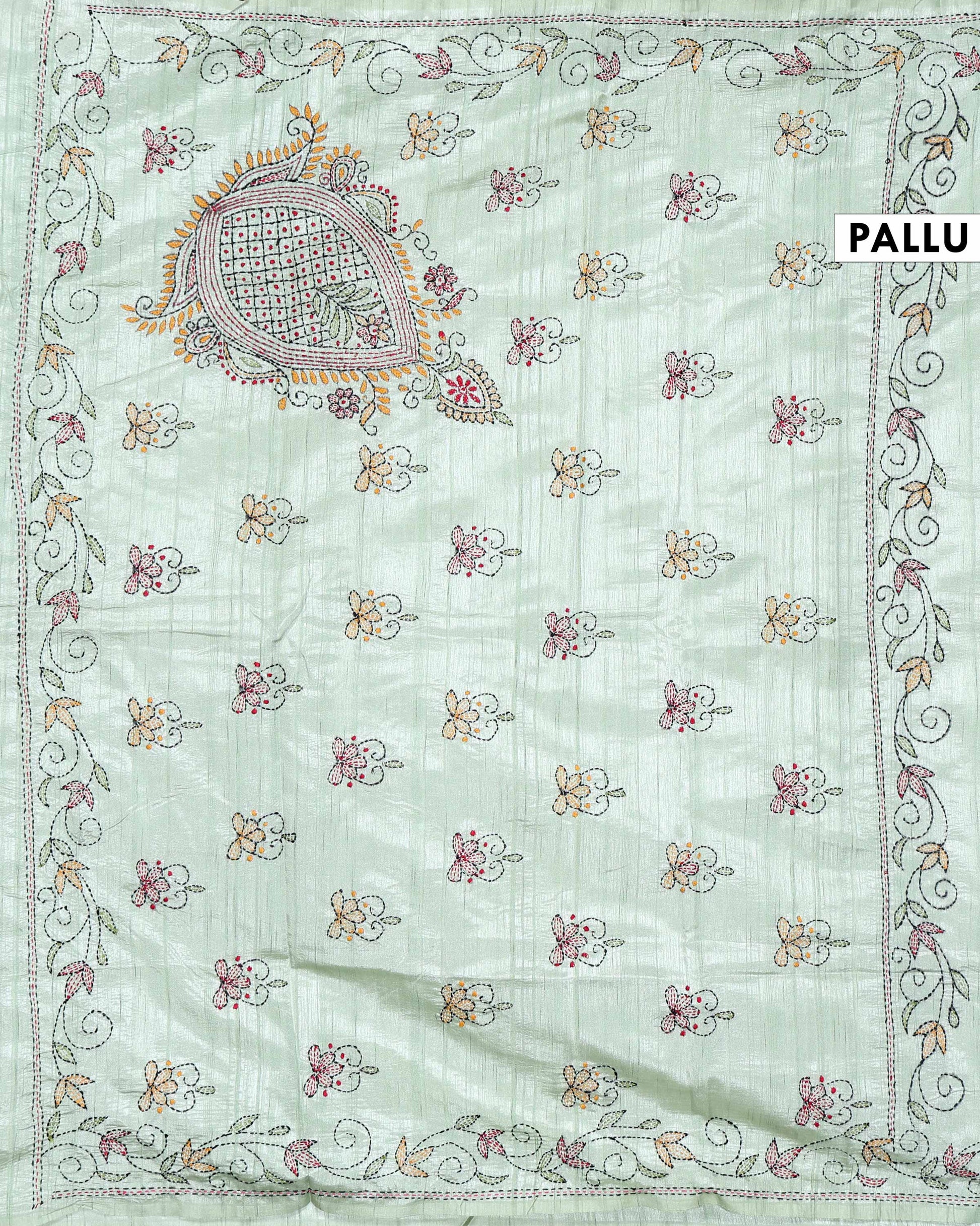 - An elegant Light Green Kantha work saree intricate vibrant hand embroidered floral and paisley motifs on a luxuriousTussar fabric