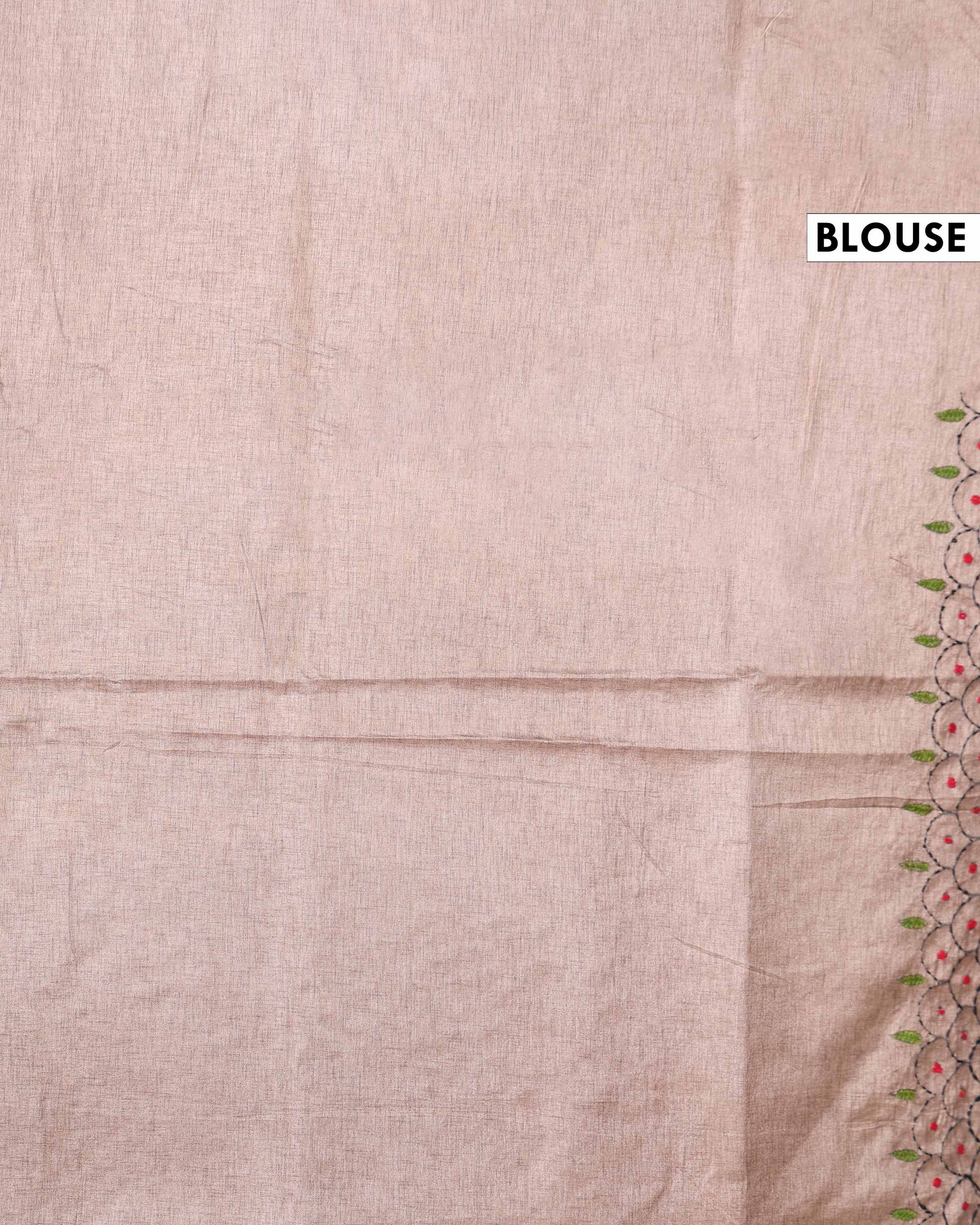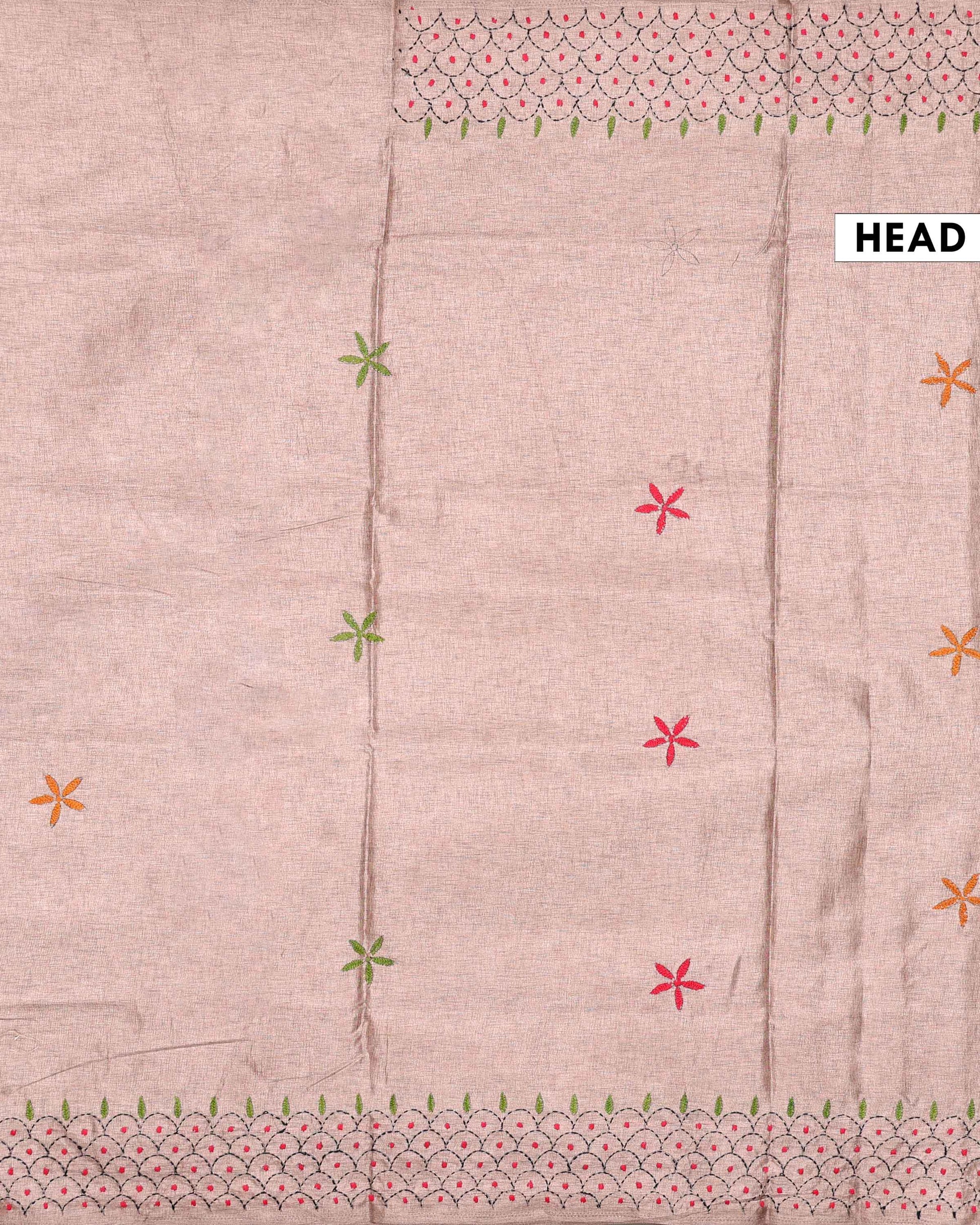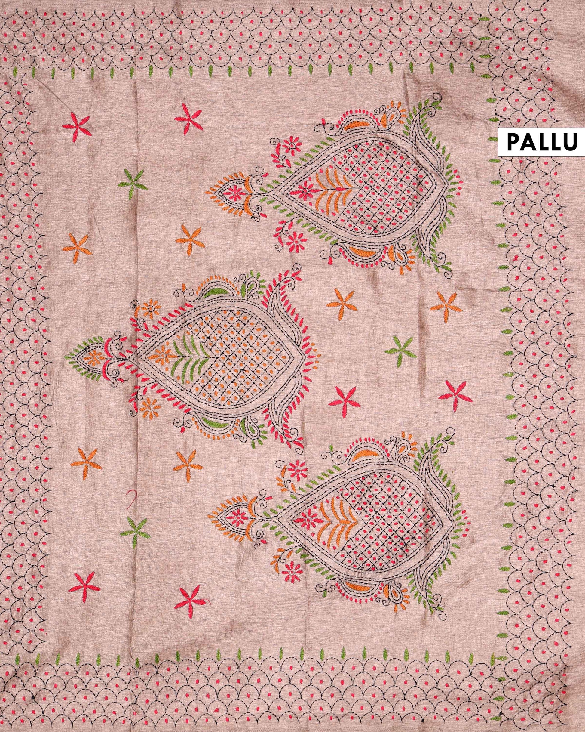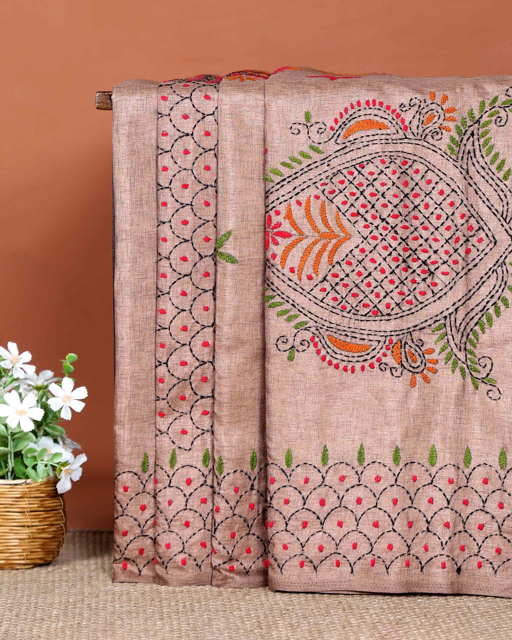 Elegant Hand Embroidered Kantha Work Tussar Saree with Intricate Fish Motif and Scallop Border - Sandal