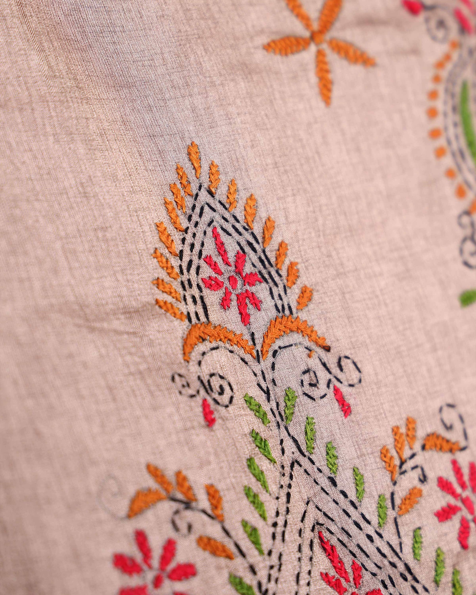 - This elegant Kantha stitch saree intricate hand embroidery with traditional motifs and a scalloped border perfect for cultural events and festive occasions