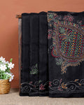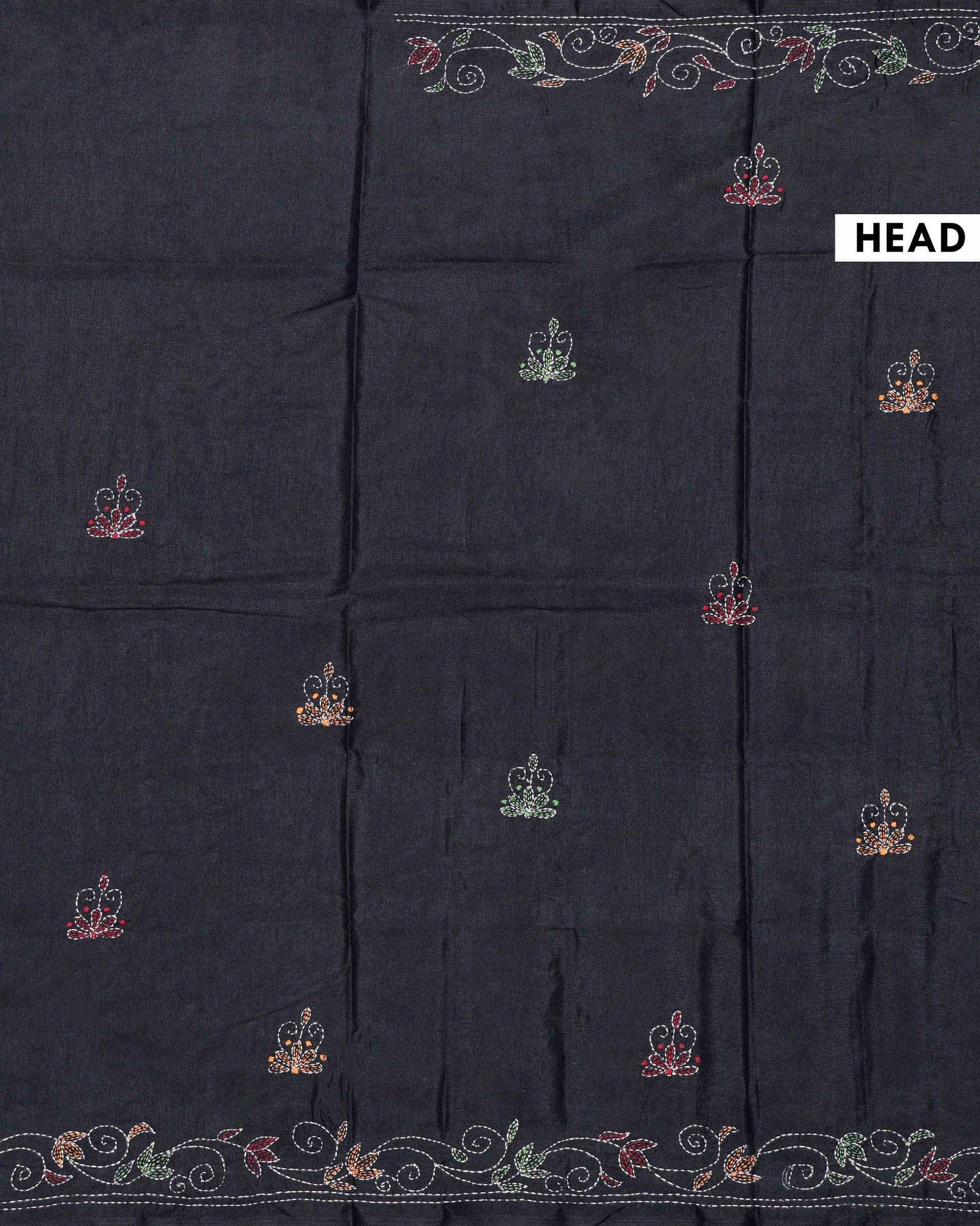 Elegant Hand Embroidered Kantha Work Tussar Saree with Intricate Floral and Paisley Motifs - Black