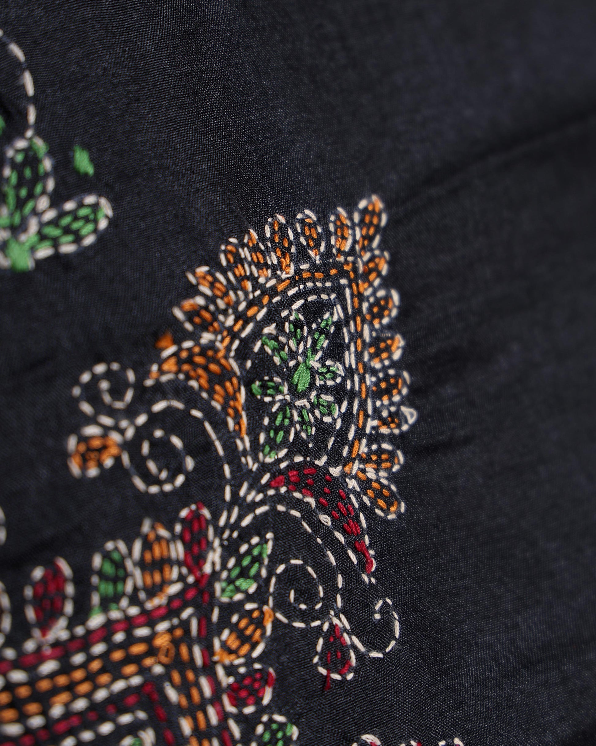 - This stunning black Kantha work saree intricate colorful hand stitched floral and traditional motifs showcasing the rich heritage of unique embroidery craft.