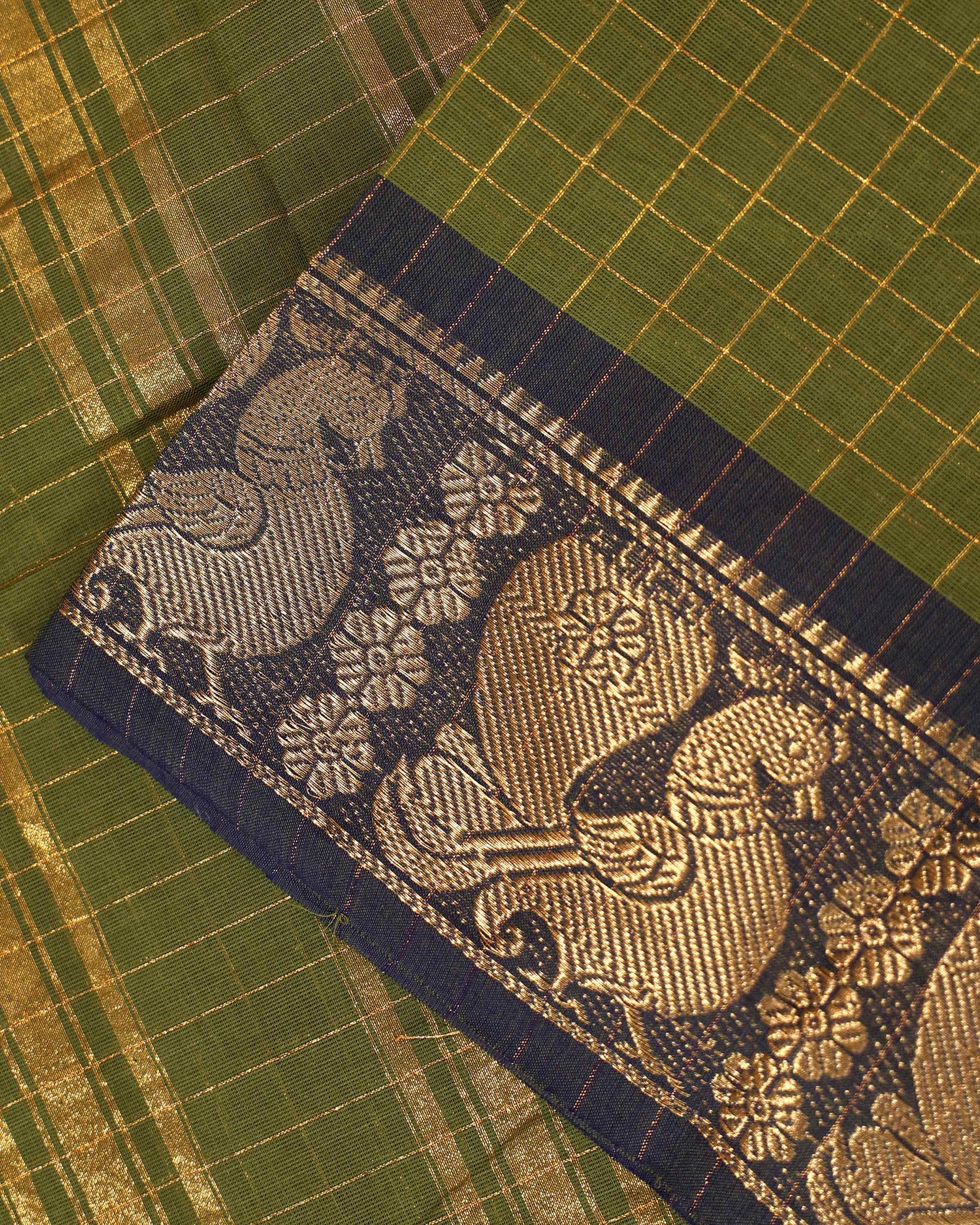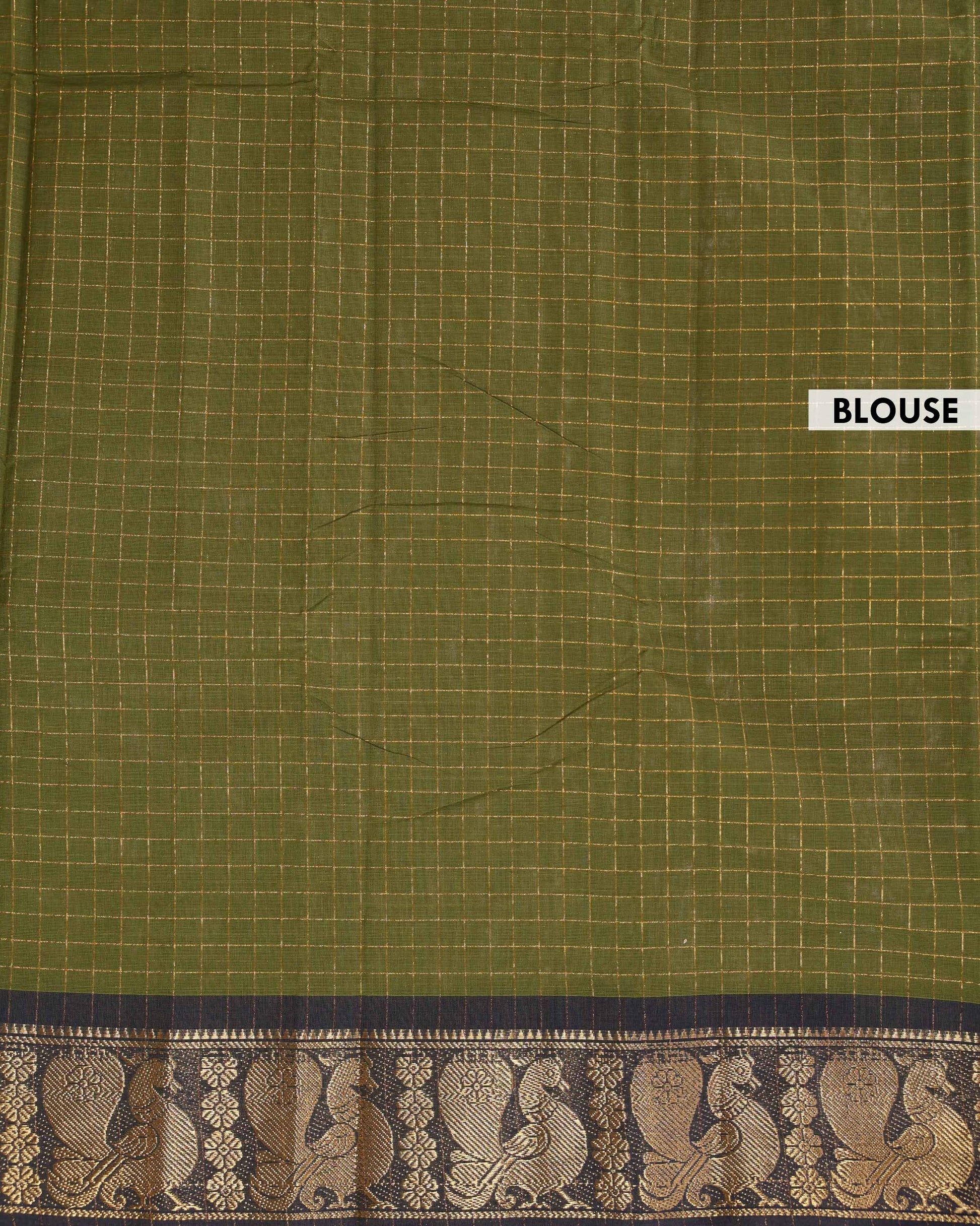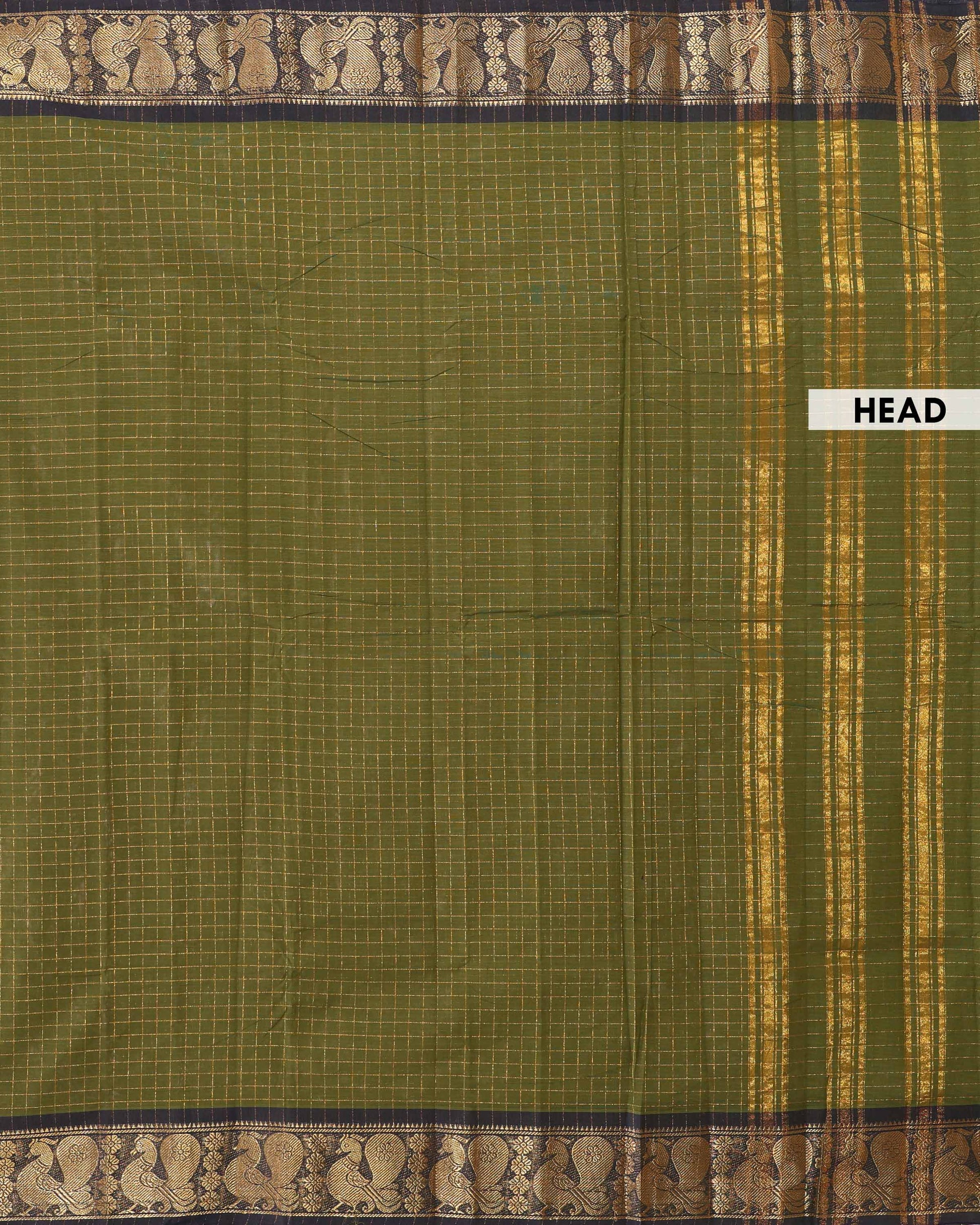 Elegant Handloom Chettinad Cotton Saree with Checked Body and Zari Woven Border - Green