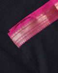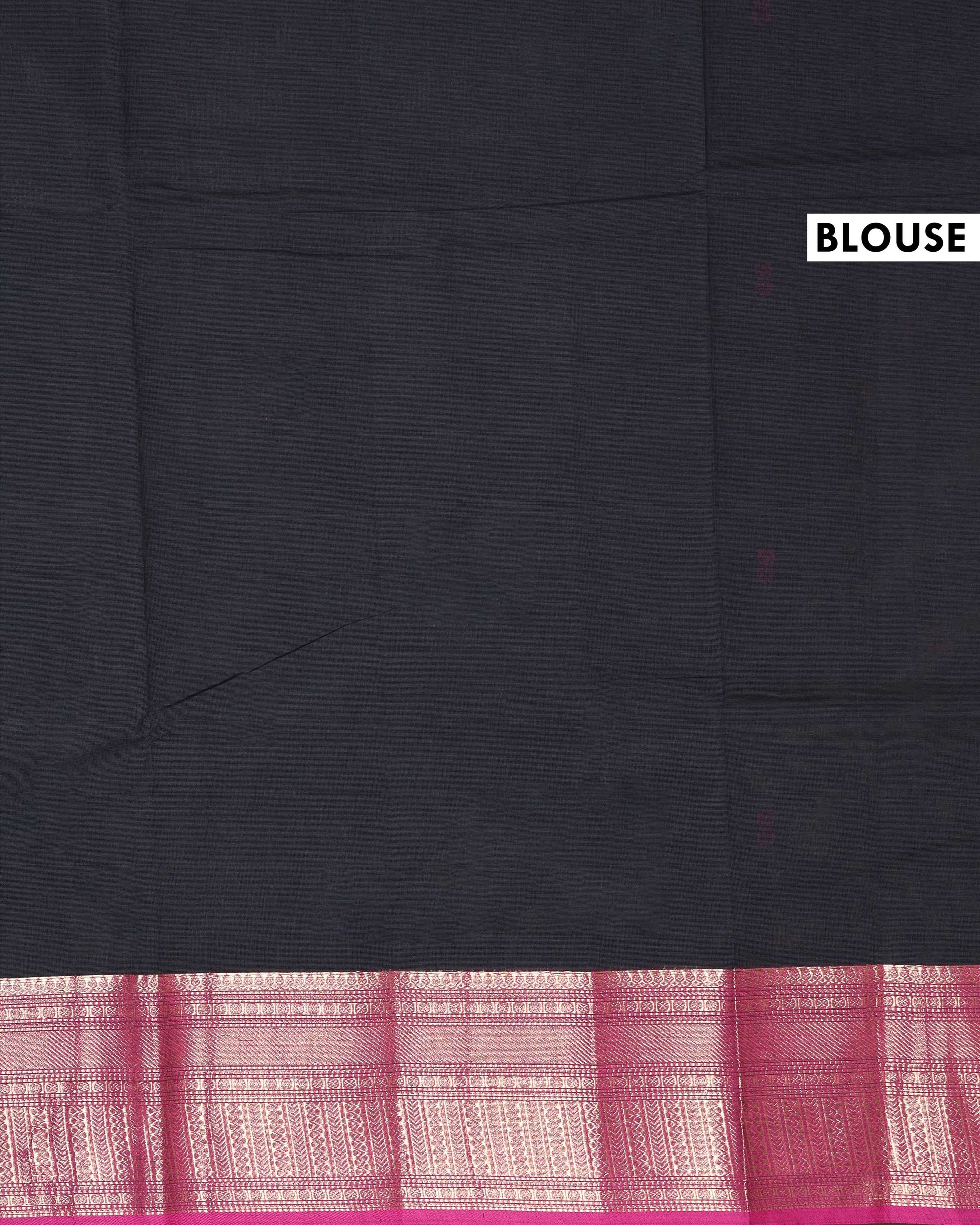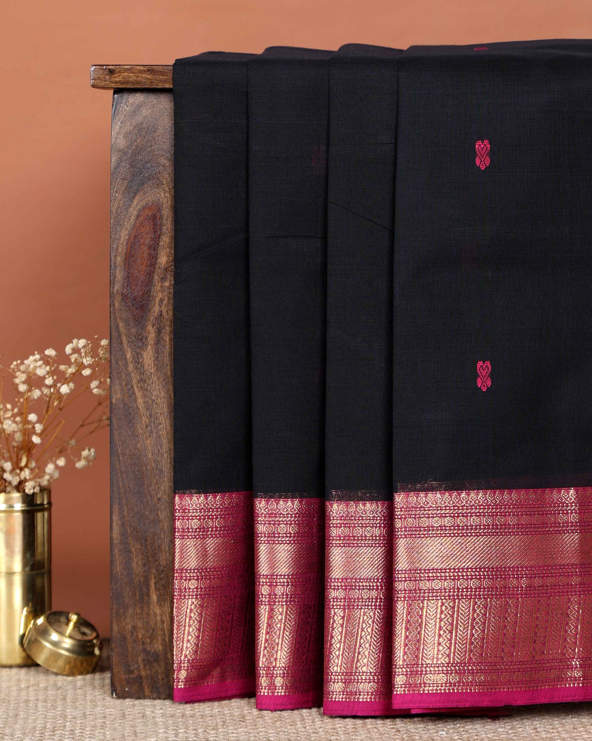- Elevate your ethnic style with this exquisite black Chettinad cotton saree a stunning pink and gold temple border