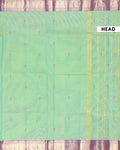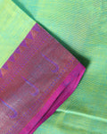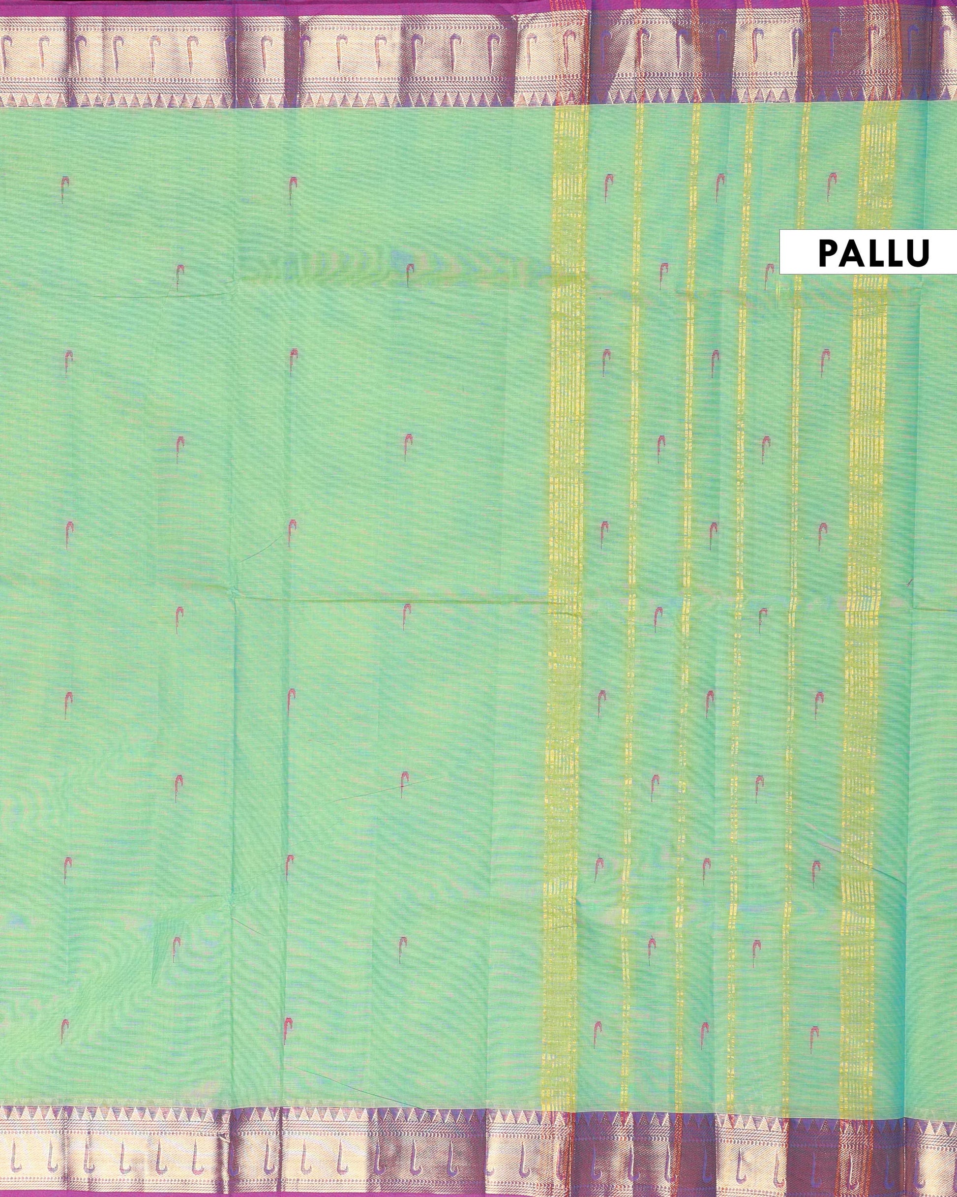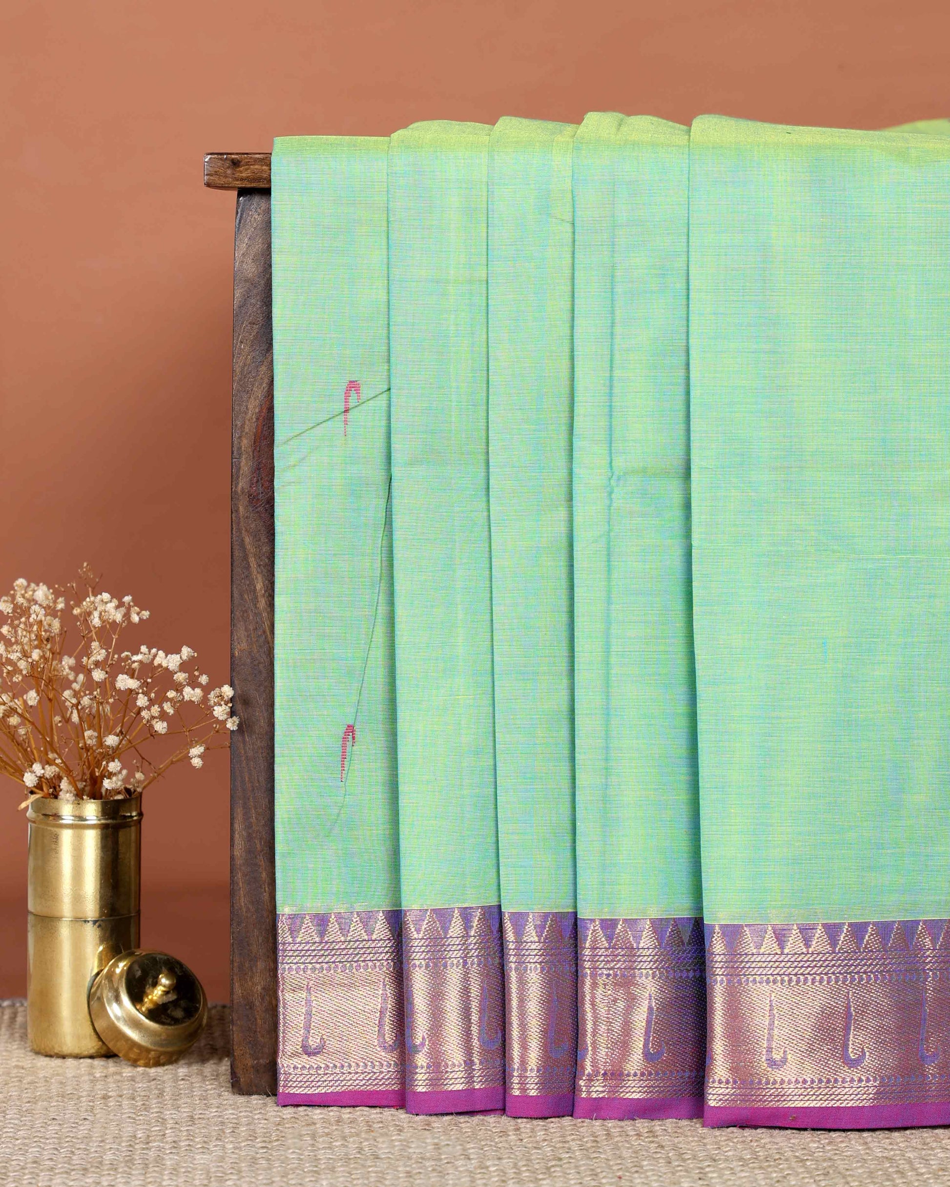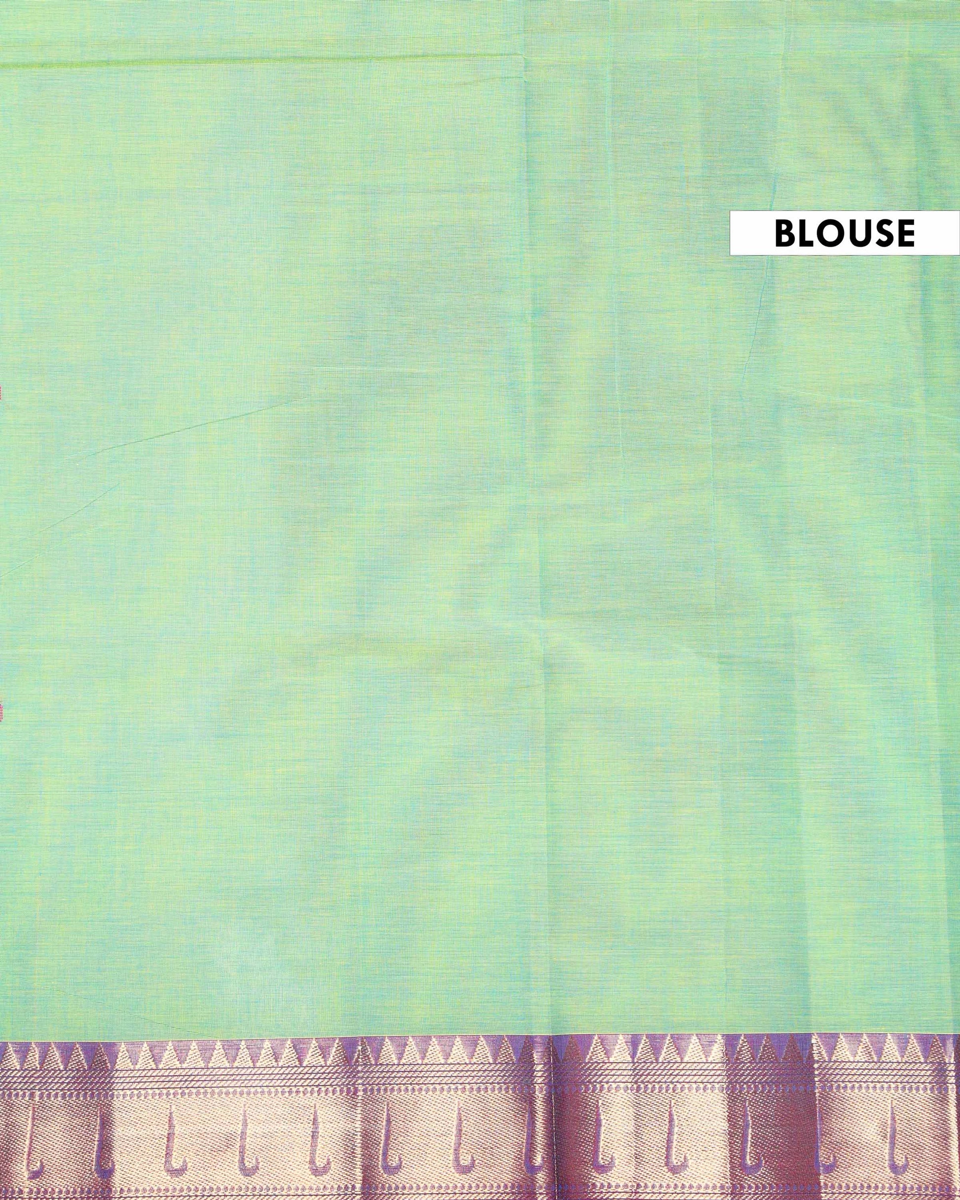 - Discover timeless elegance with this Light Green Chettinad Cotton saree a captivating striped body and vibrant contrast Purple zari border