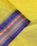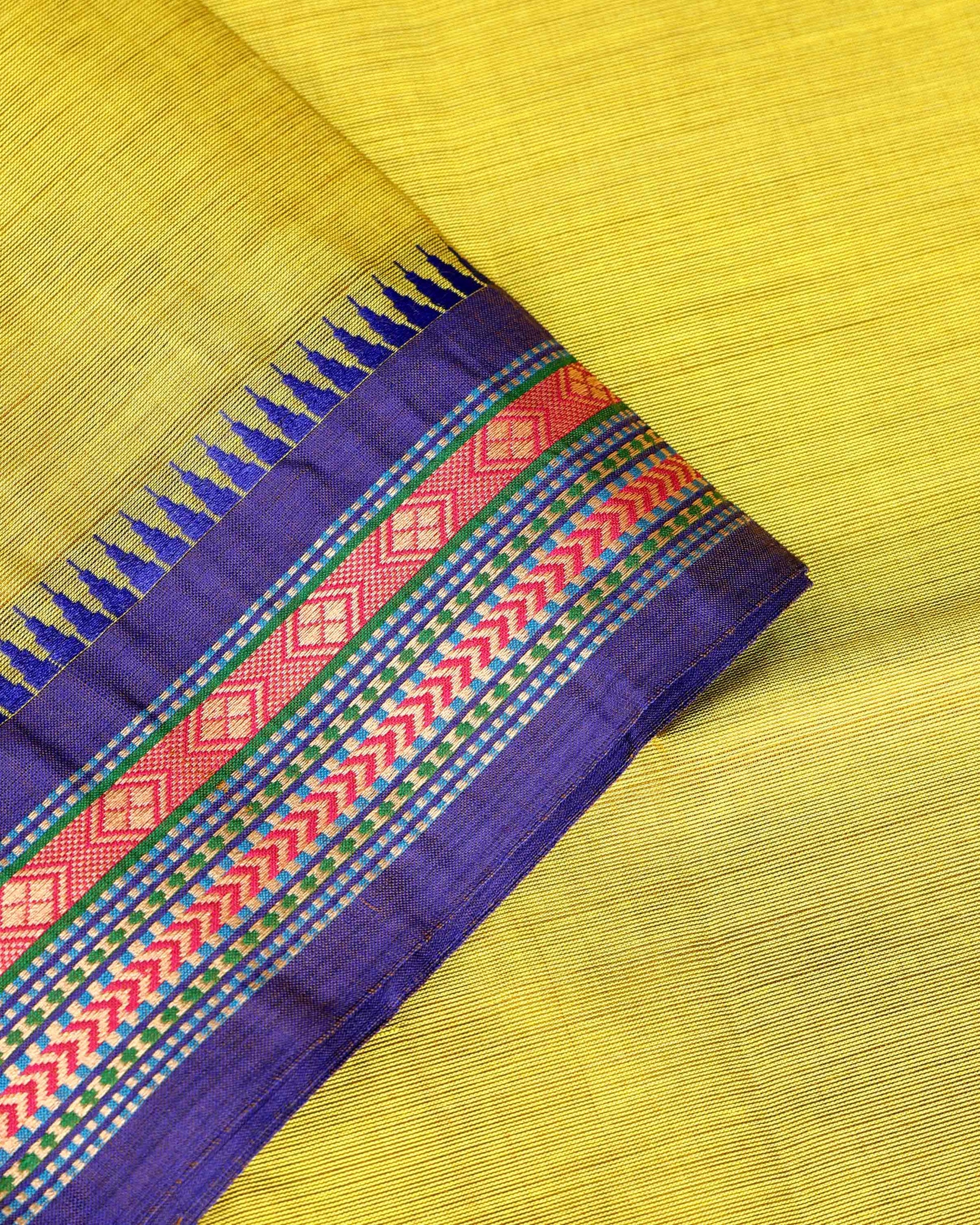 - A vibrant lemon yellow pure Chettinad cotton saree a traditional purple and red temple border for a classic look