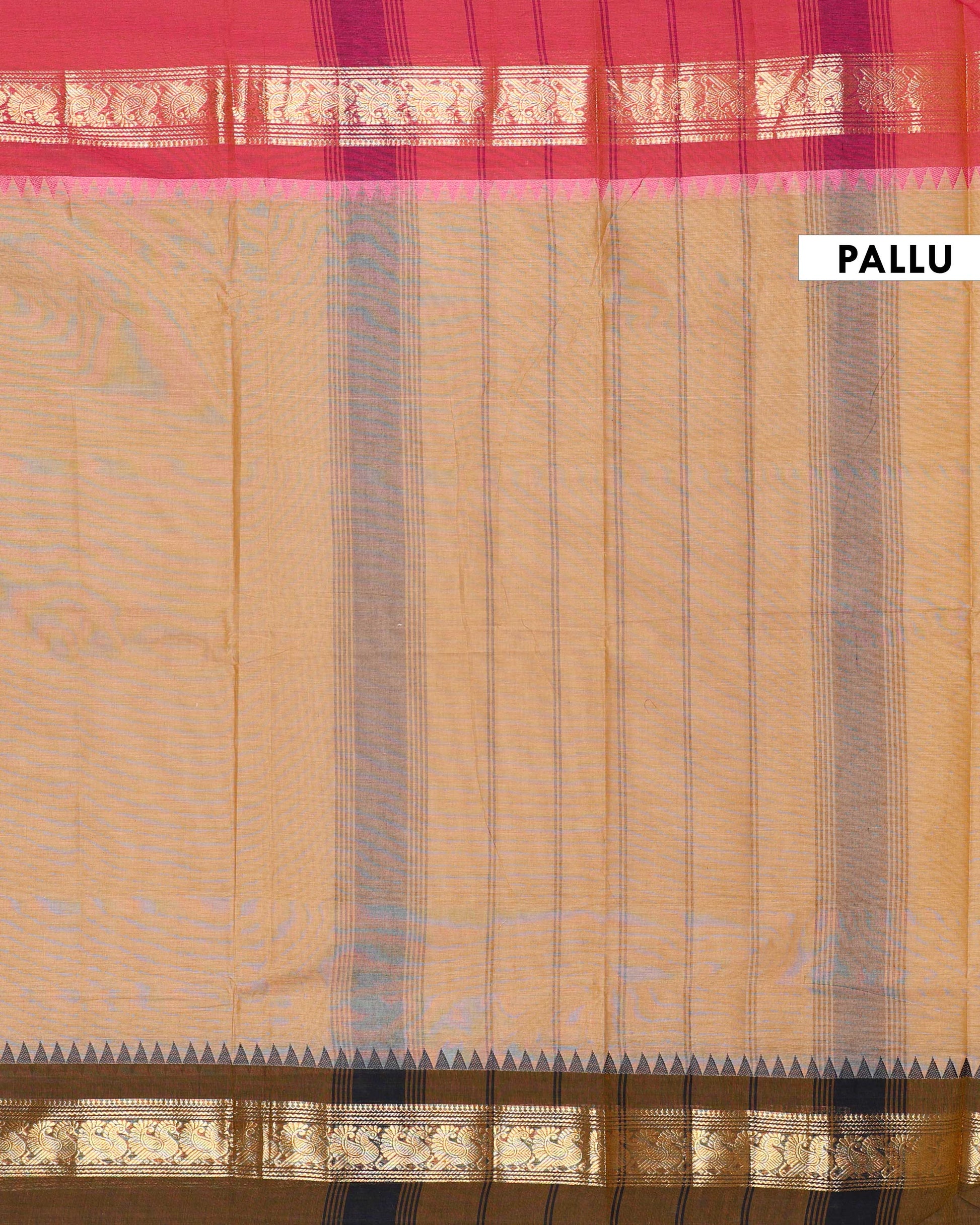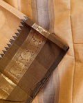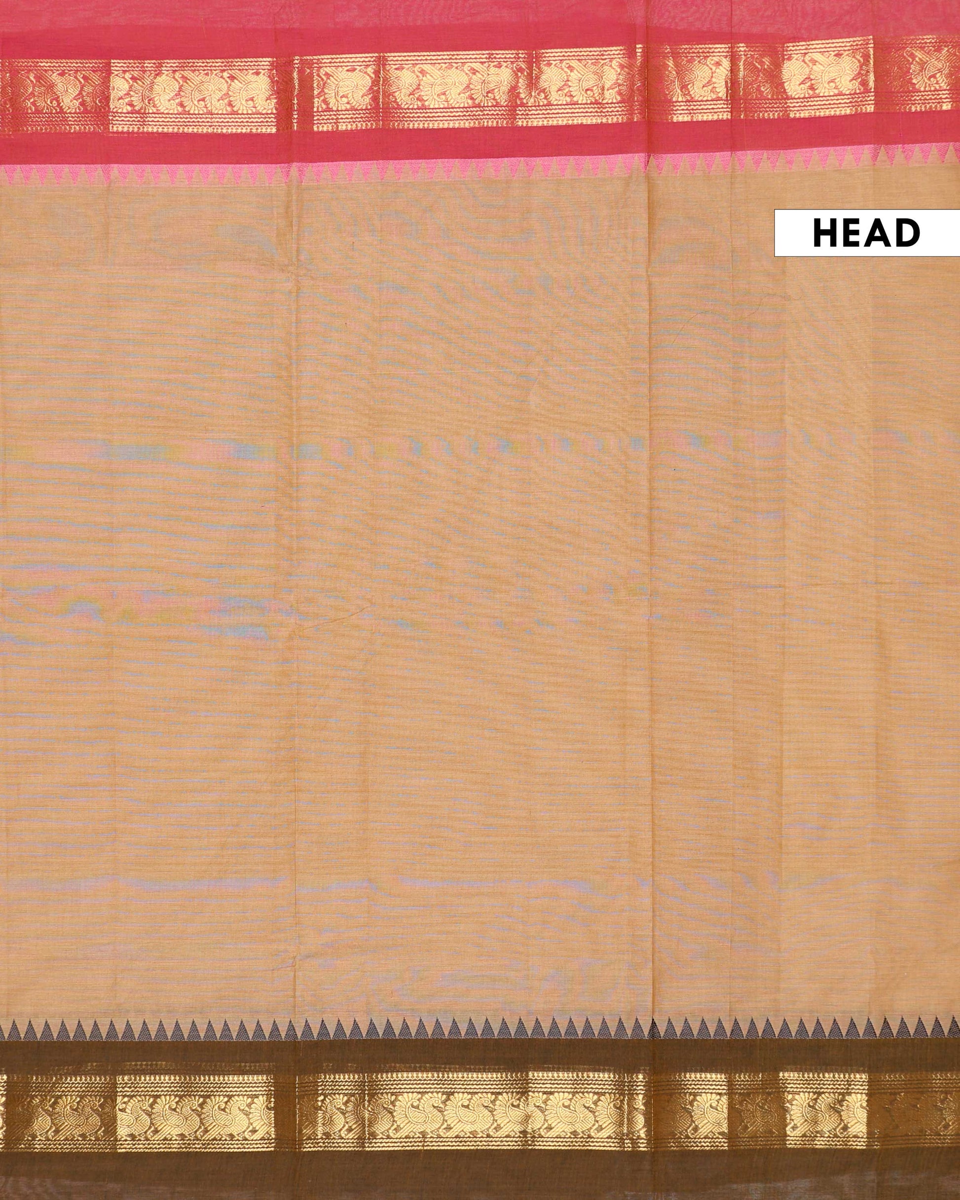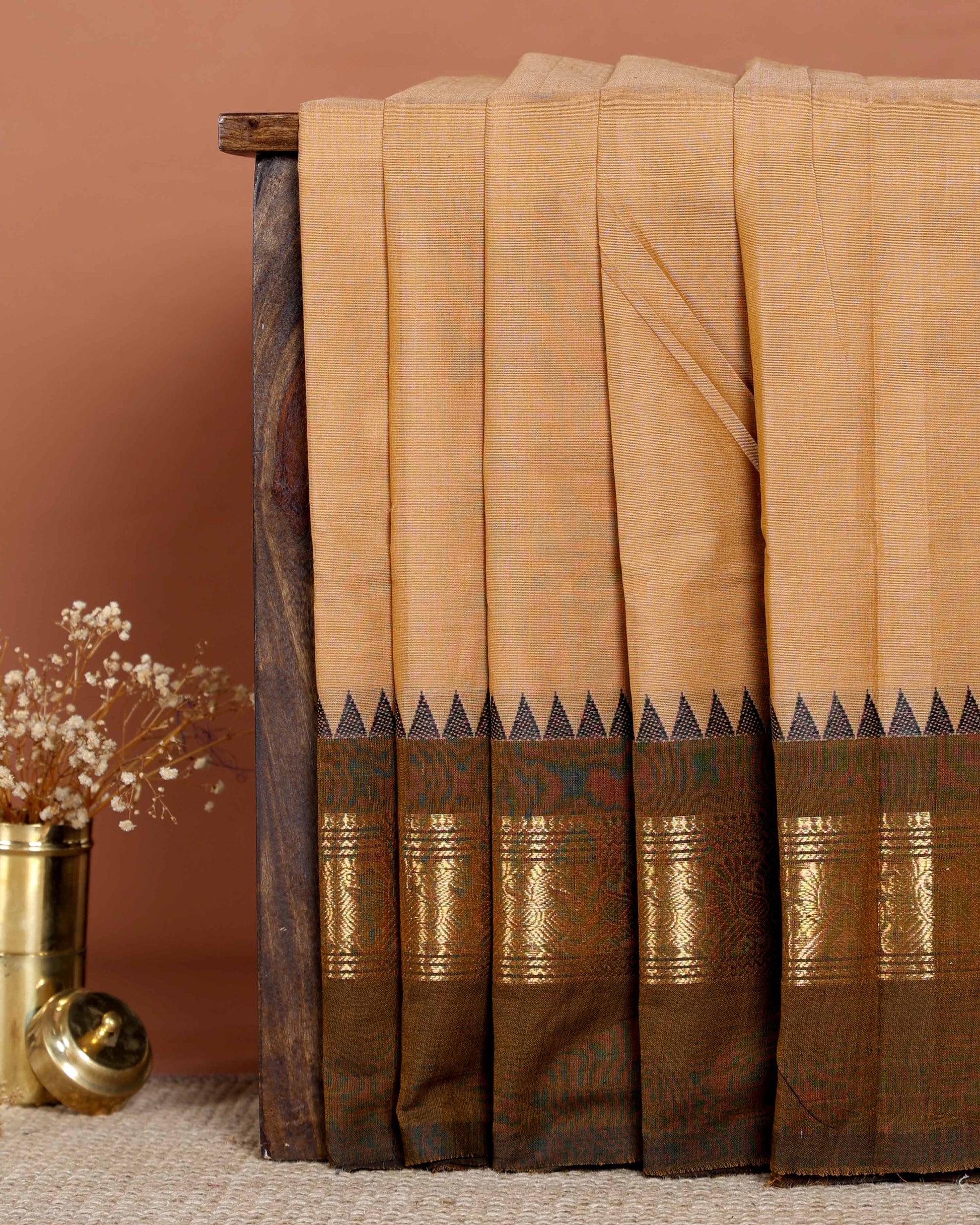 Disclaimer :- Product color may slightly vary due to photographic lighting sources or your monitor settingsThis pure cotton saree a classic beige body, a rich contrasting border with intricate temple motifs and zari work, offering a sophisticated and traditional look.