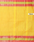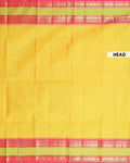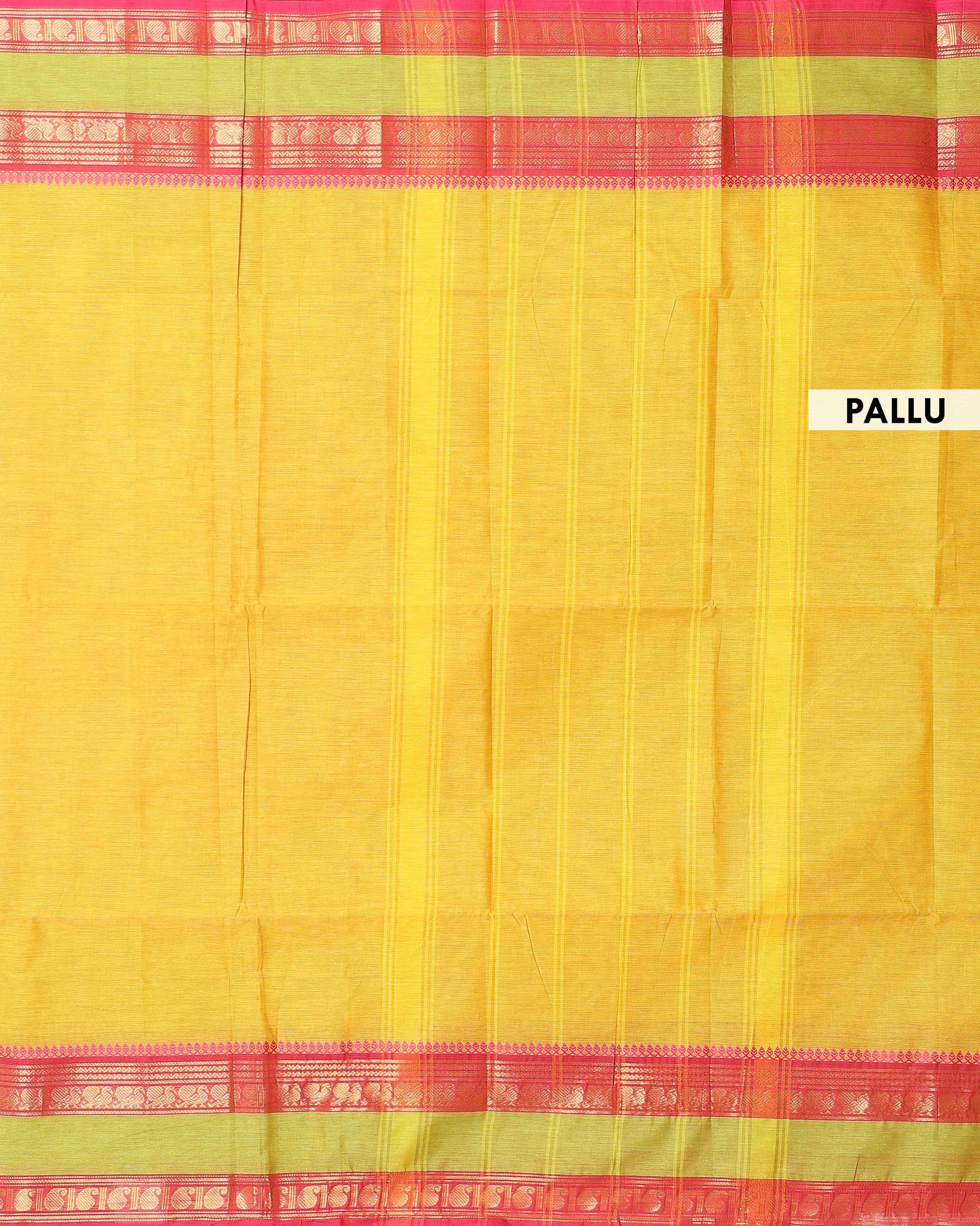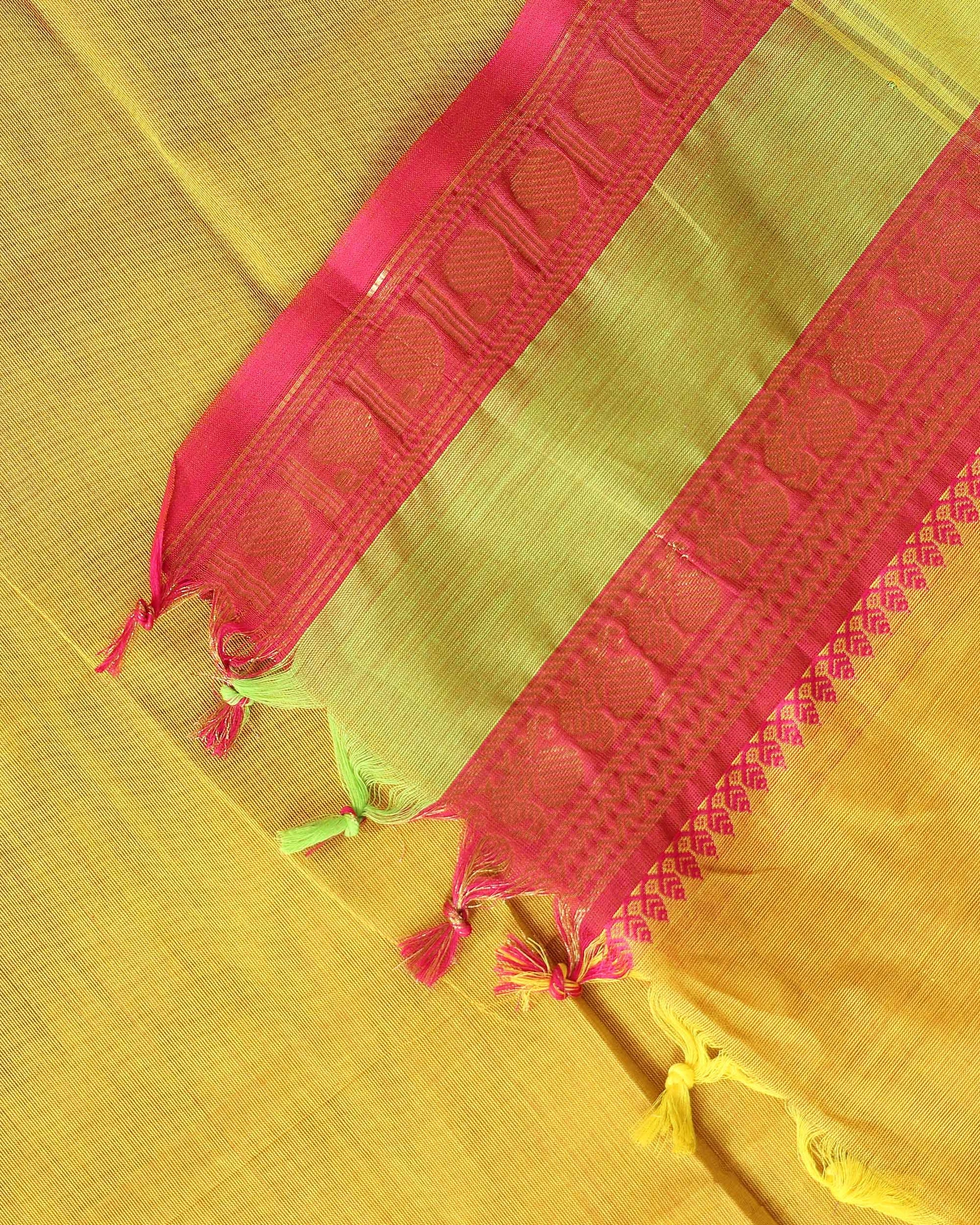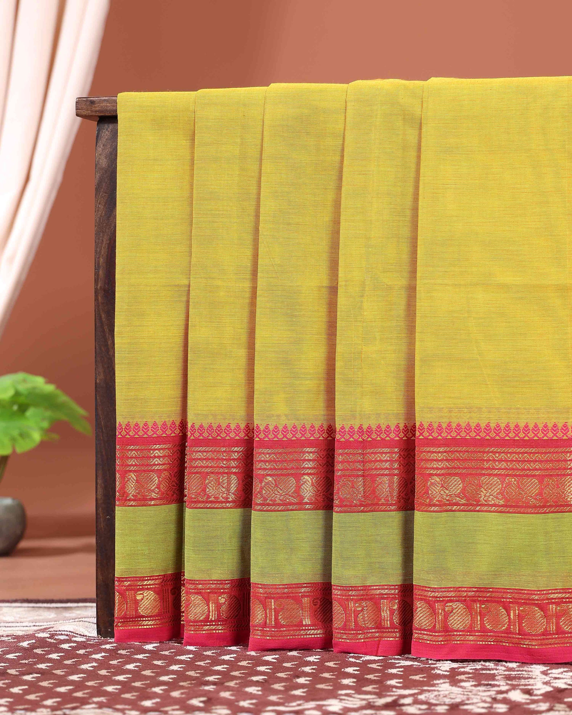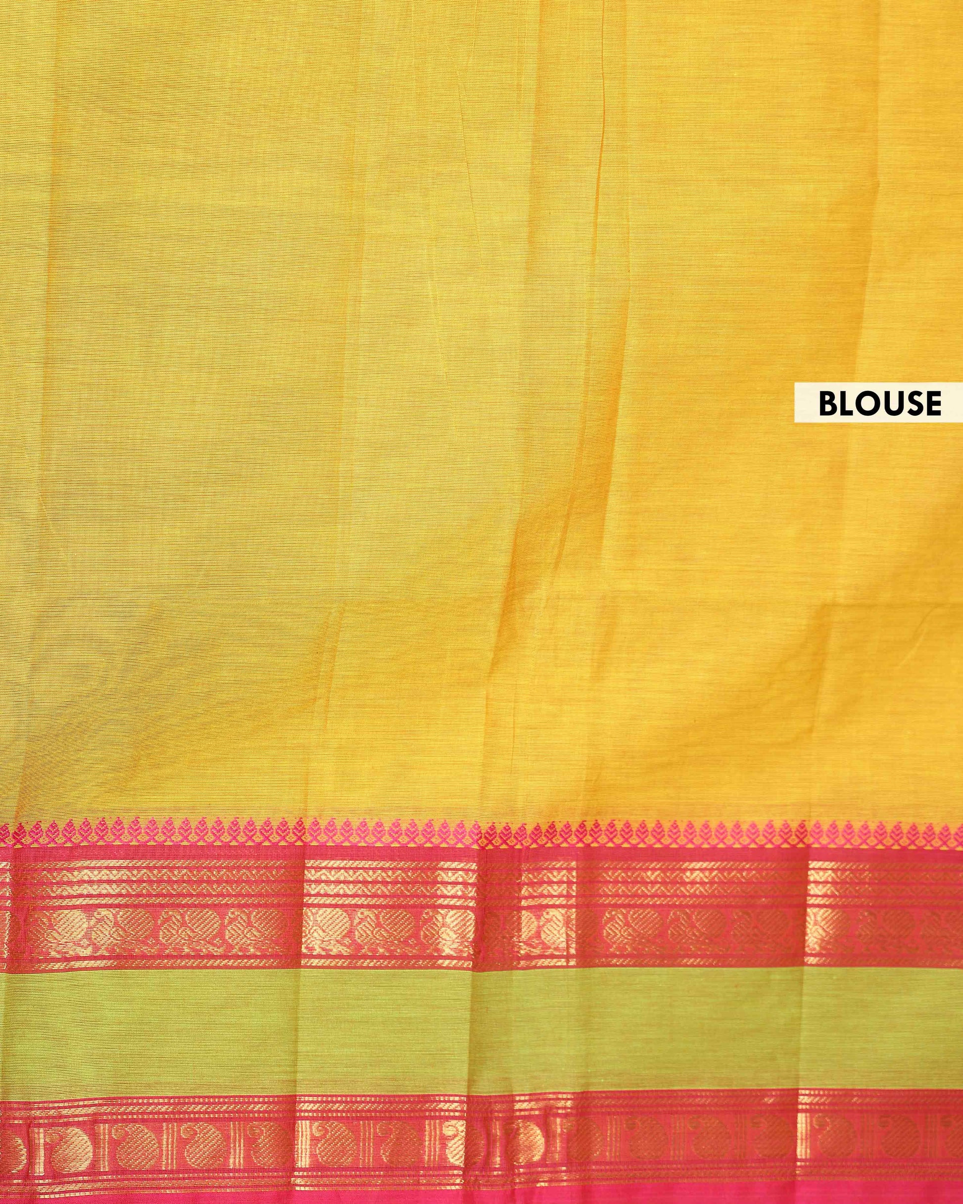 - This Kanchi cotton saree a parrot green body and a striking reddish pink border adorned with traditional golden zari motifs.