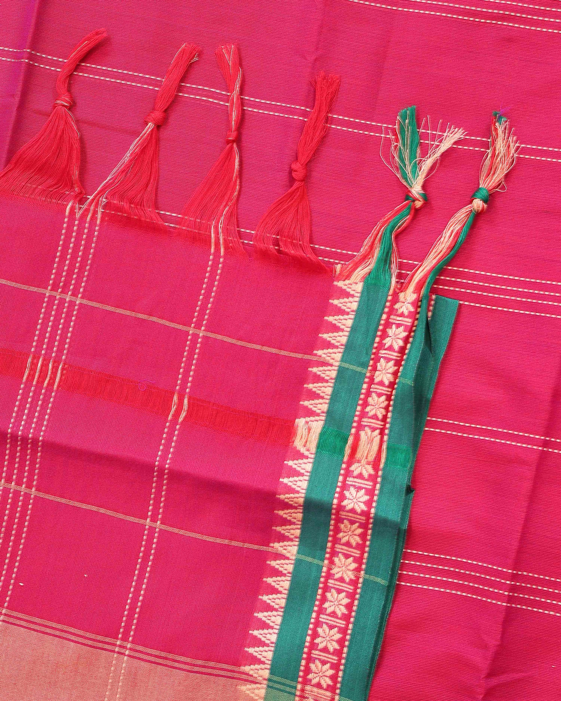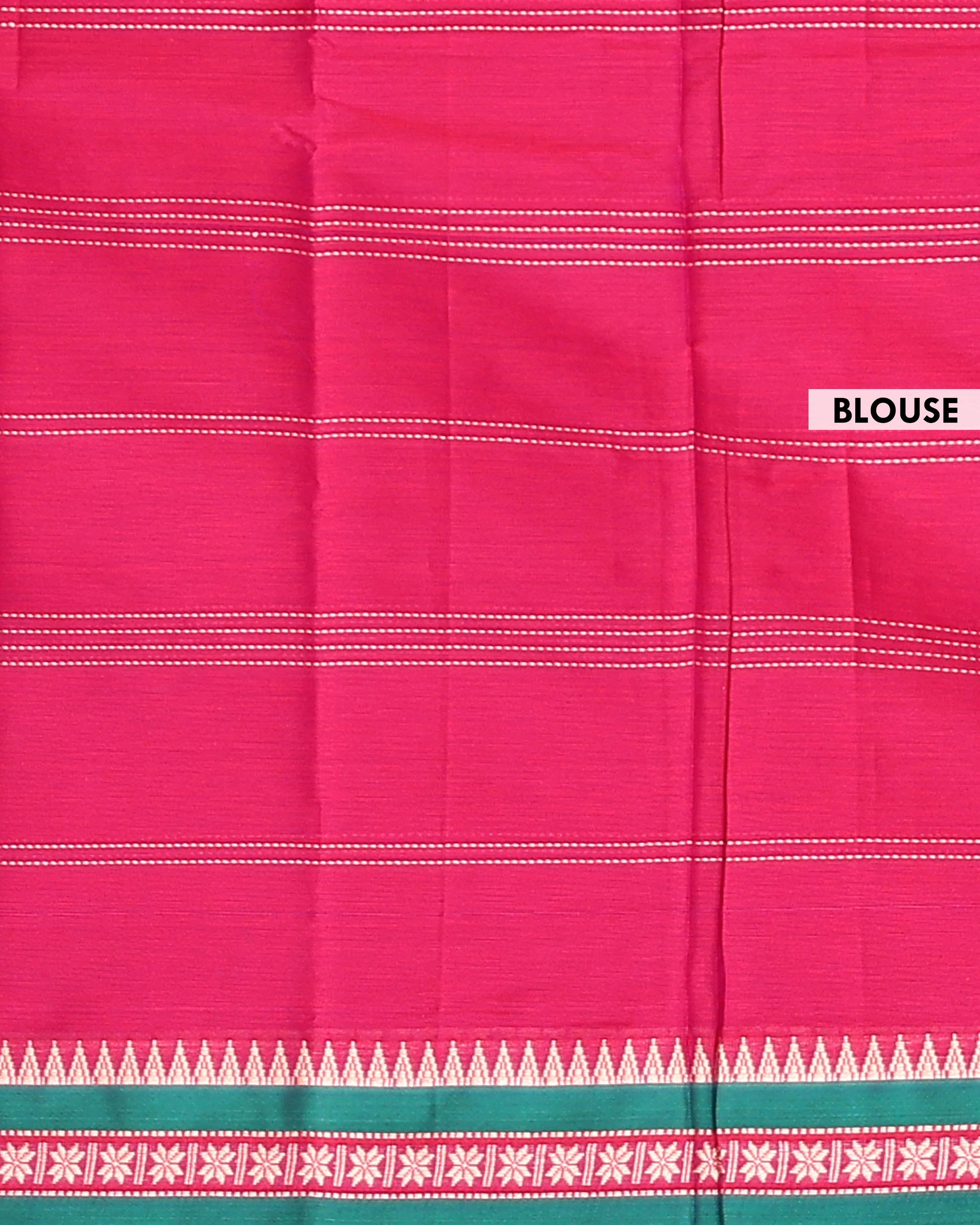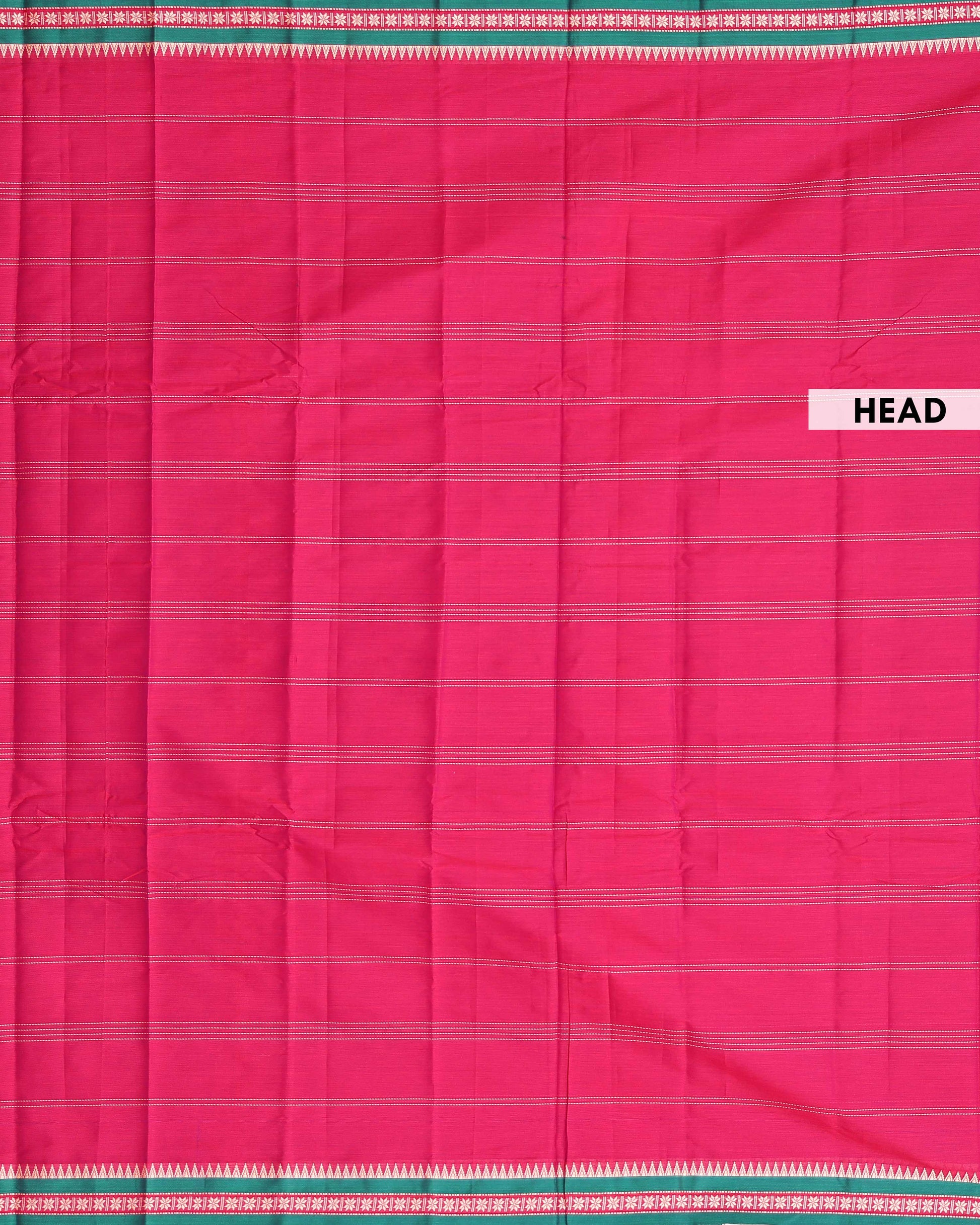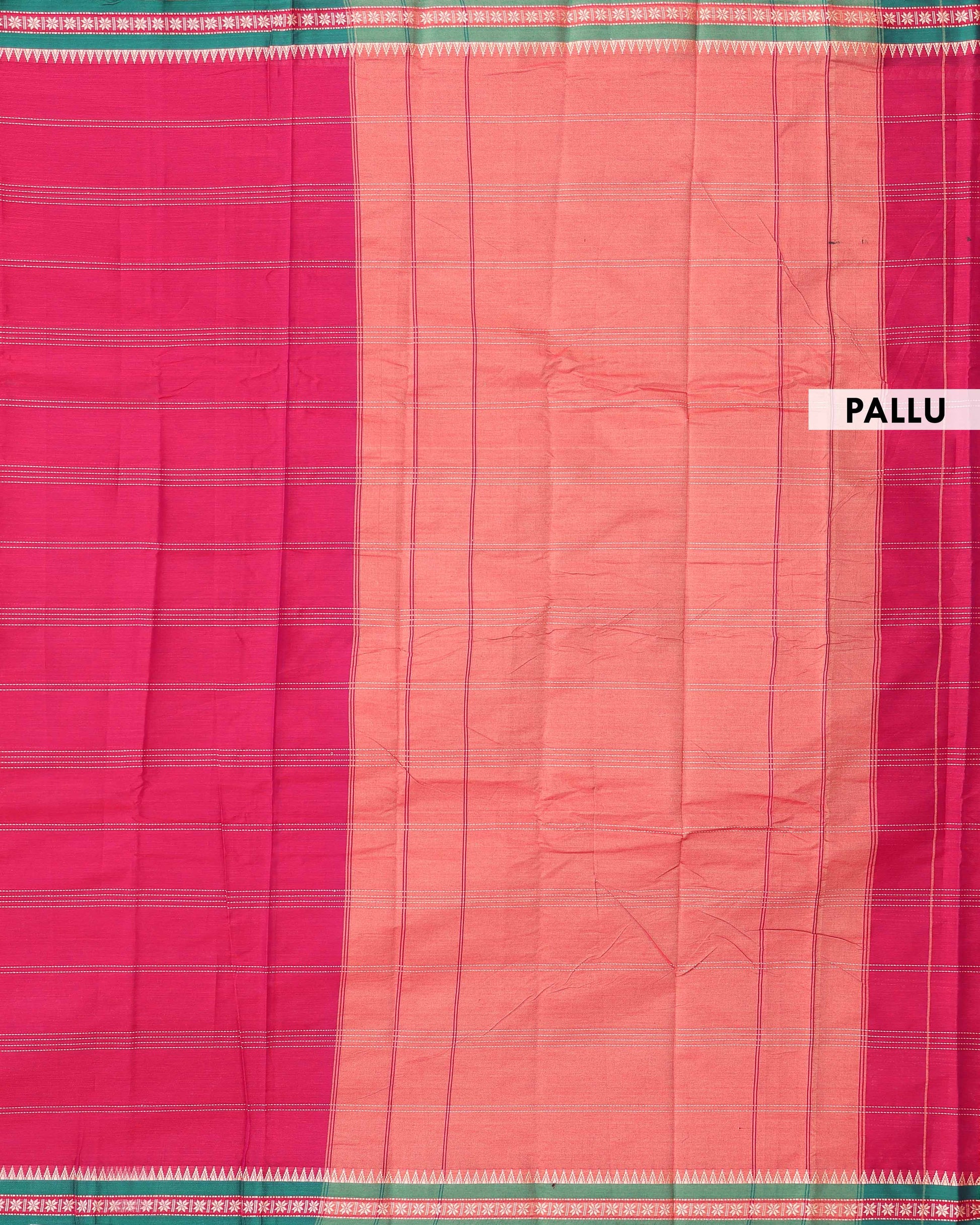 - Elevate ethnic style with this exquisite Pink handloom Narayanpet cotton saree a contrasting green border with classic temple motifs