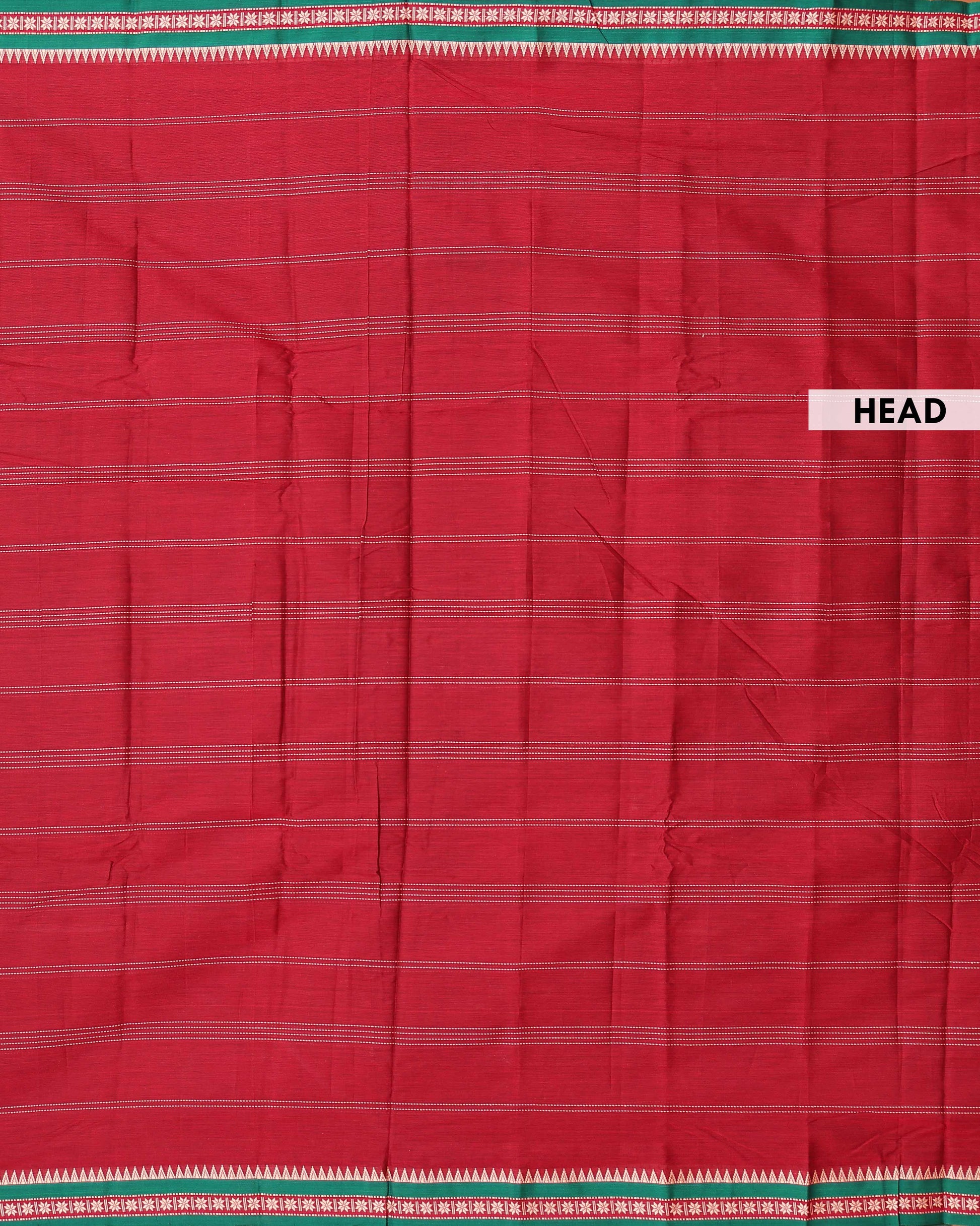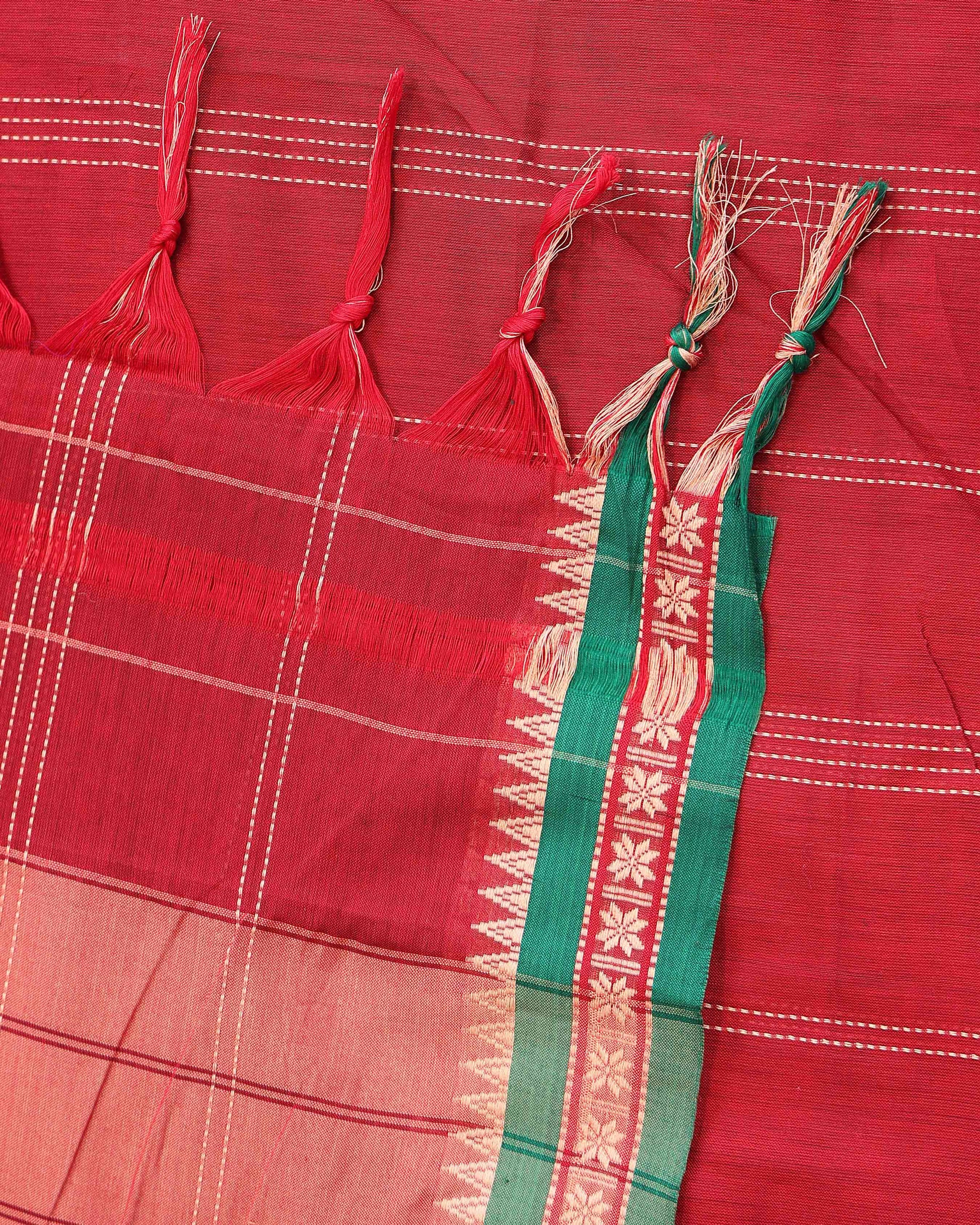 - Elevate ethnic style with this exquisite Red handloom Narayanpet cotton saree a contrasting green border with classic temple motifs
