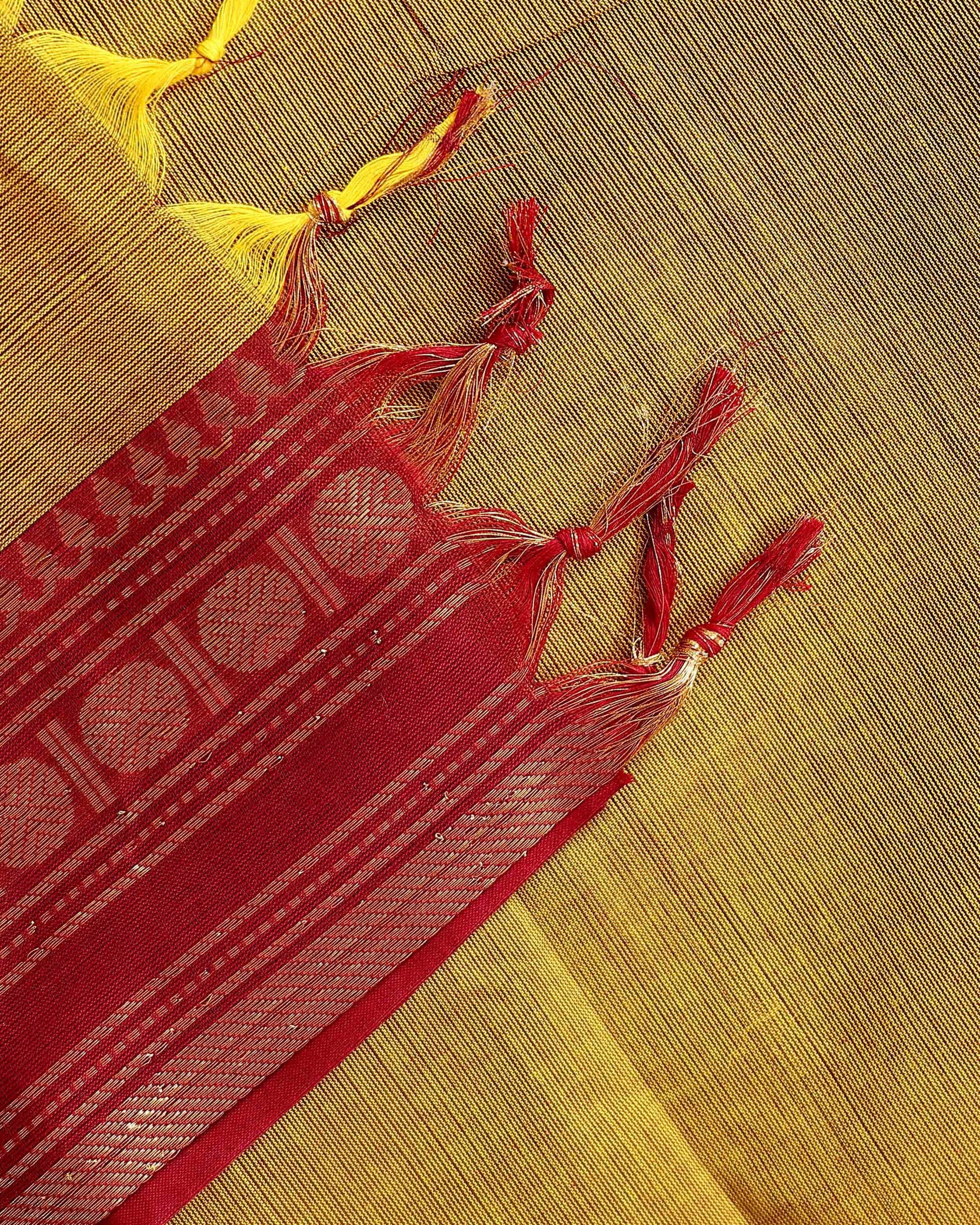 - Features an exquisite deep red border adorned with intricate zari work blending comfort with timeless elegance
