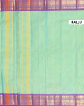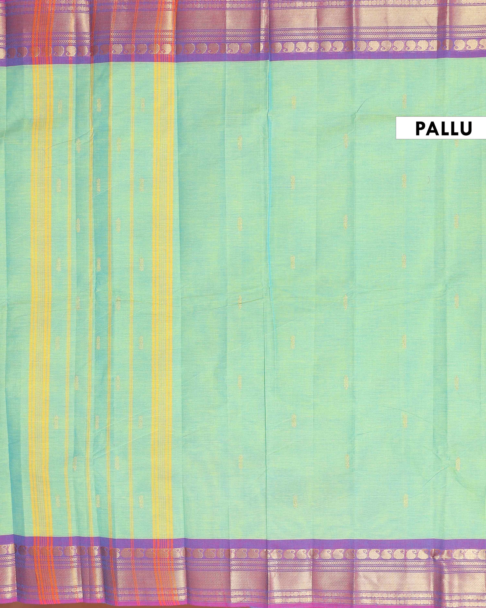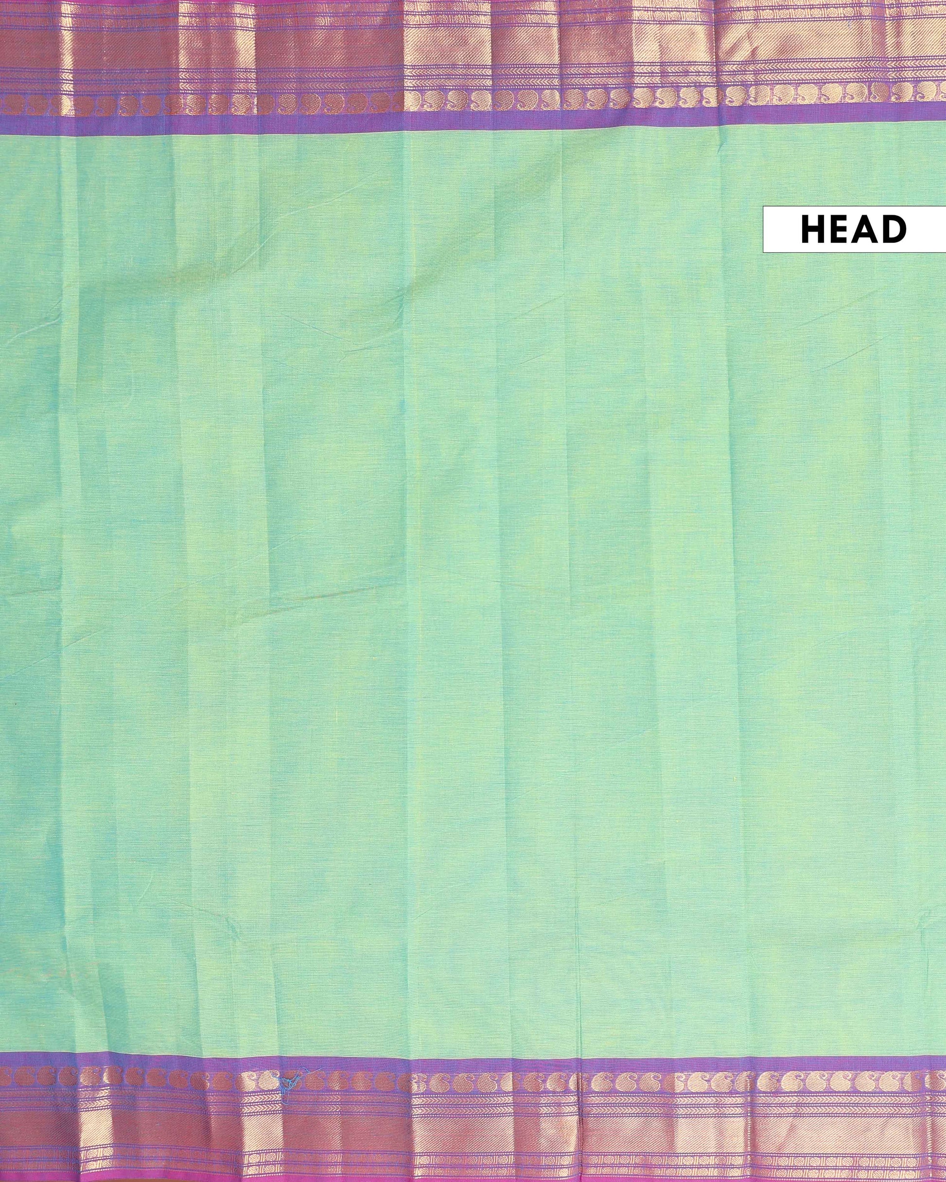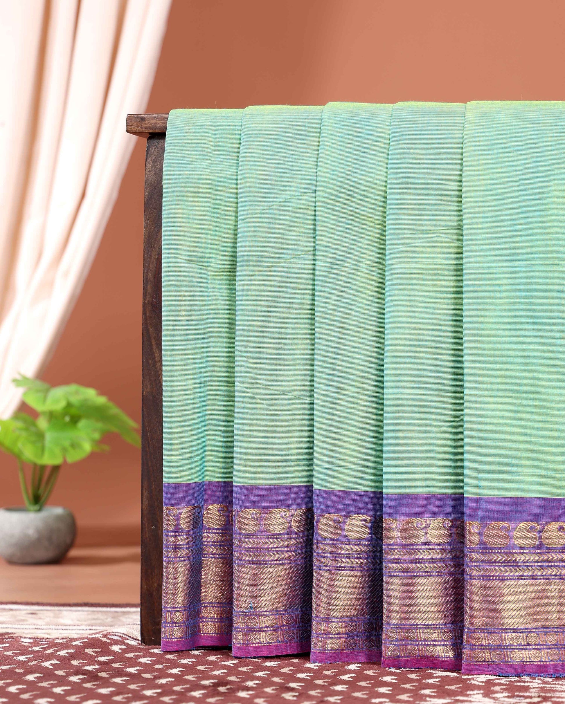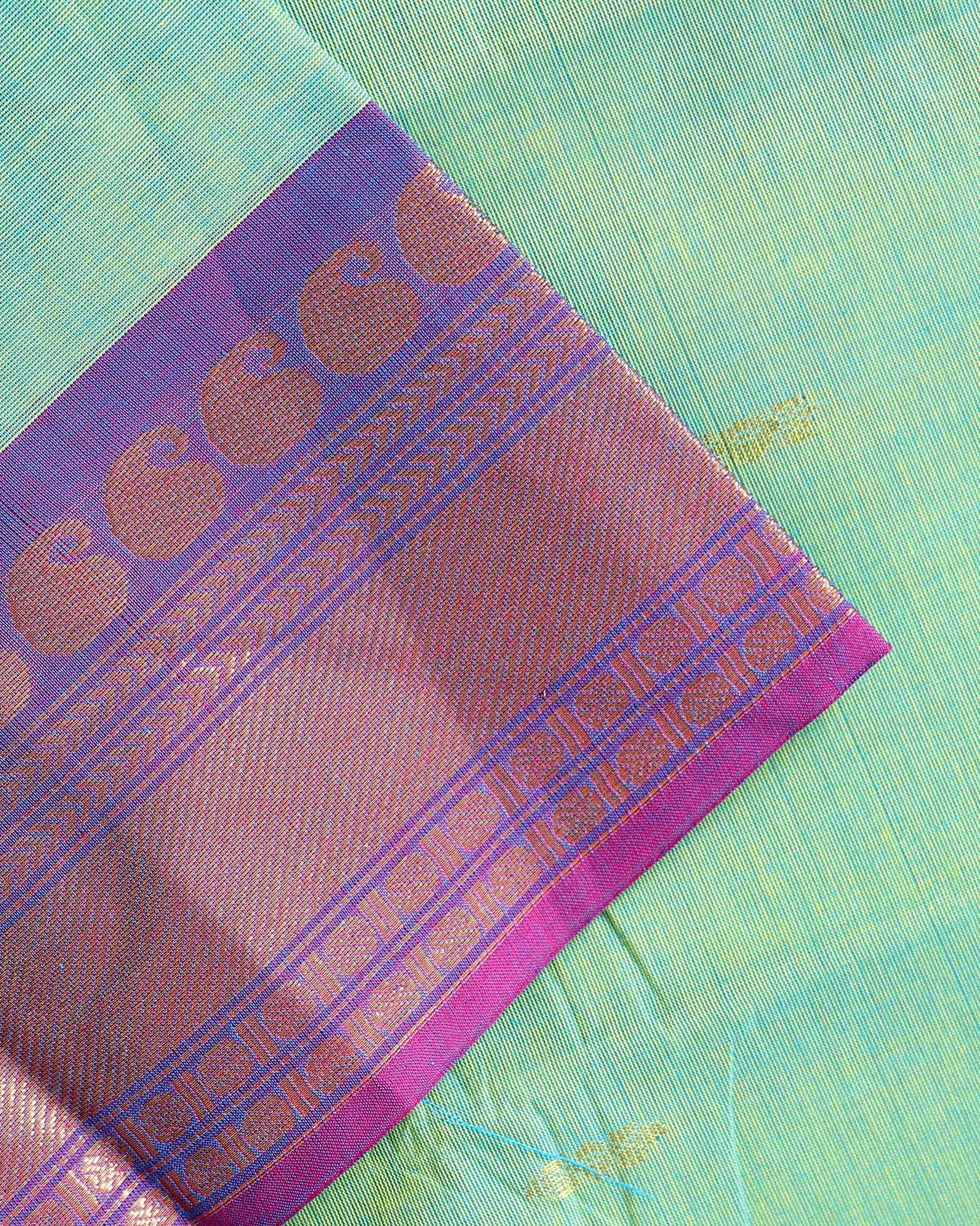 - This stunning pure Kanchi cotton saree in a vibrant Green a rich contrasting Purple border with traditional gold zari paisley motifs