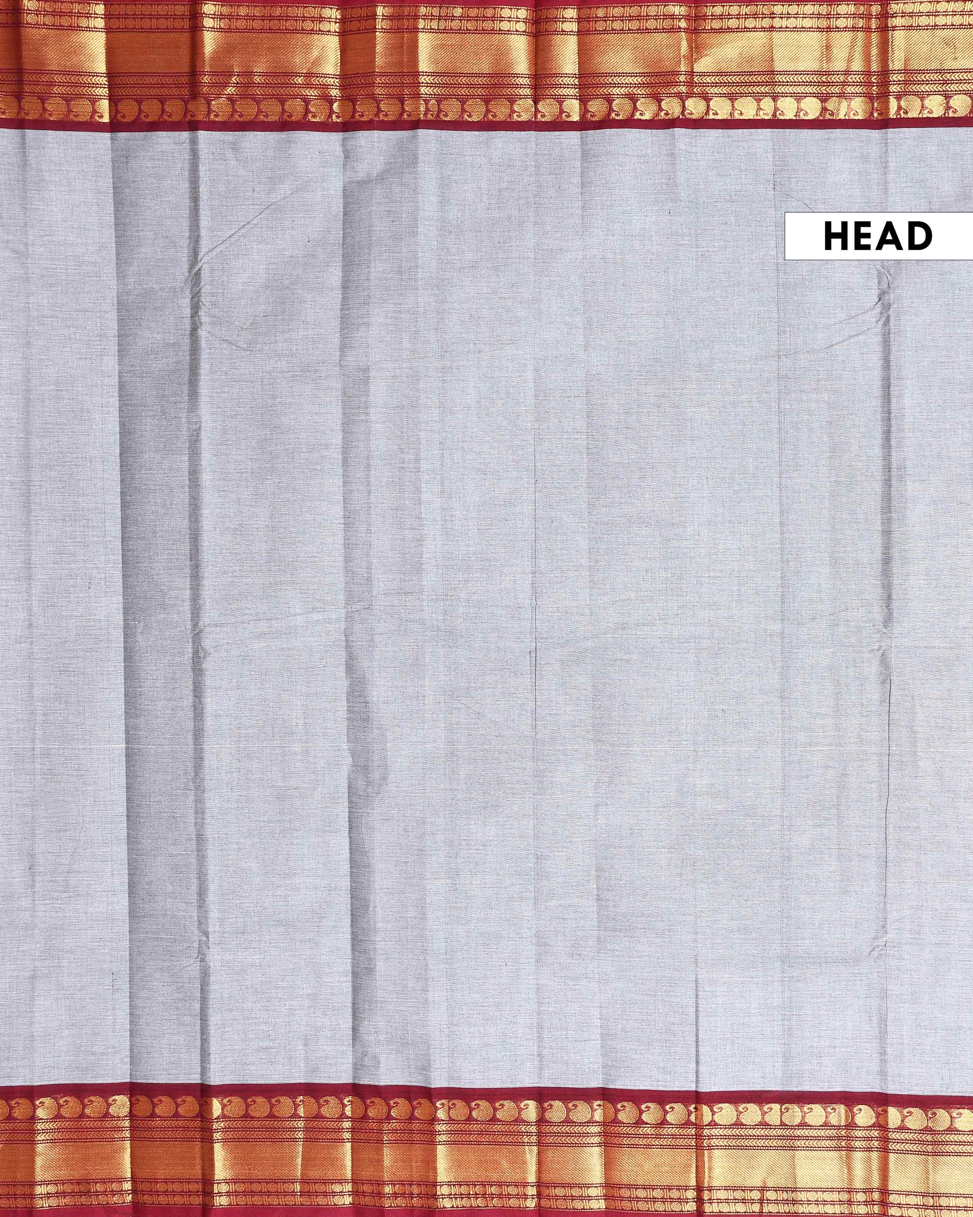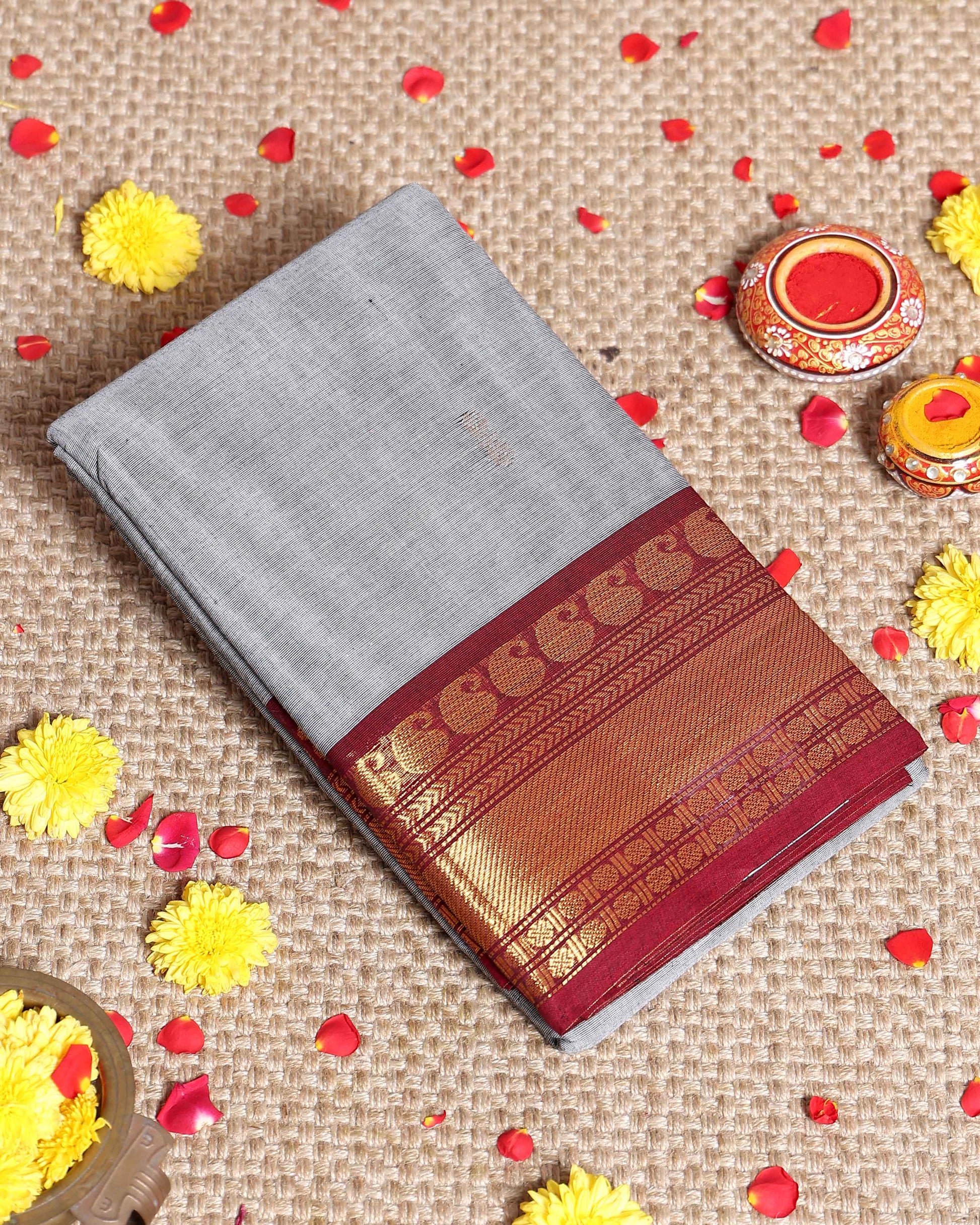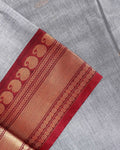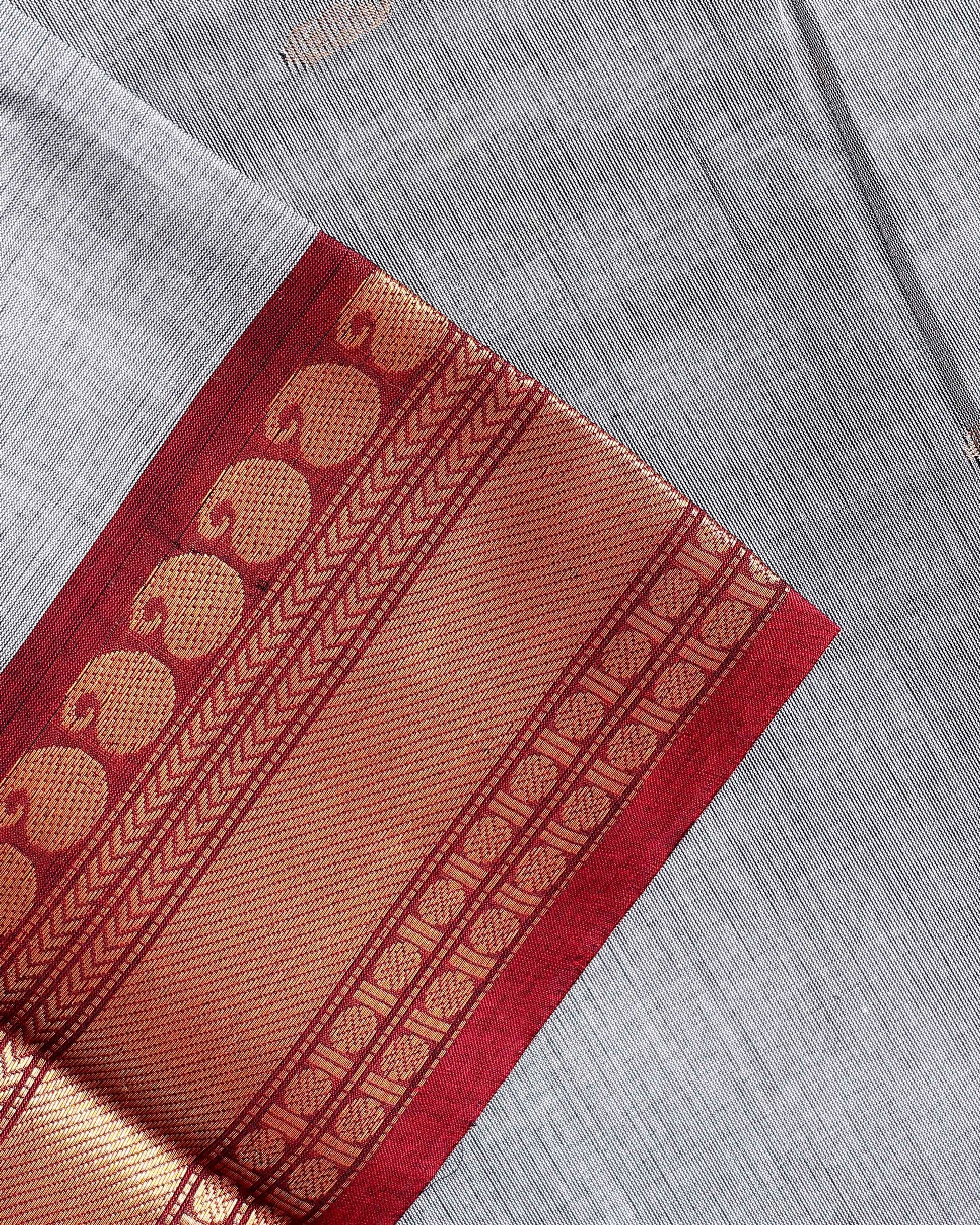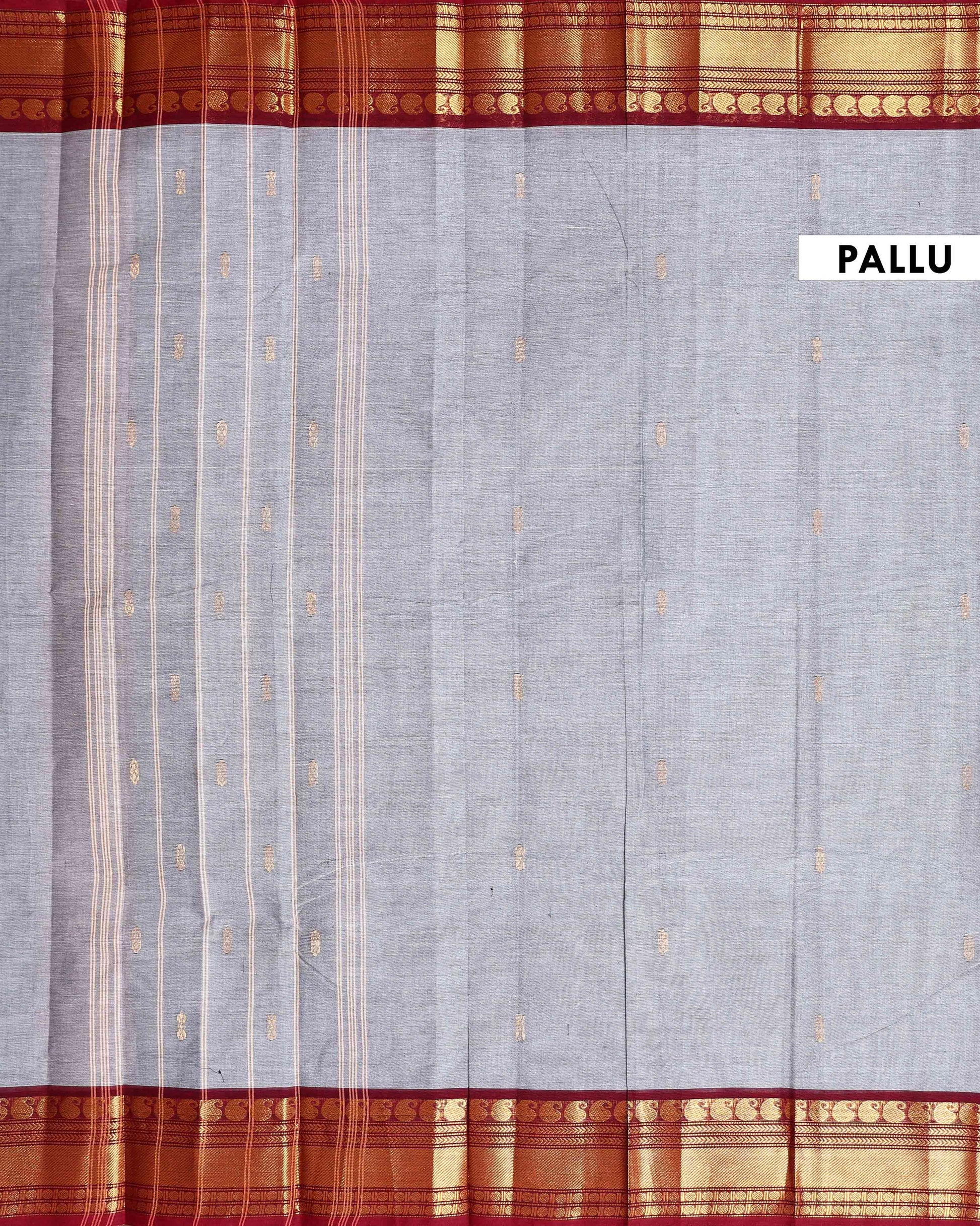 - Discover timeless elegance with this Grey Kanchi Cotton Saree intricate butta woven designs and a rich contrast maroon zari border