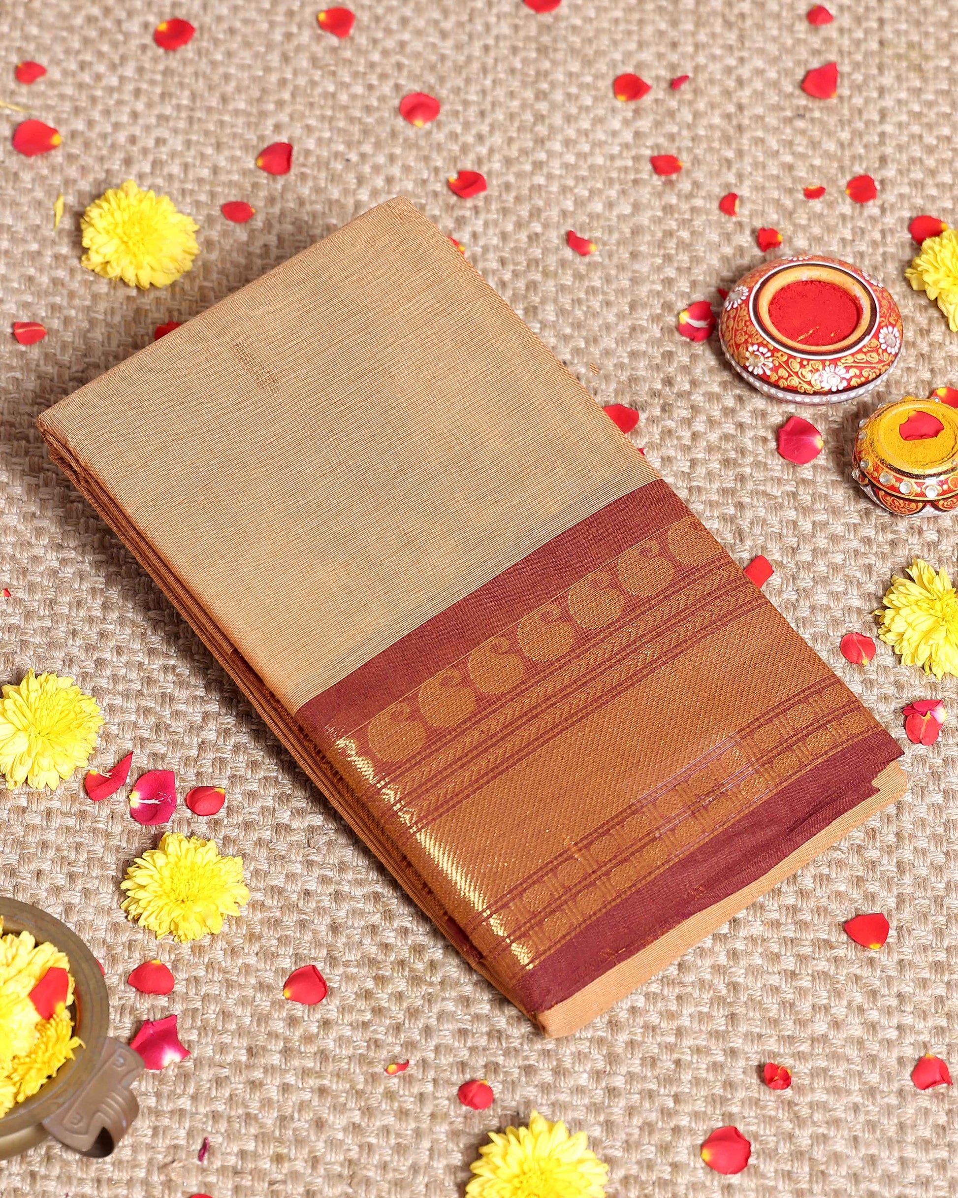 Elegant Kanchi Cotton Saree with Grand Zari Border Traditional Paisley Motifs & Soft Texture Weave Without Blouse - Sandal