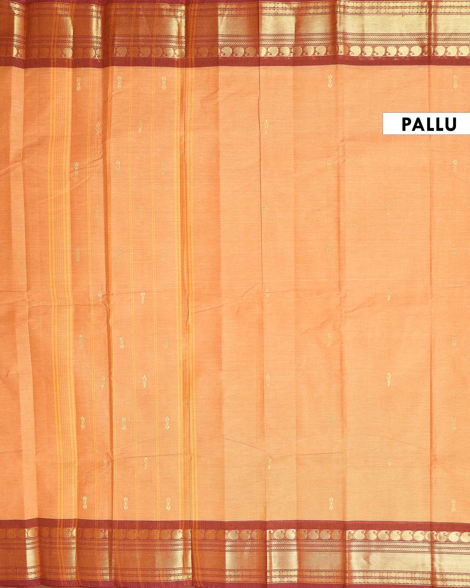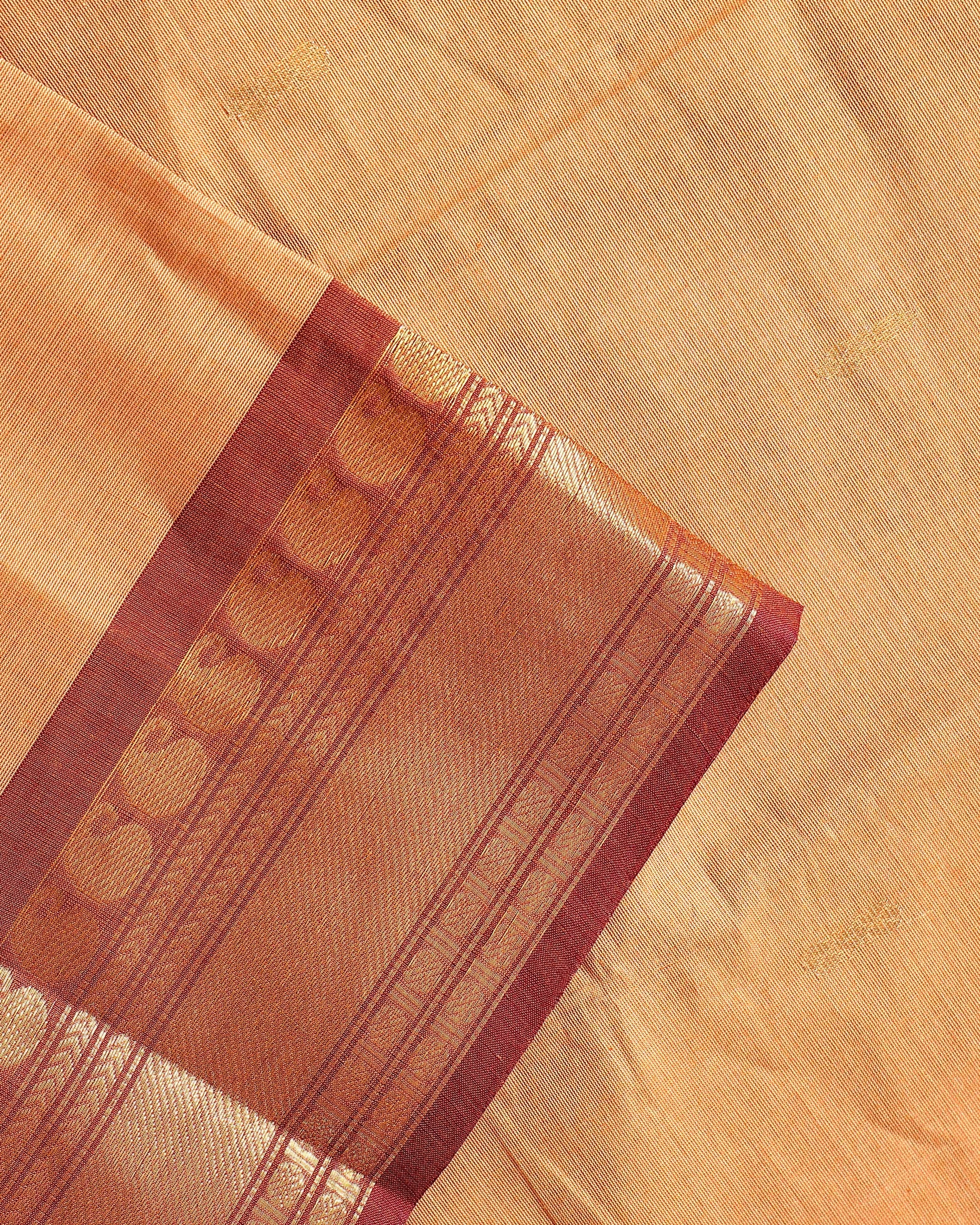 - Discover timeless elegance with this Sandal Kanchi Cotton Saree intricate butta woven designs and a rich contrast maroon zari border