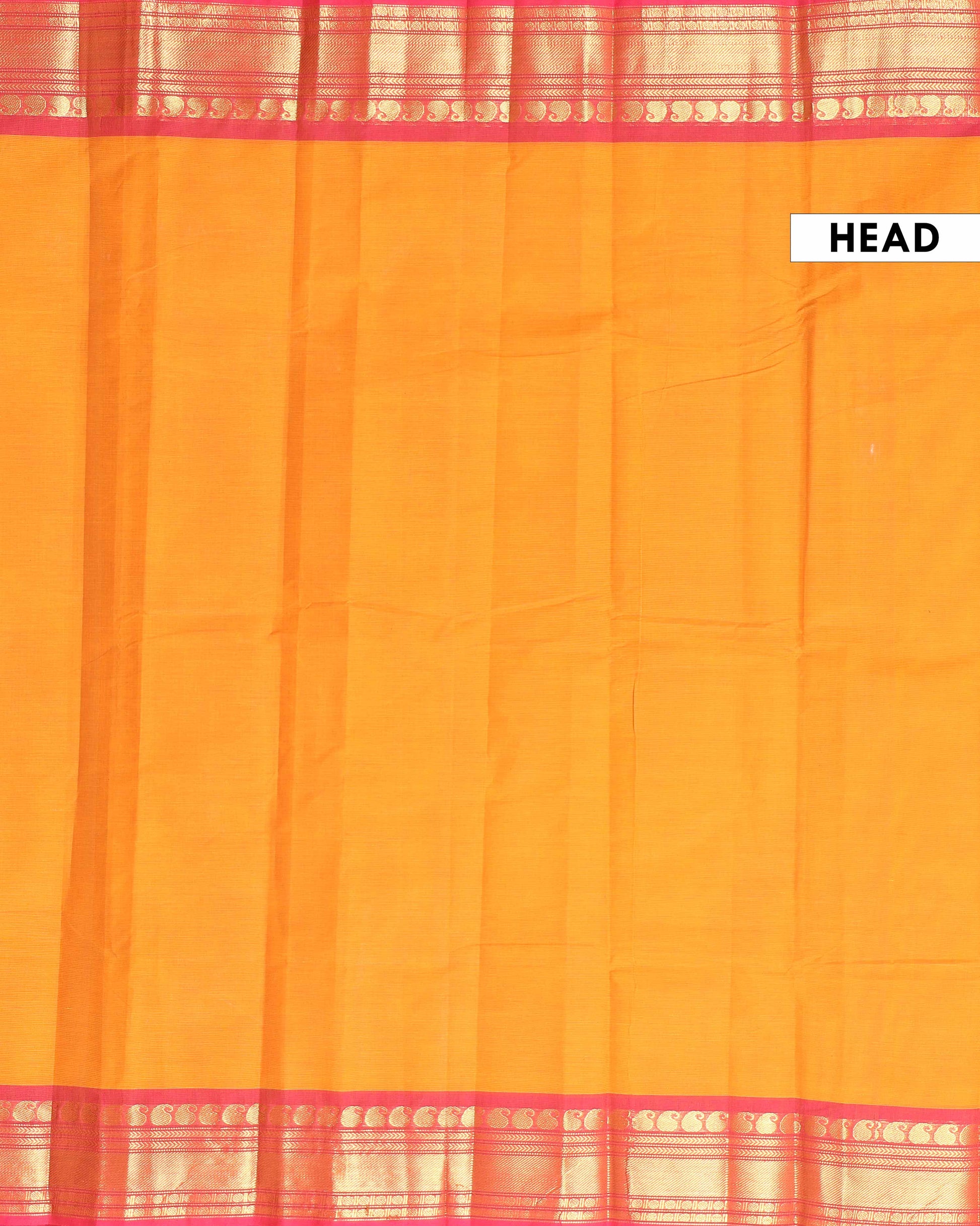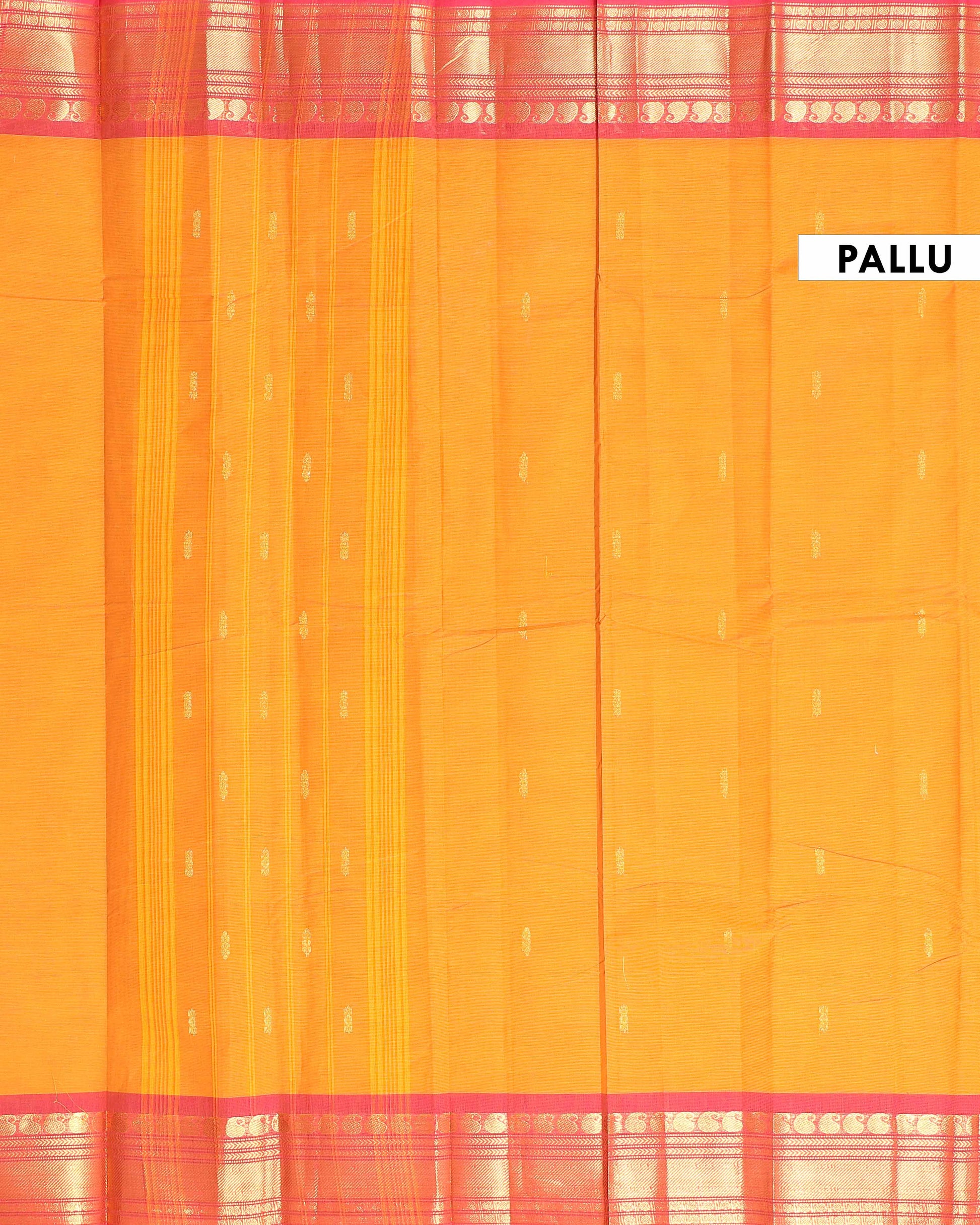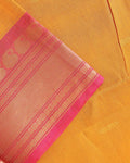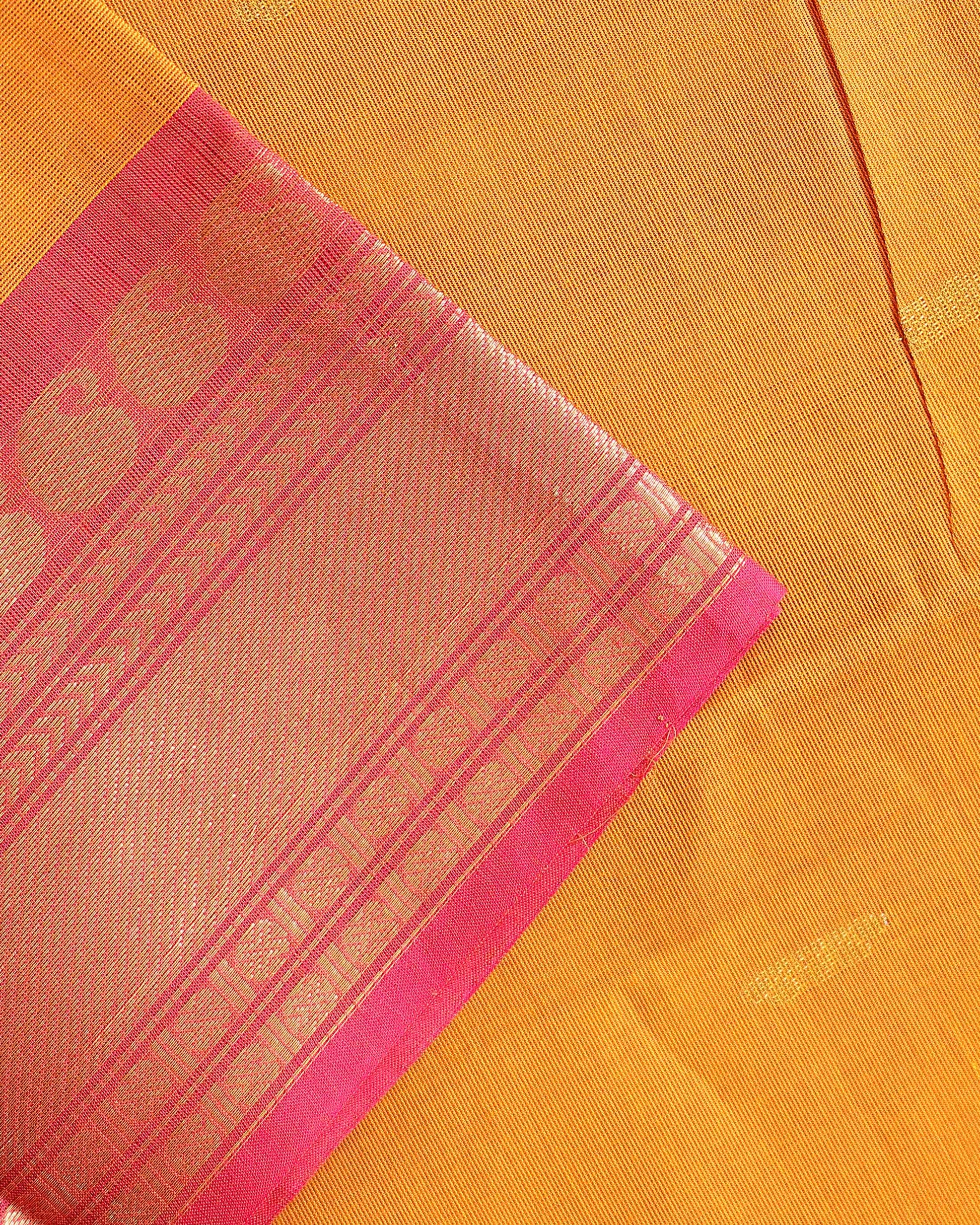 - This stunning yellow Kanchi cotton saree a vibrant contrast pink border with intricate thread work detailing.