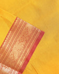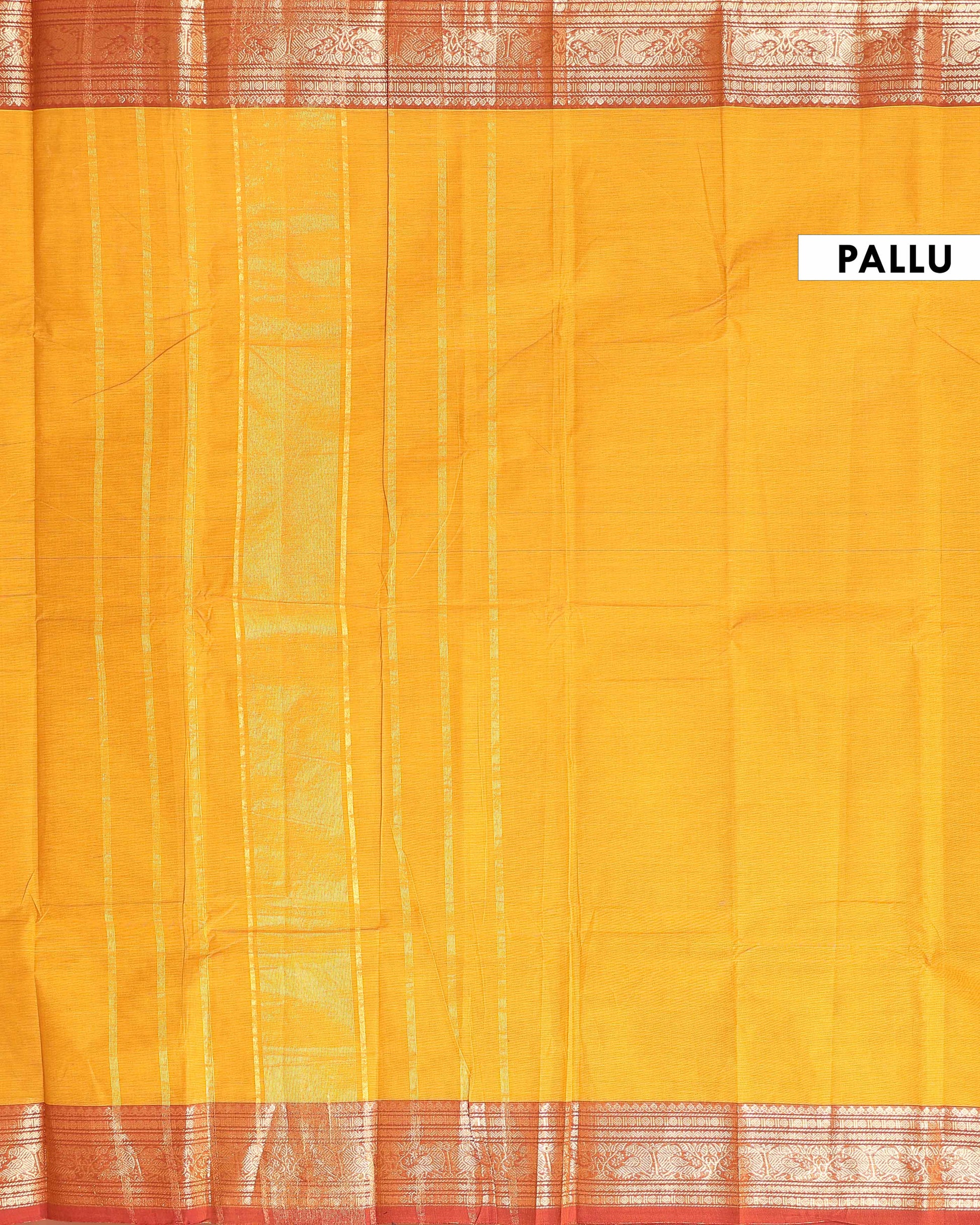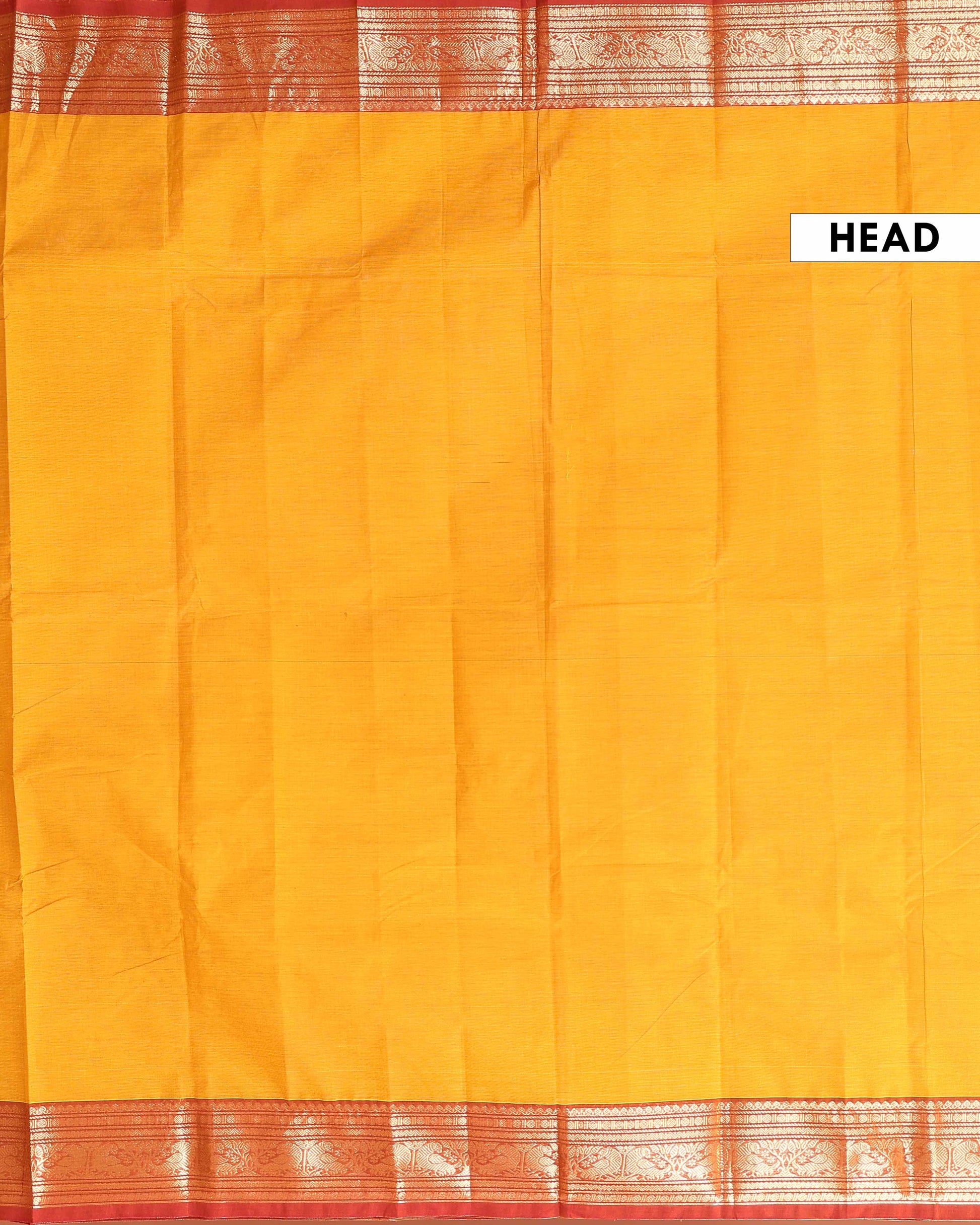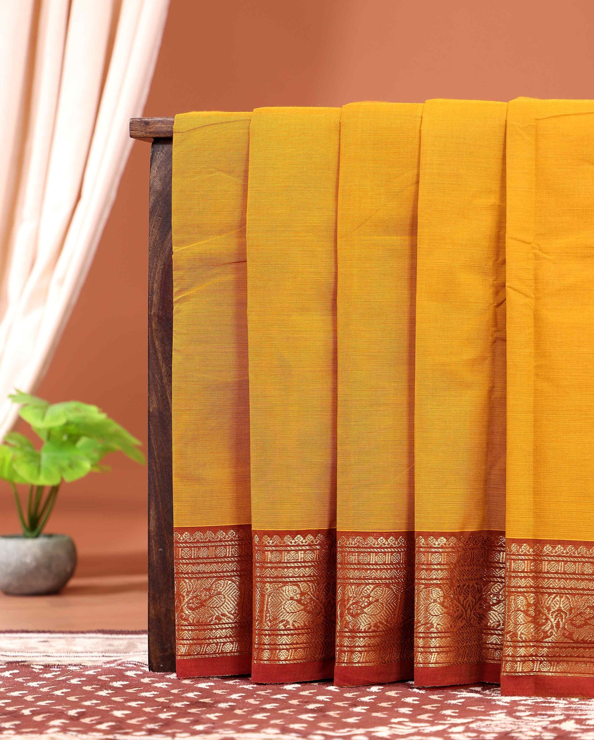 - This elegant Mustard Kanchi cotton saree is a handloom masterpiece a plain body and a rich traditional border with intricate motifs.