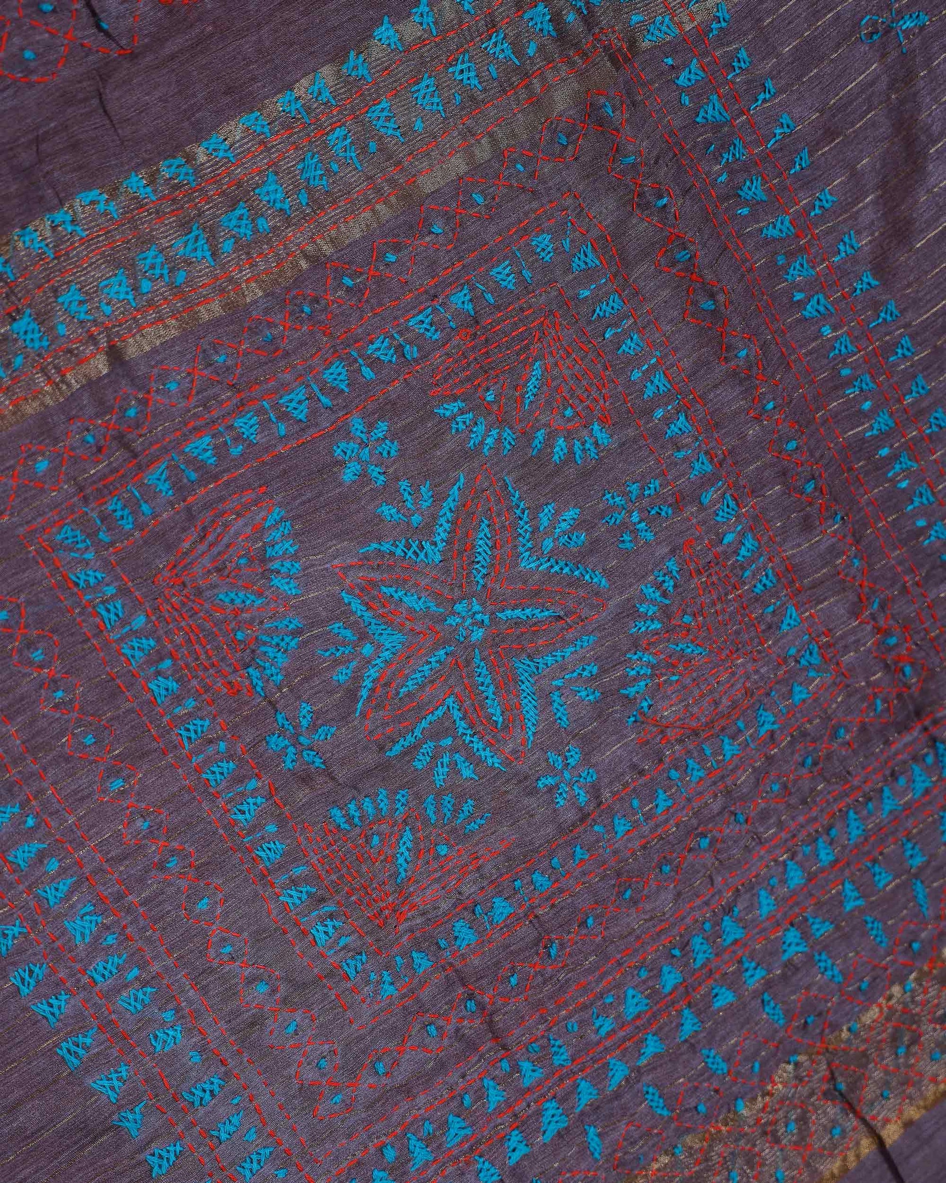 - This beautiful Light Grey Kantha saree features intricate traditional embroidery along the border and pallu