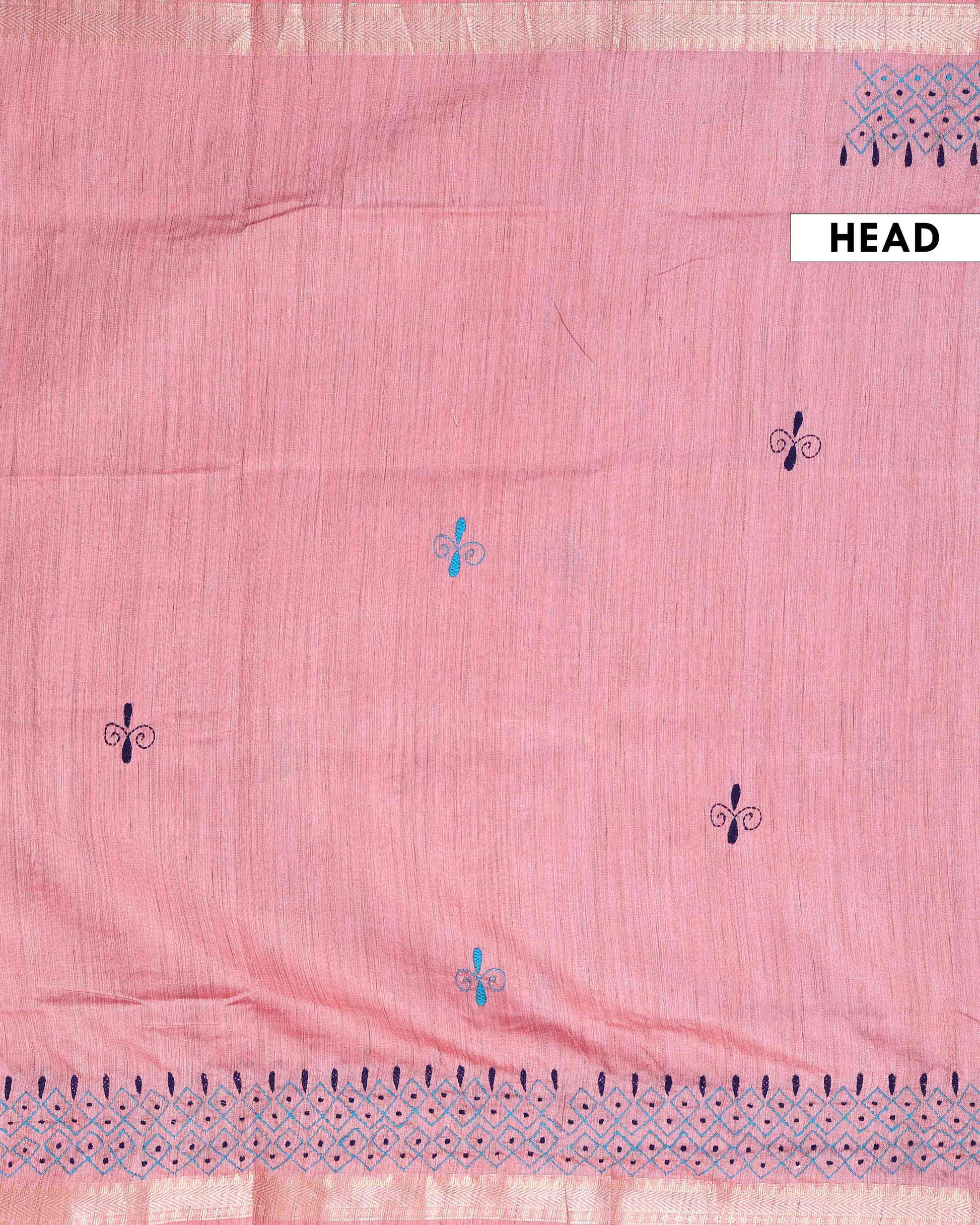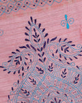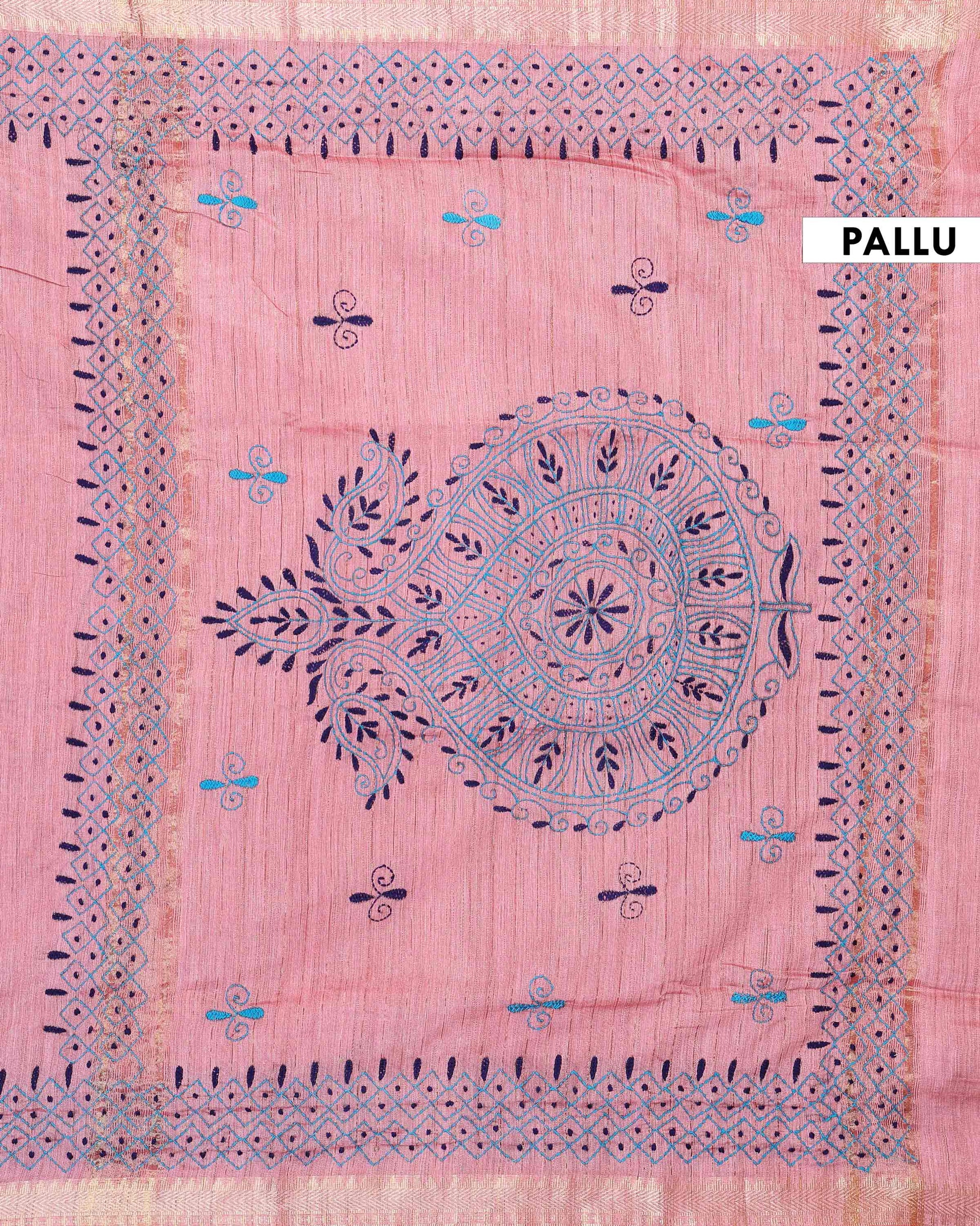 - This beautiful dusty Pink Kantha saree features intricate traditional embroidery along the border and pallu