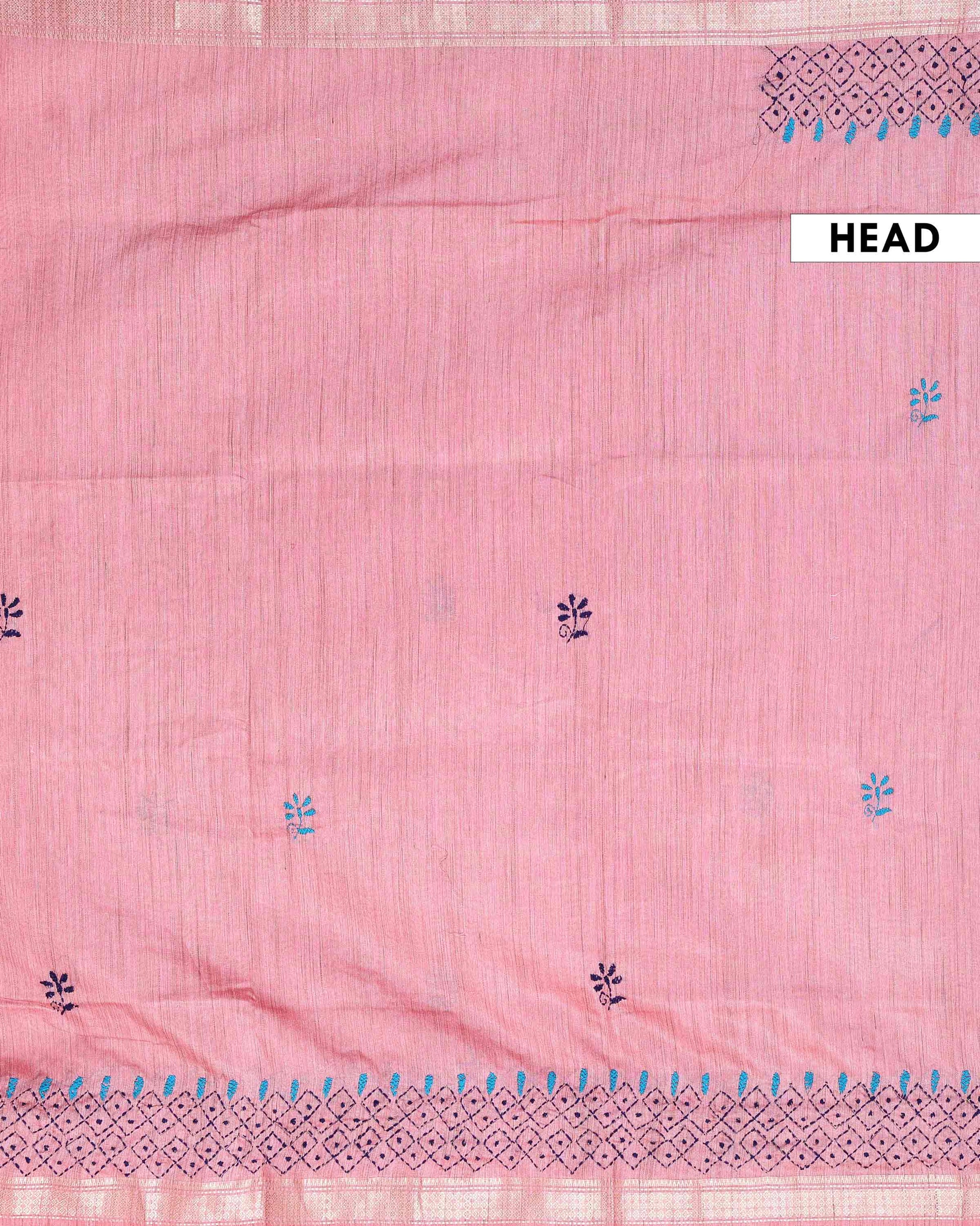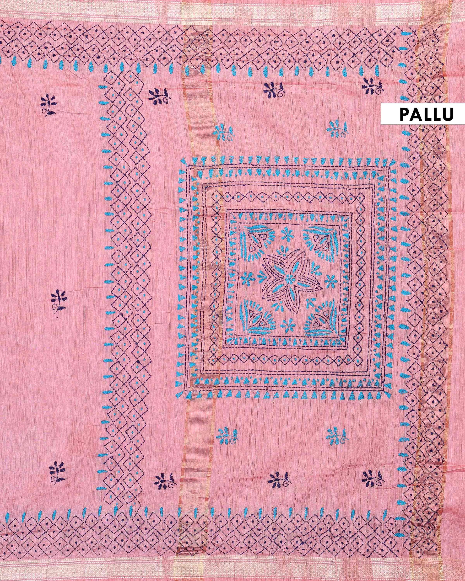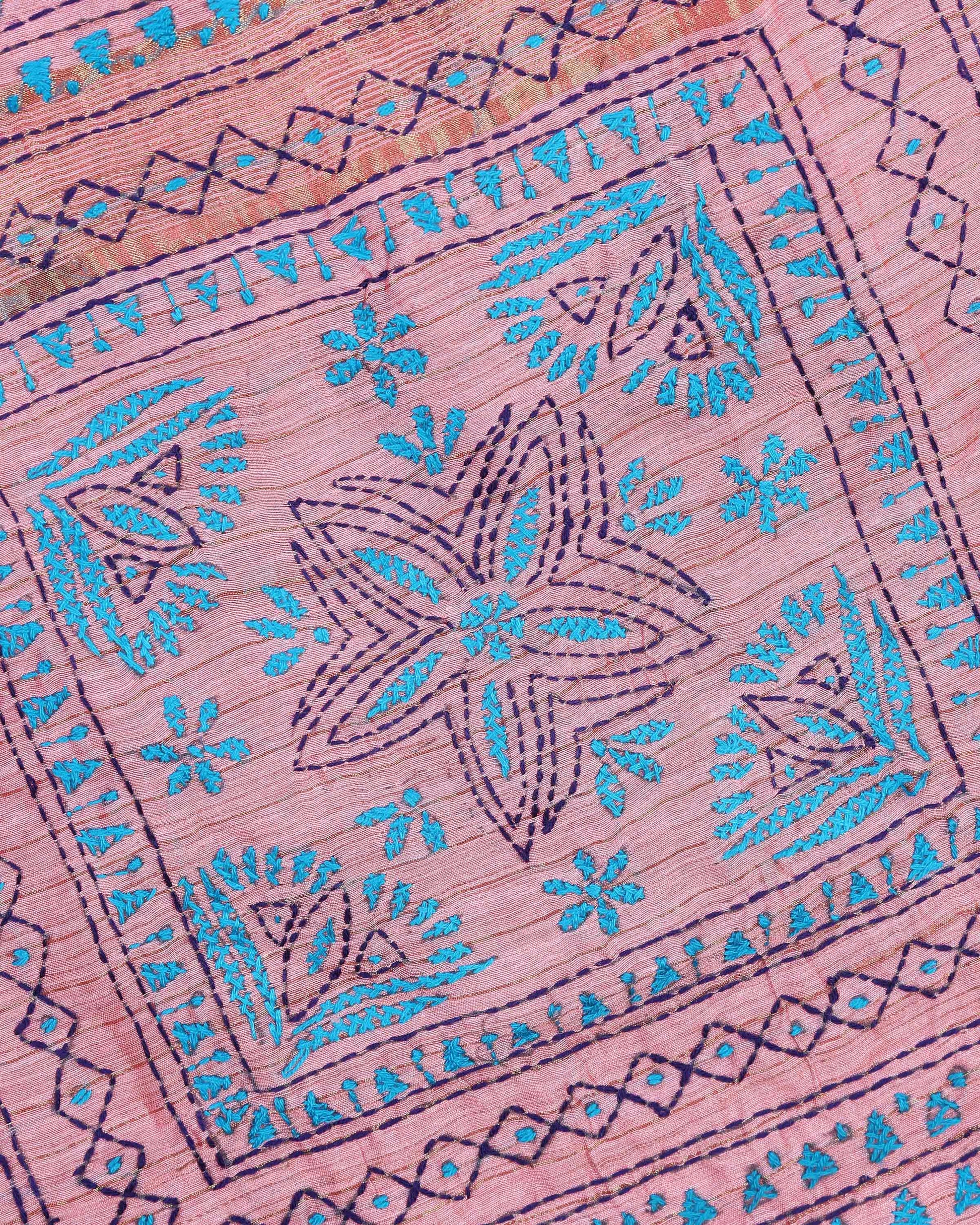 - This beautiful dusty Pink Kantha saree features intricate traditional embroidery along the border and pallu