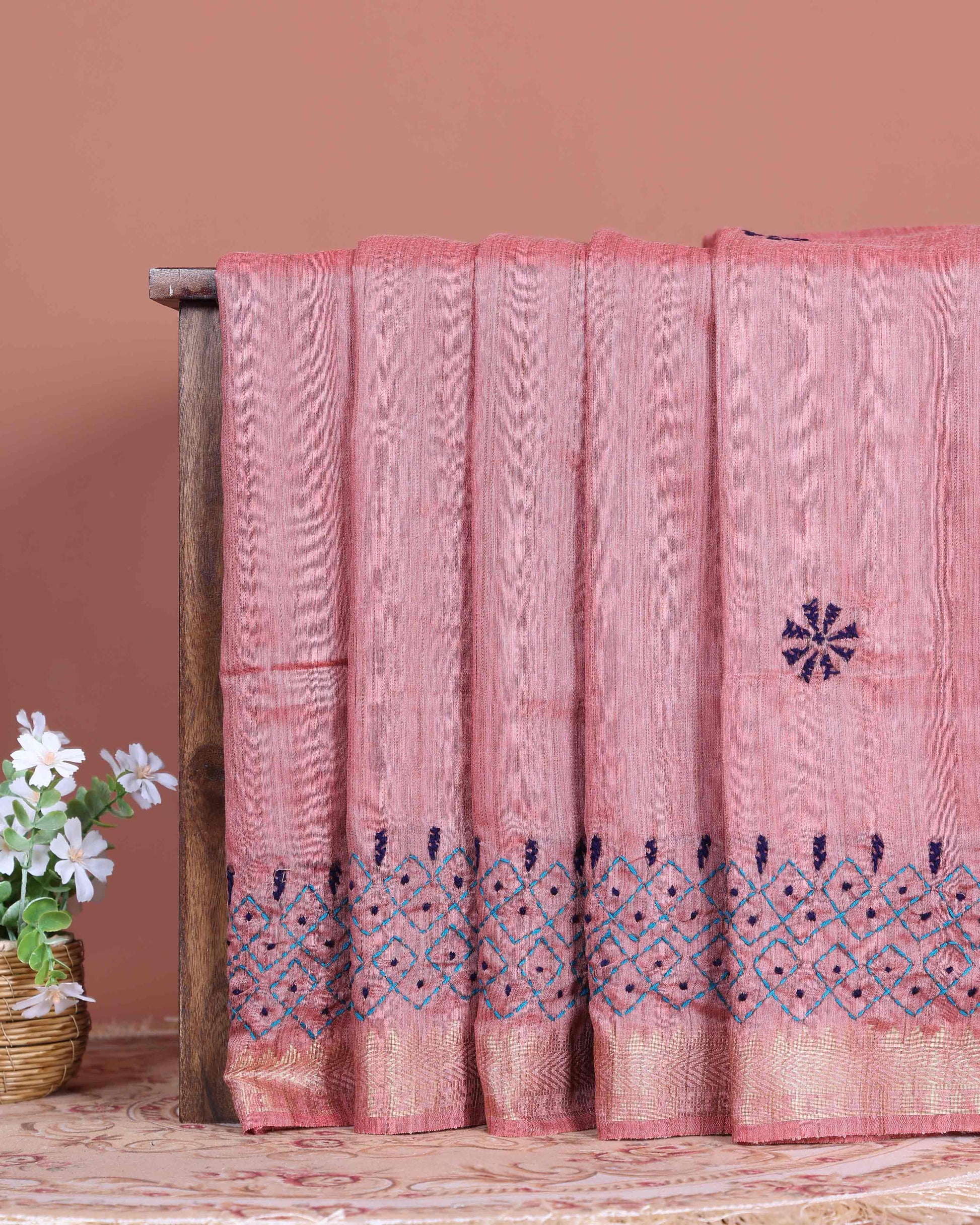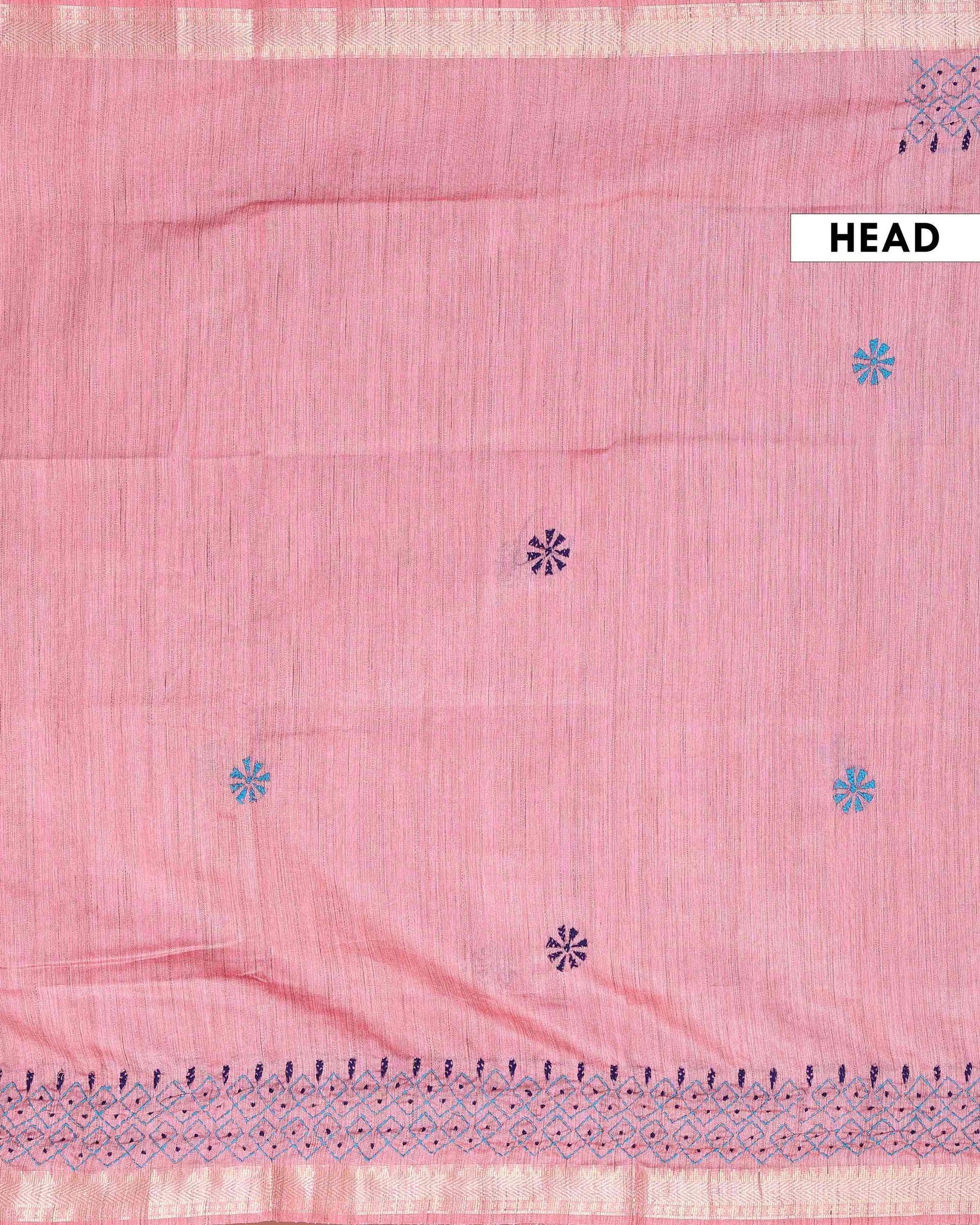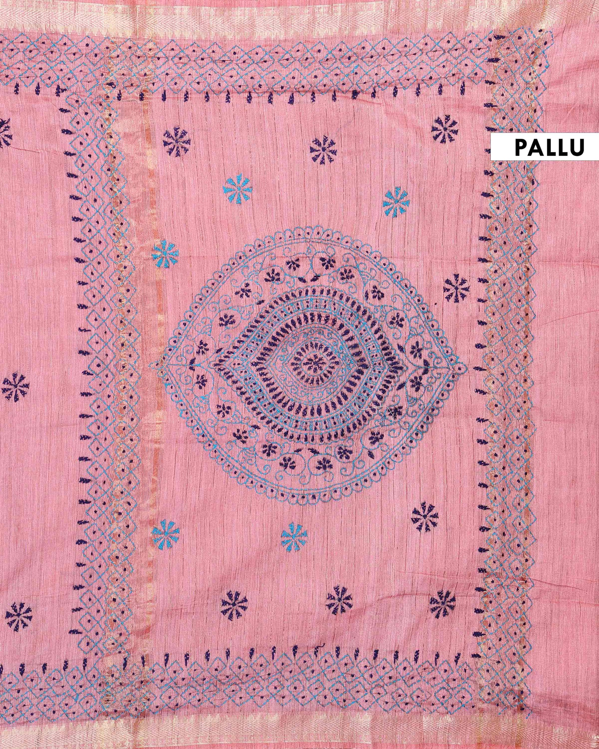 - This beautiful dusty Pink Kantha saree features intricate traditional embroidery along the border and pallu