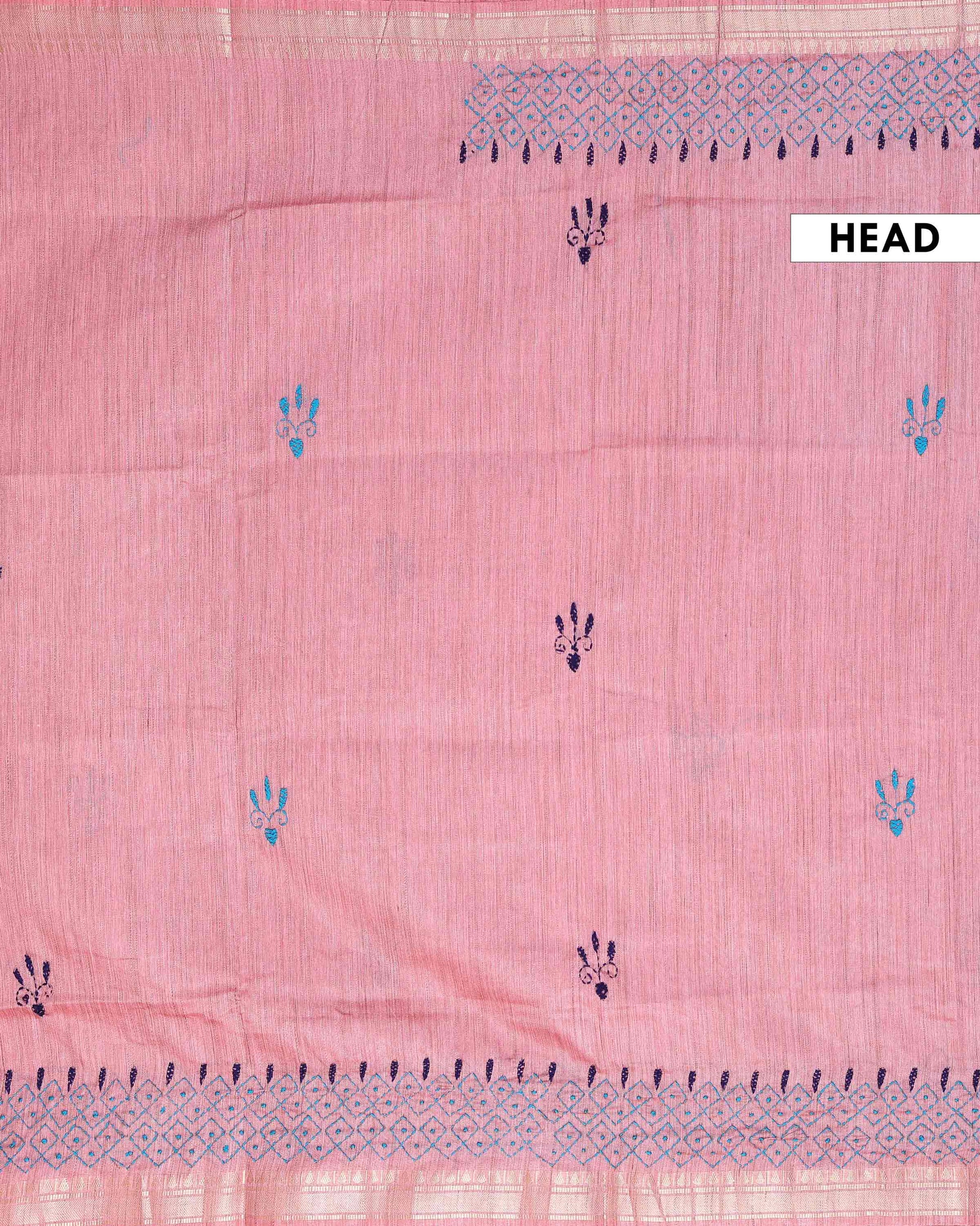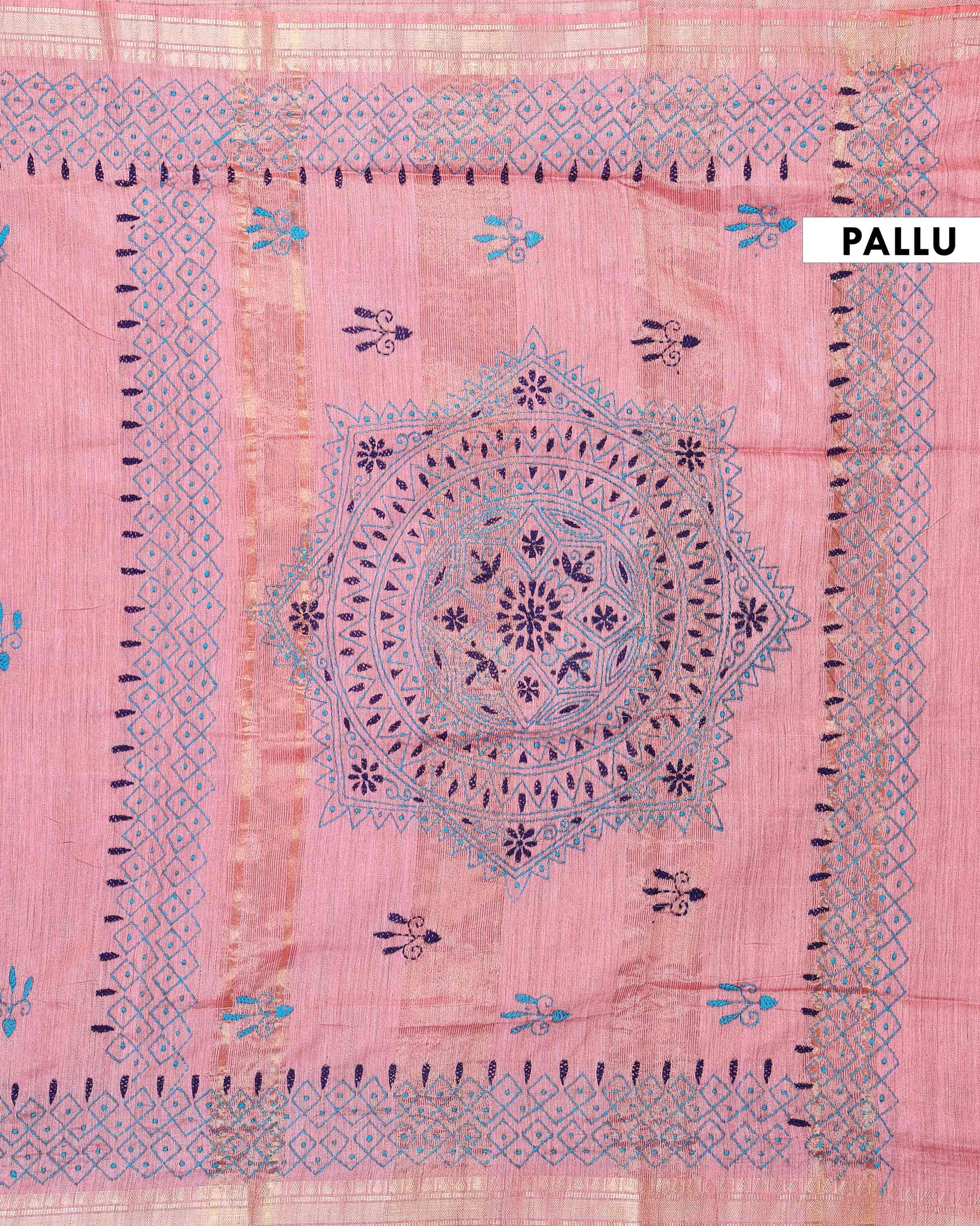 - This beautiful Dusty Pink Kantha saree features intricate traditional embroidery along the border and pallu