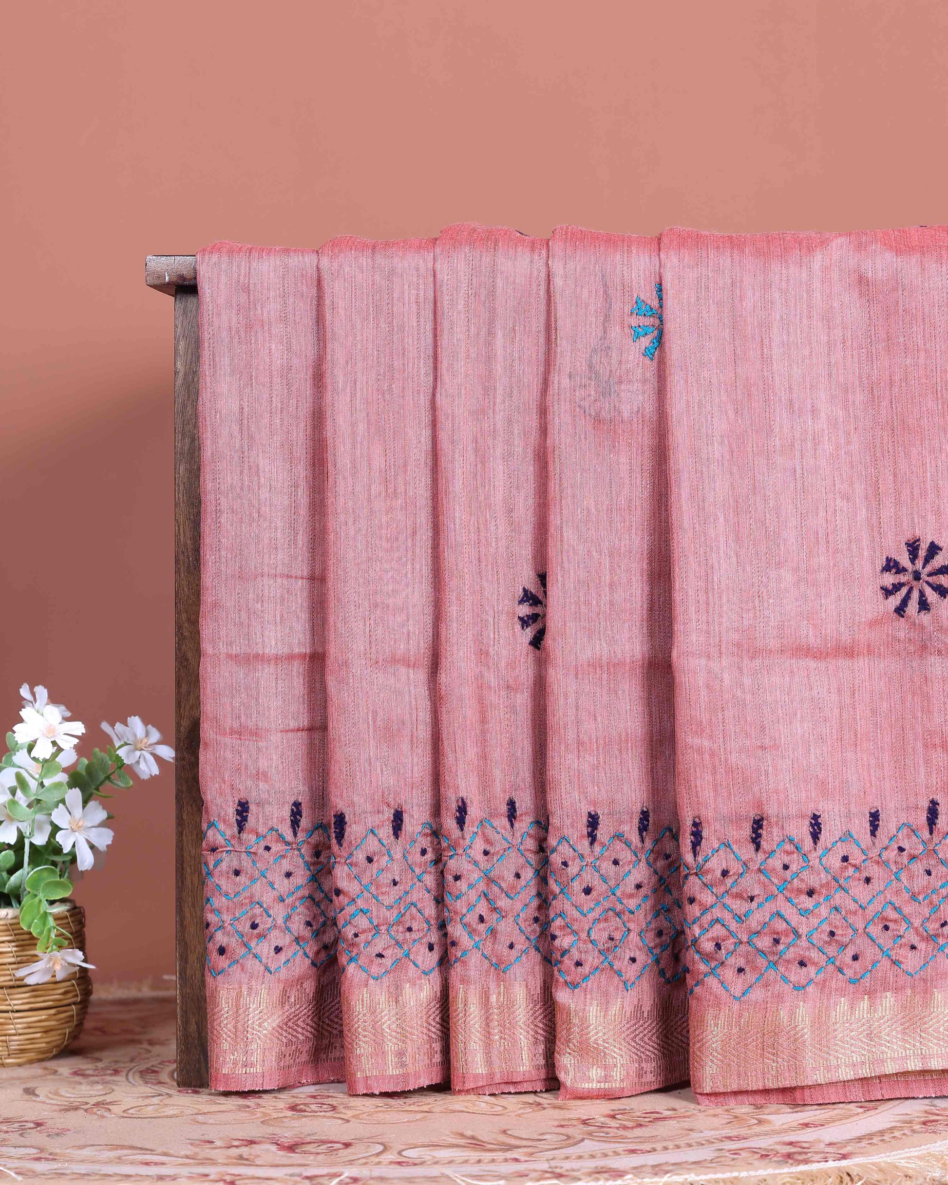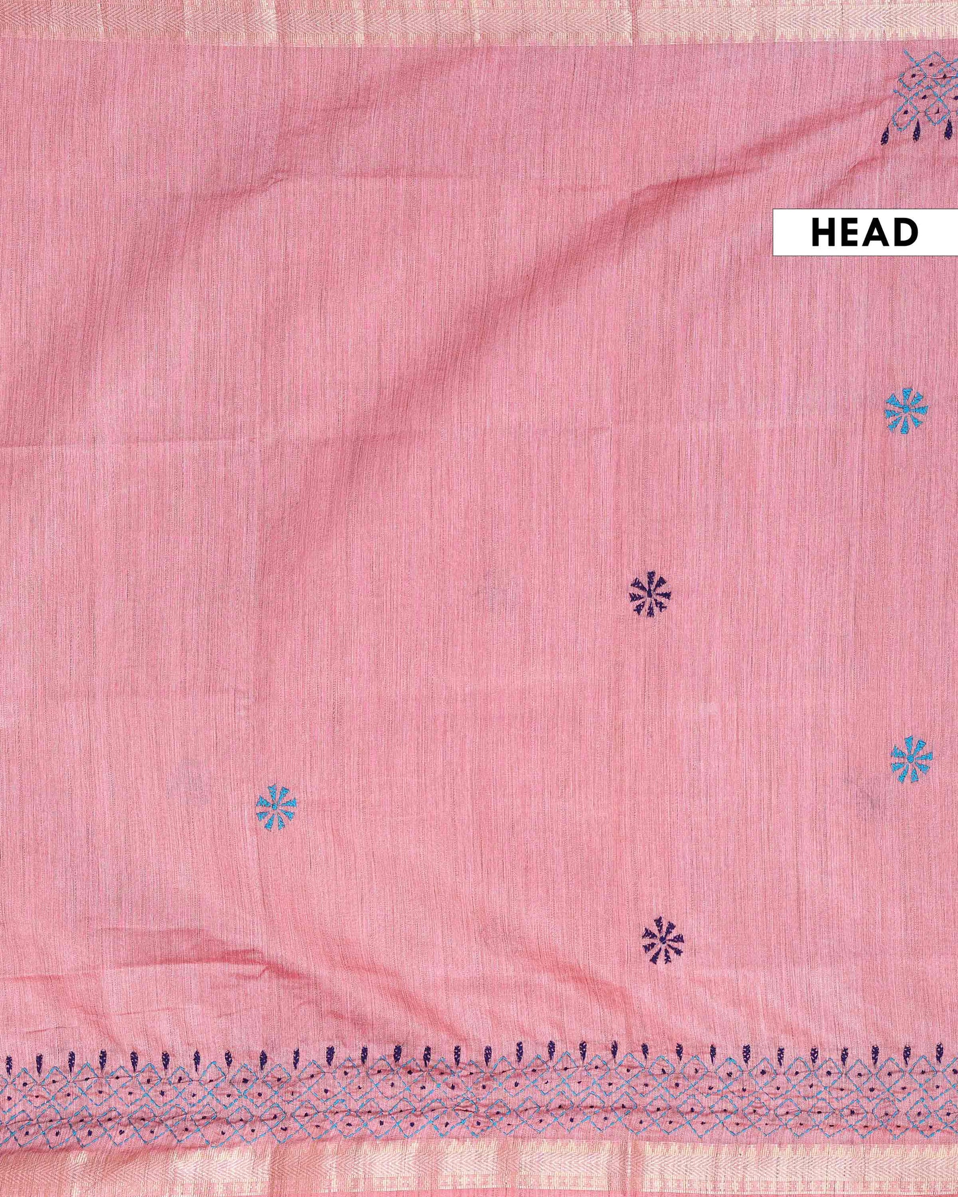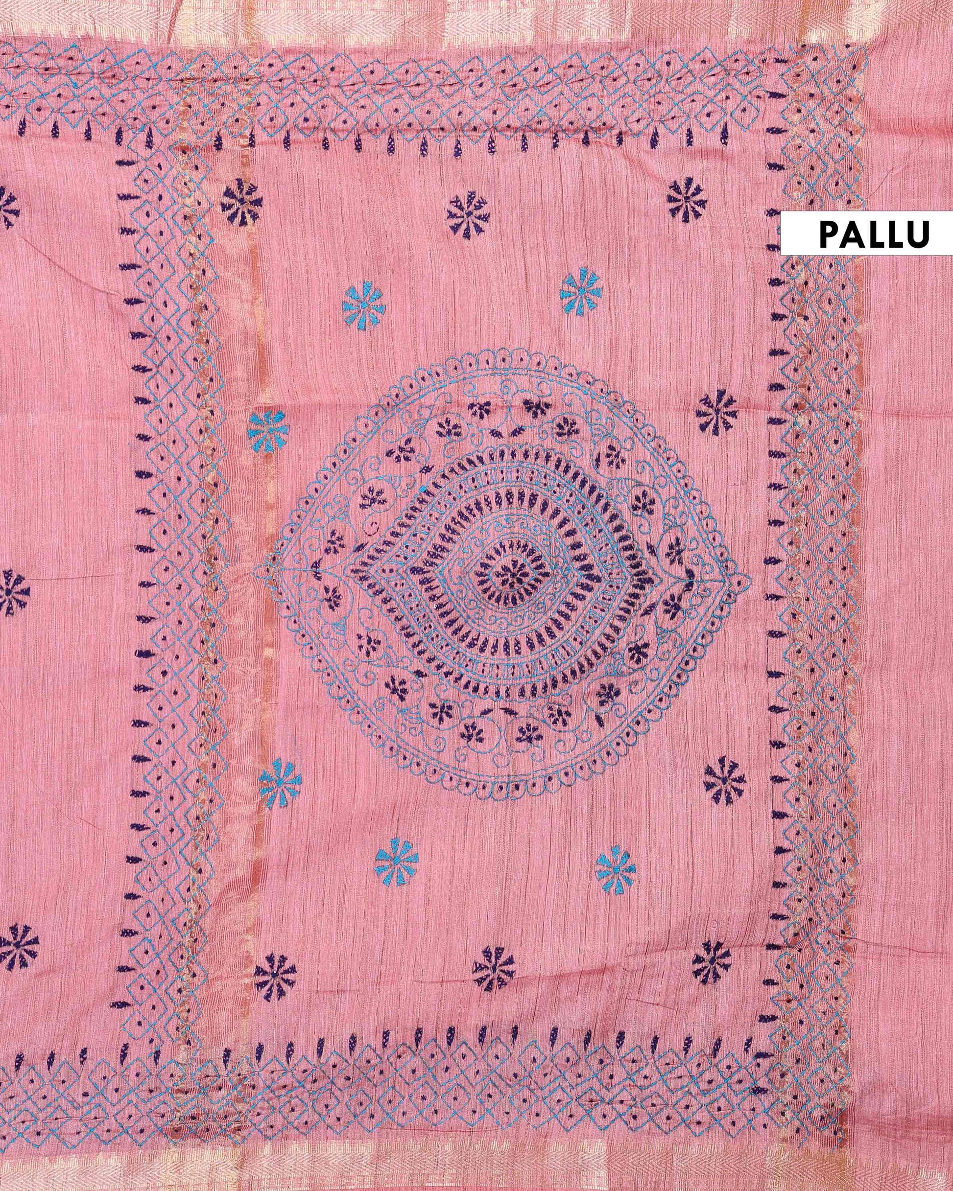 - This beautiful dusty Pink Kantha saree features intricate traditional embroidery along the border and pallu