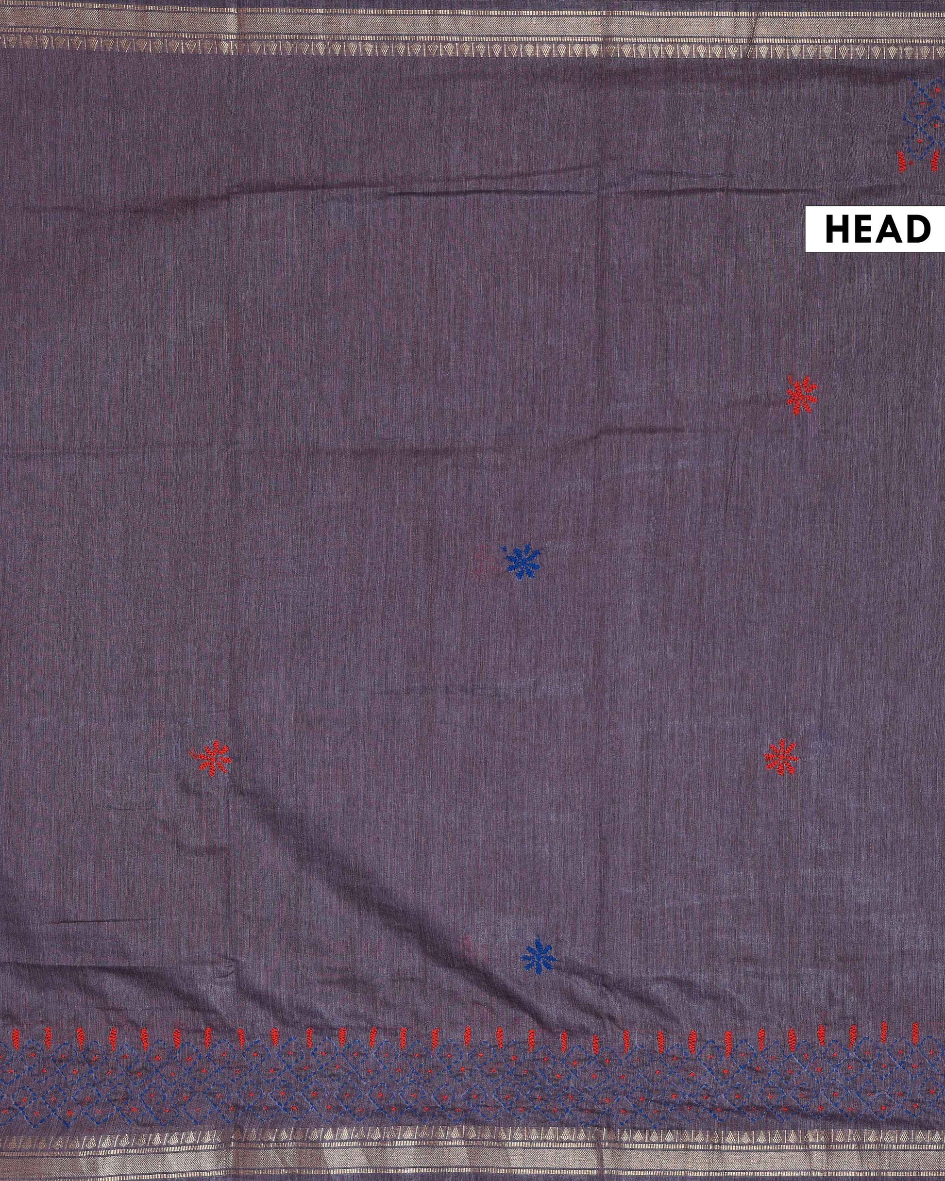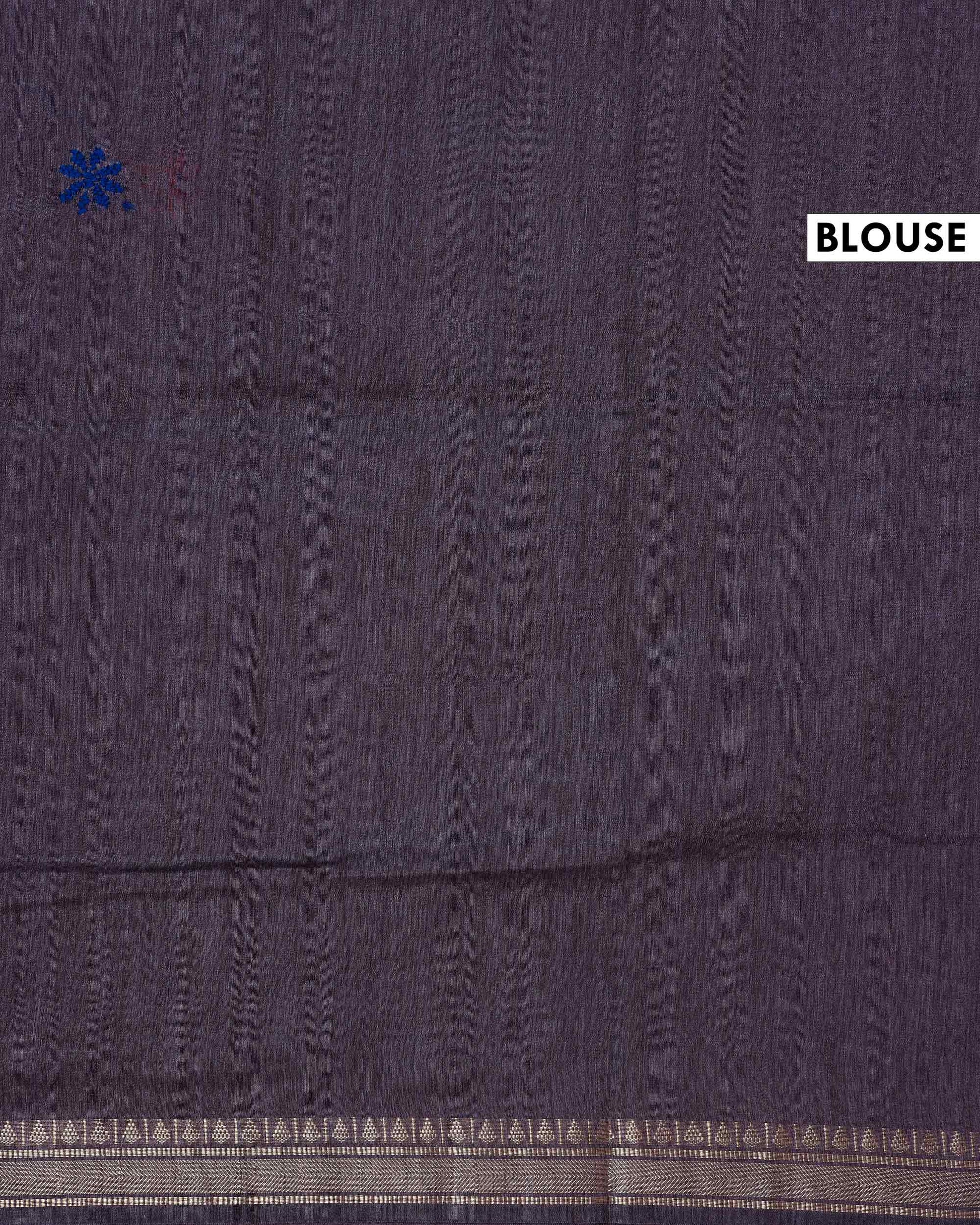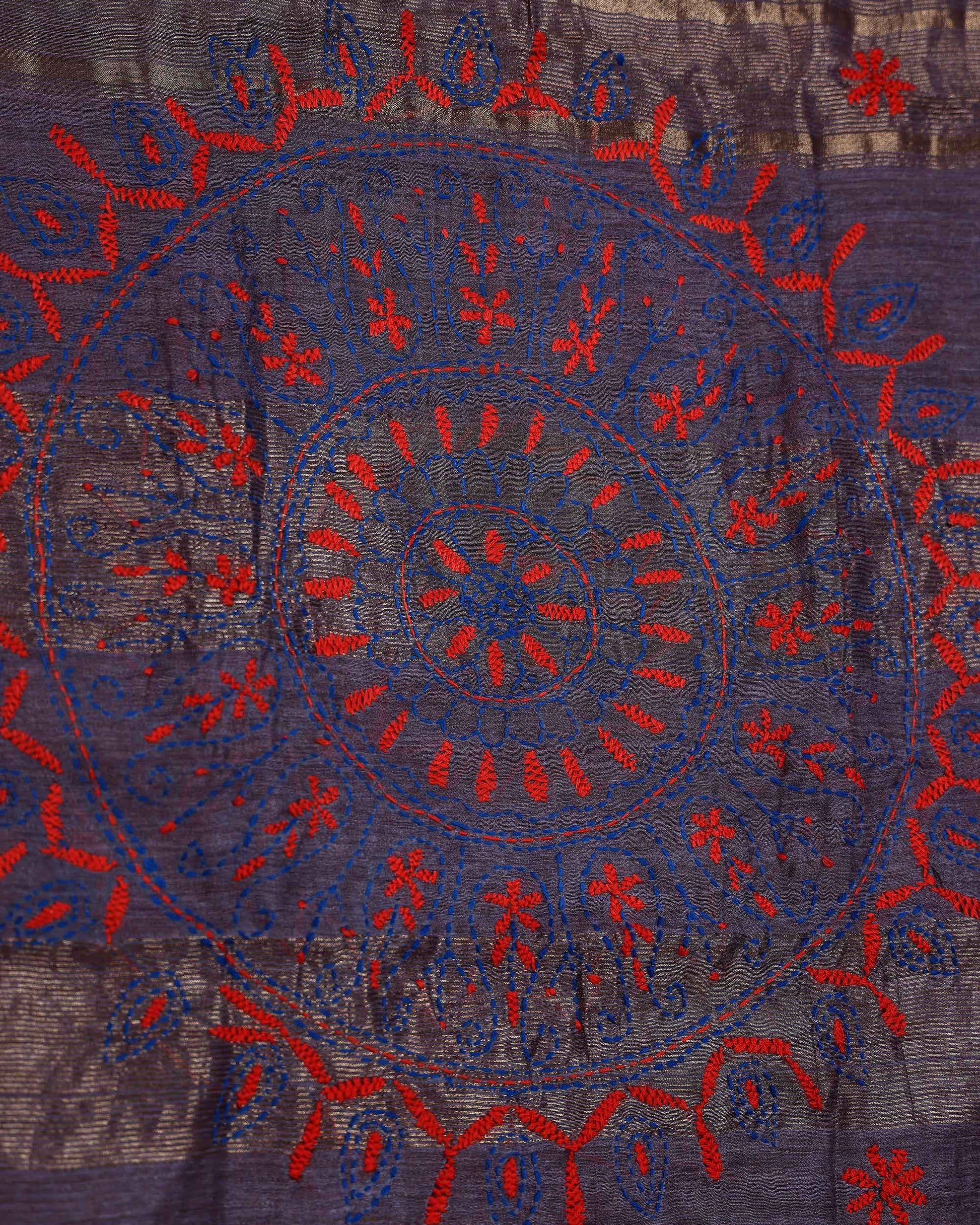 - This beautiful Dusty Purple Kantha saree features intricate traditional embroidery along the border and pallu