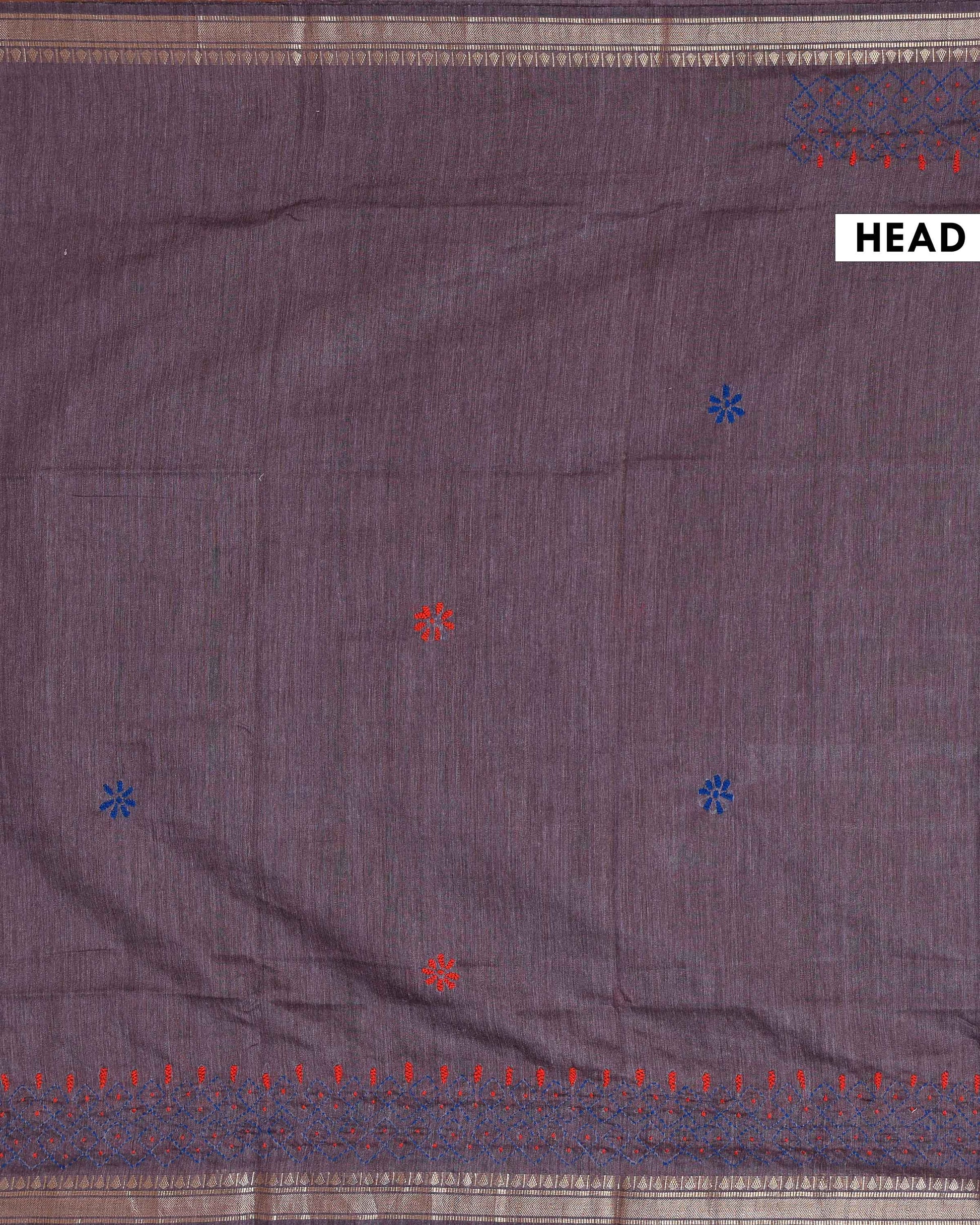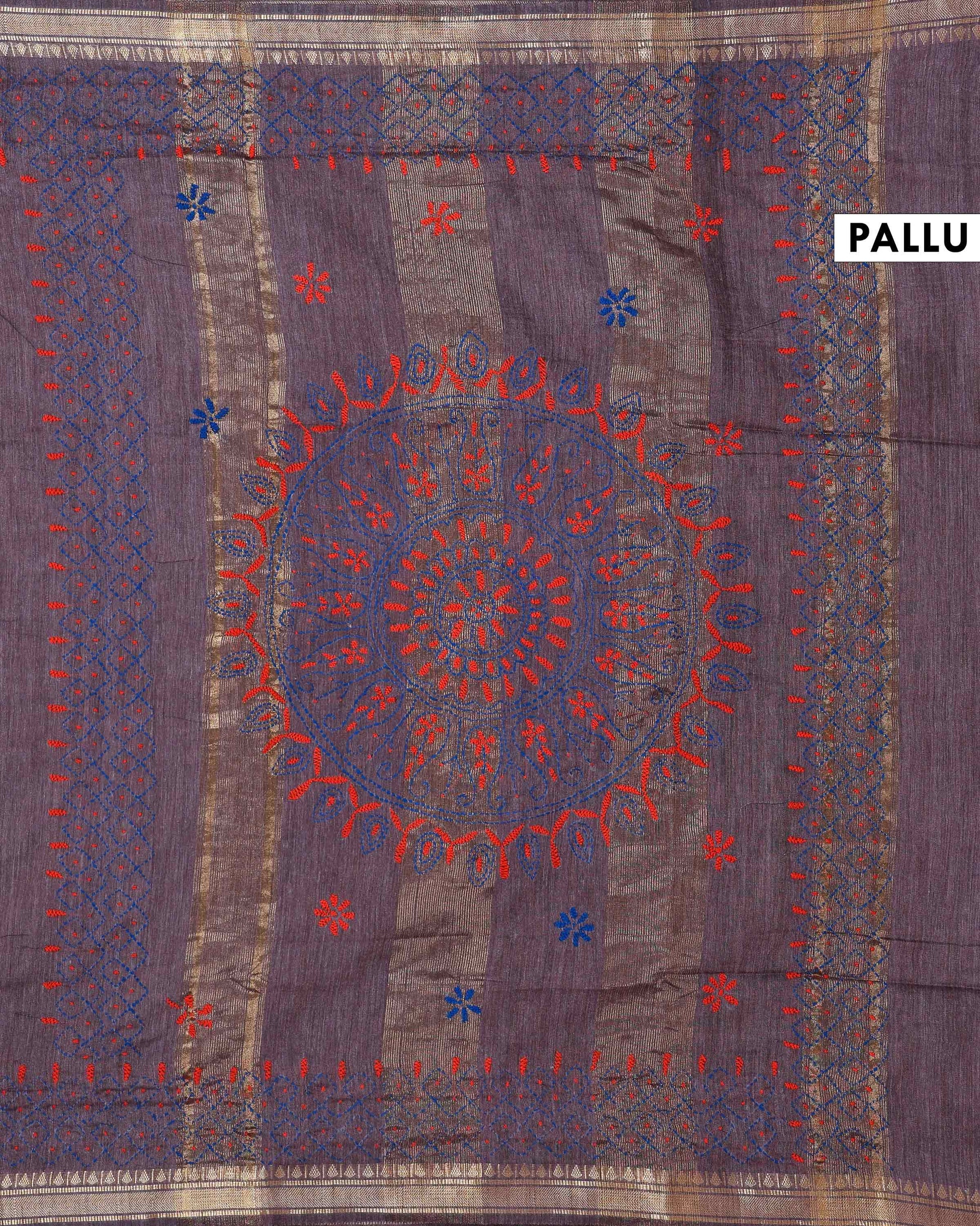 - This beautiful Dusty Purple Kantha saree features intricate traditional embroidery along the border and pallu