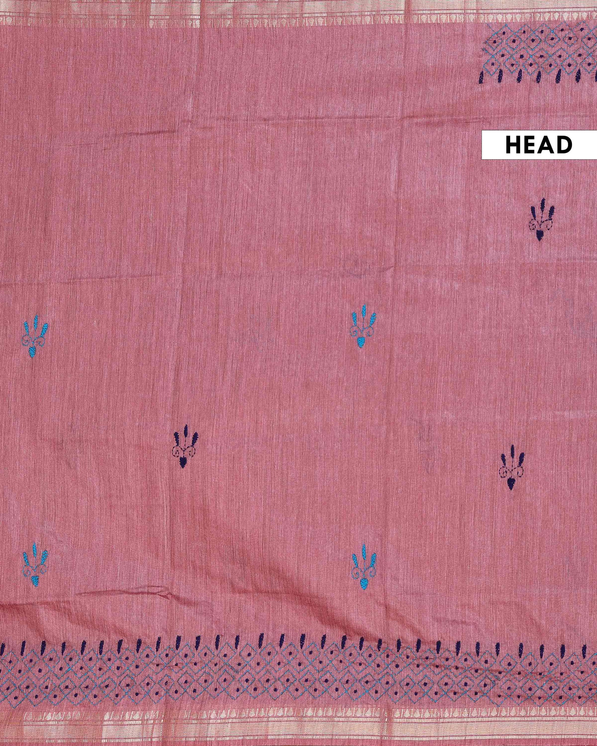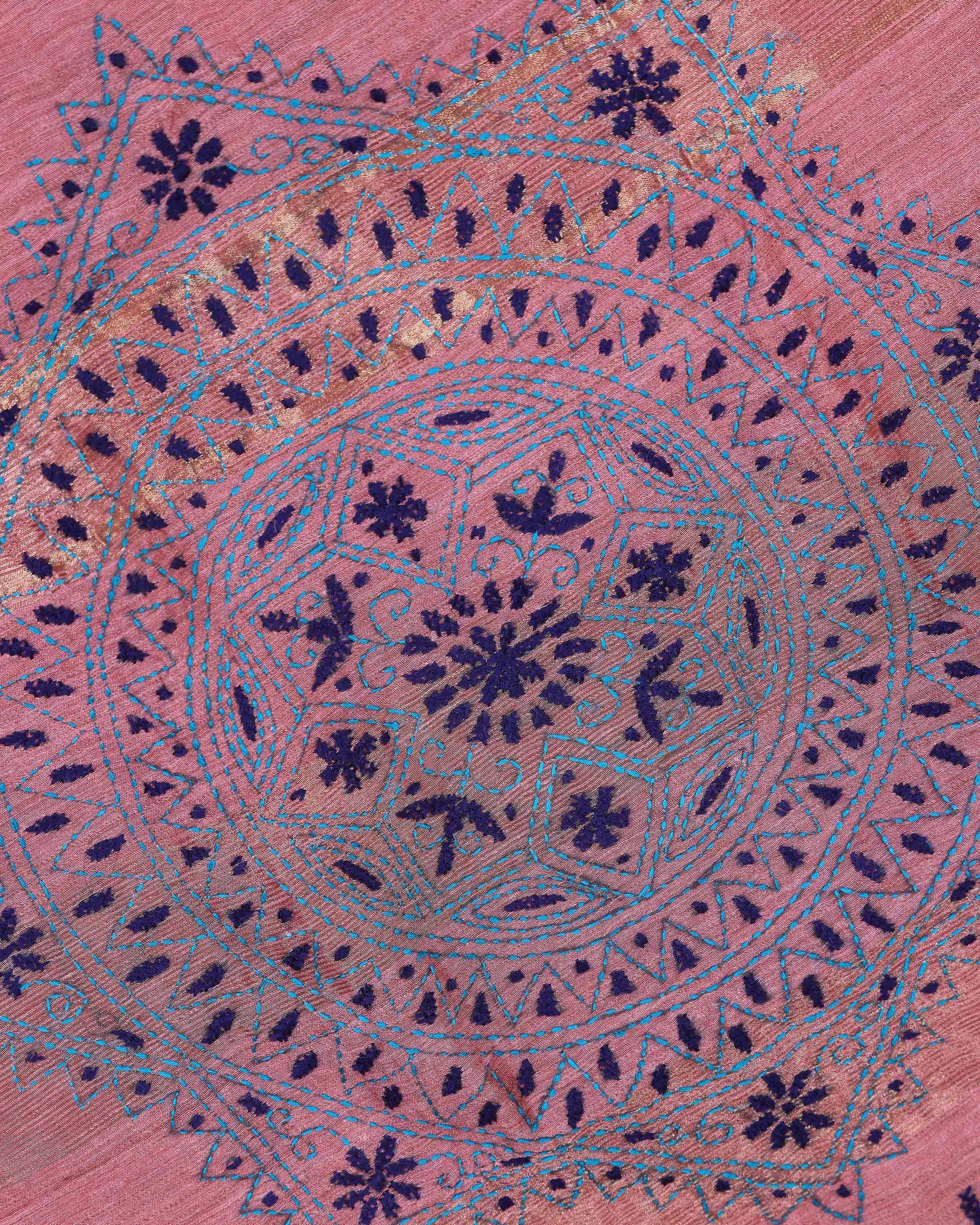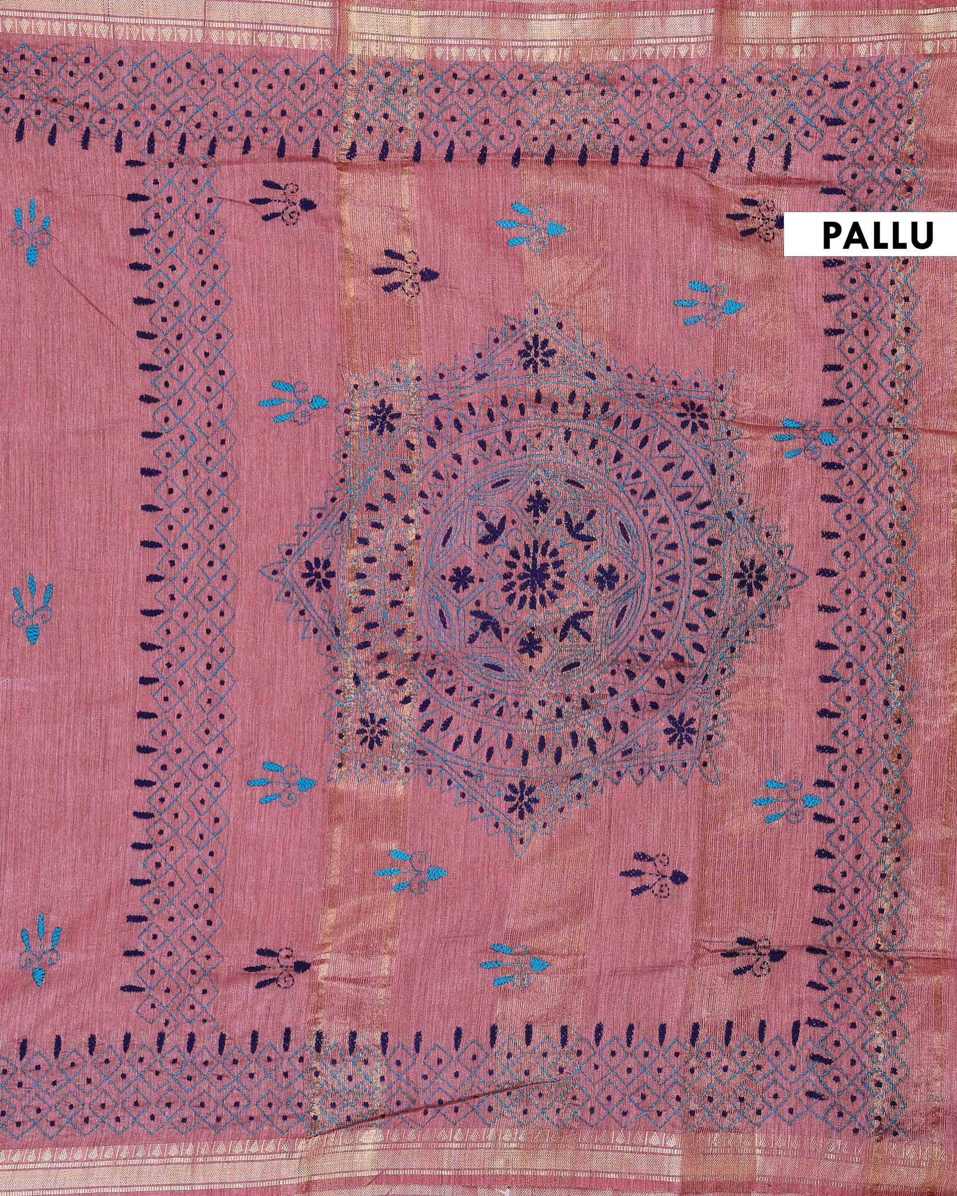 - This beautiful Dusty Rose Kantha saree features intricate traditional embroidery along the border and pallu