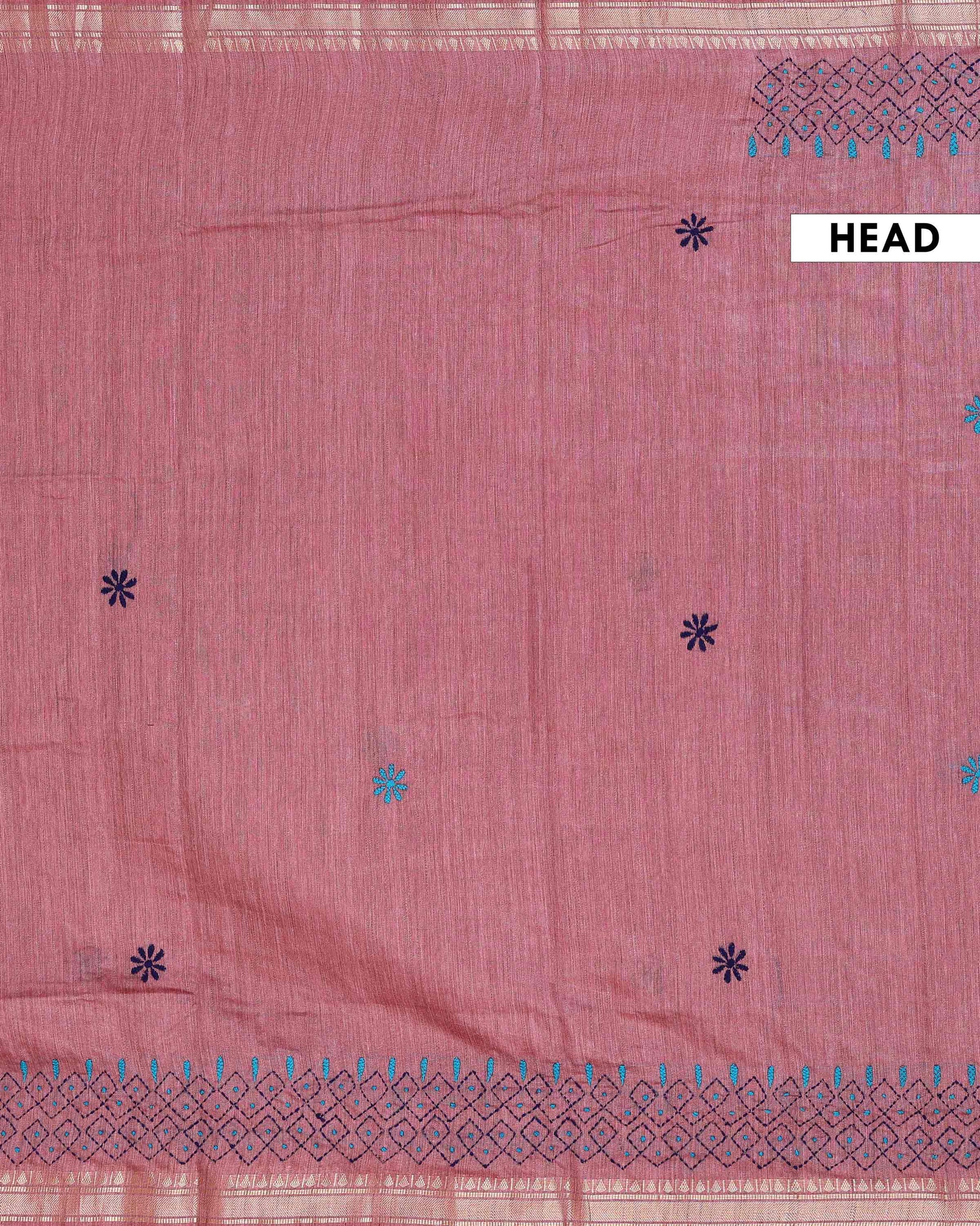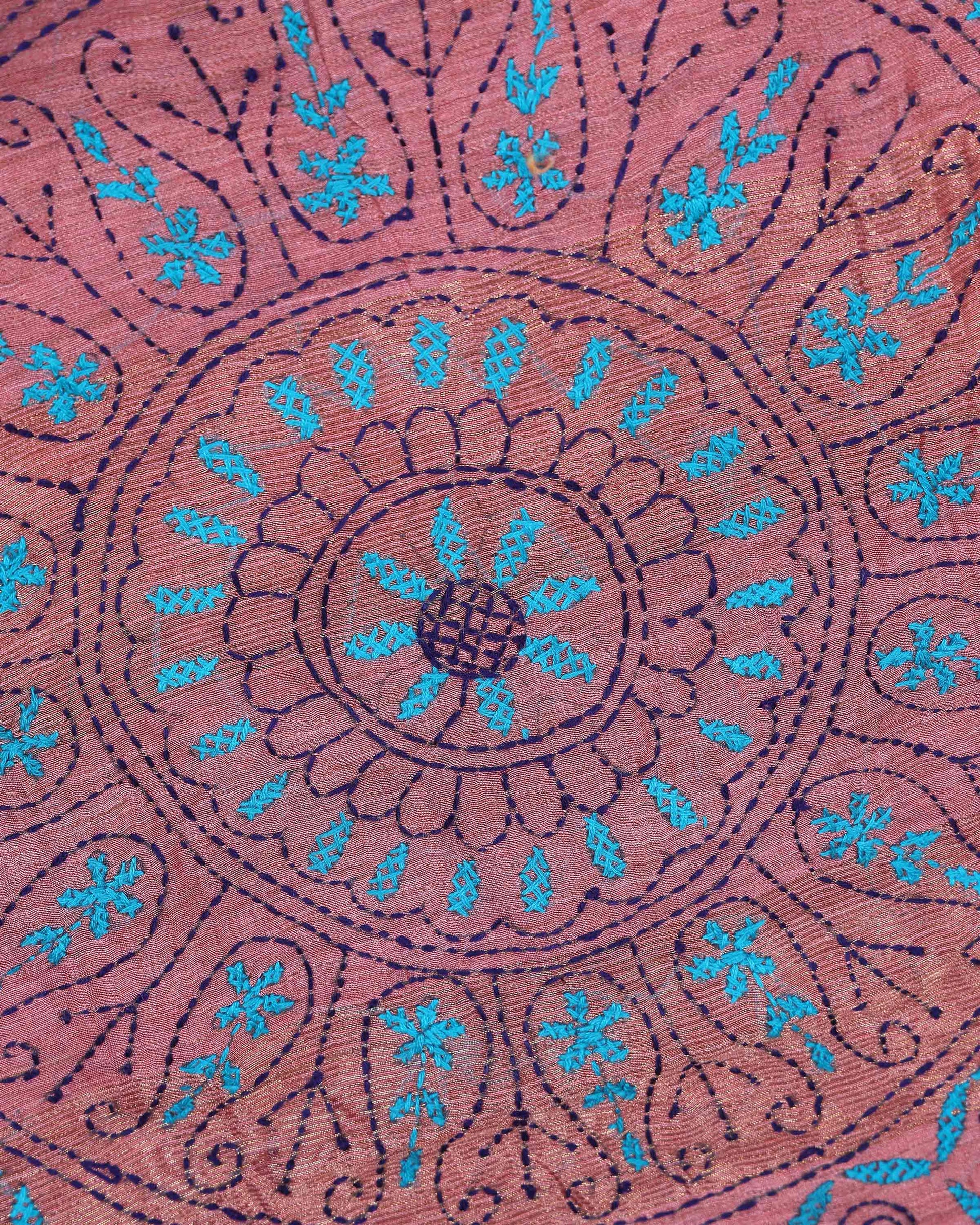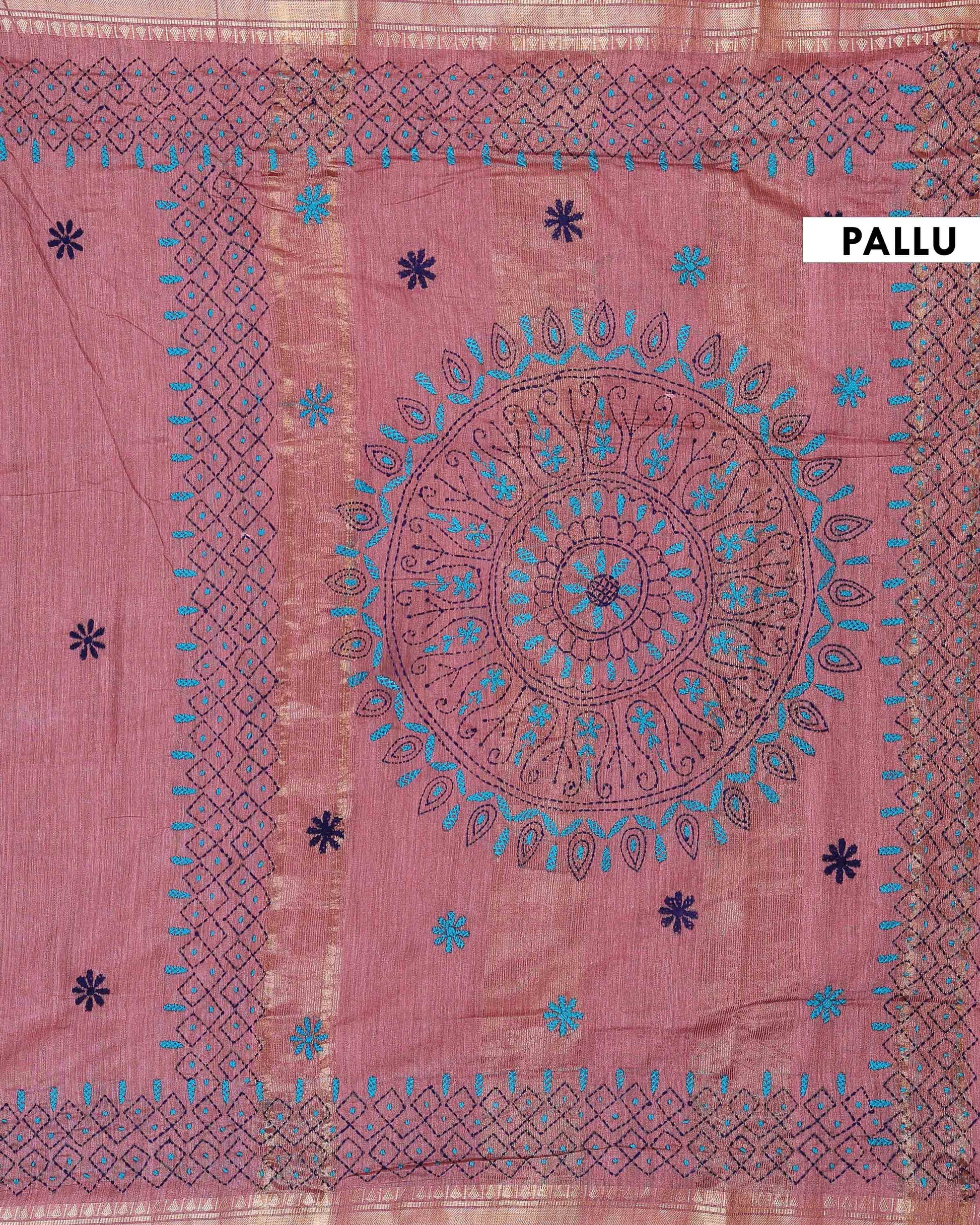 - This beautiful Dusty Rose Kantha saree features intricate traditional embroidery along the border and pallu