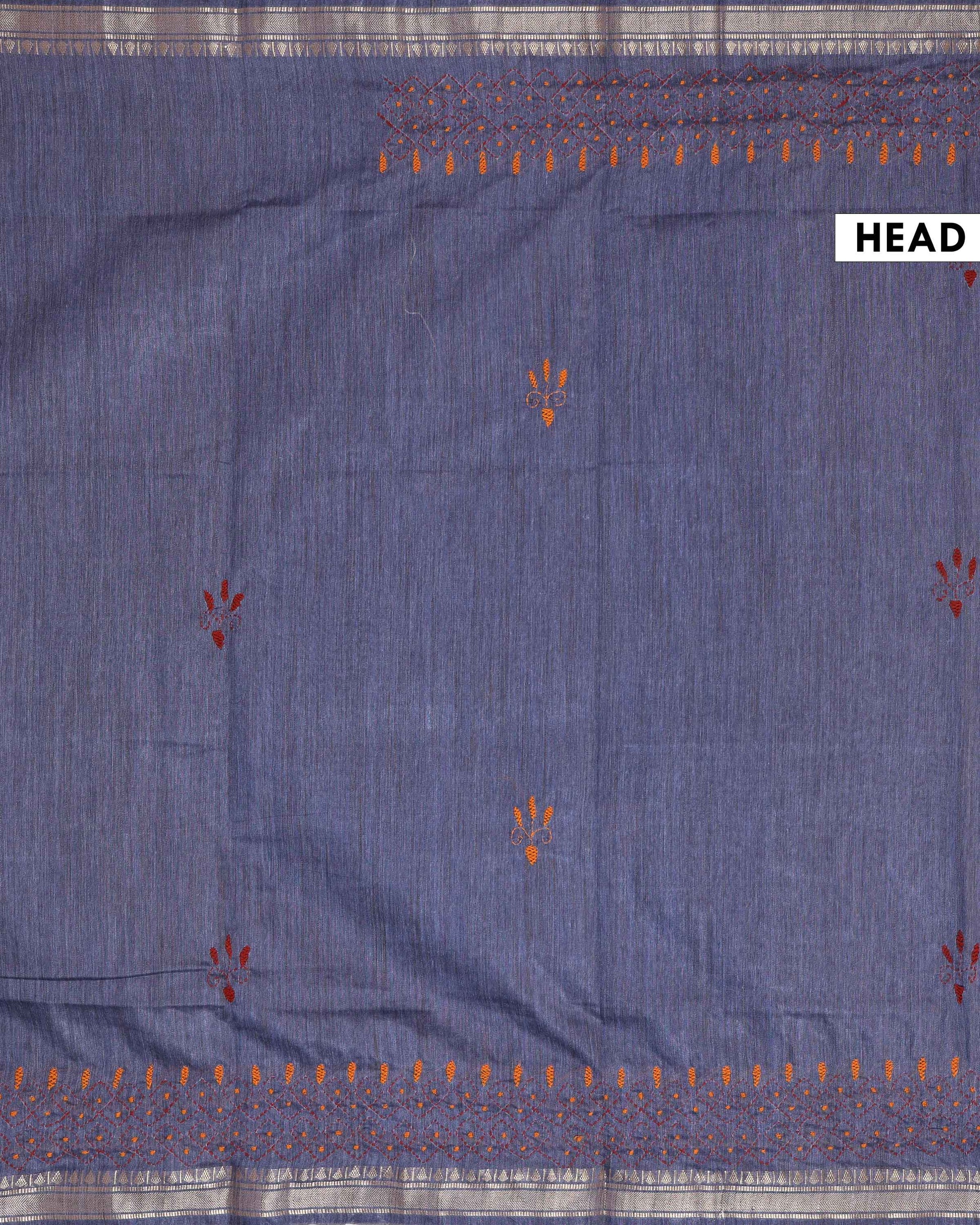 - This beautiful Grey Kantha saree features intricate traditional embroidery along the border and pallu