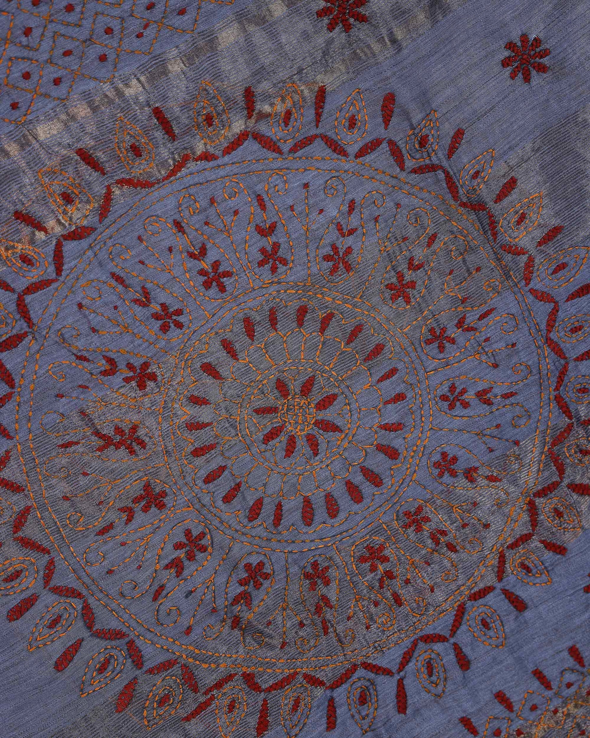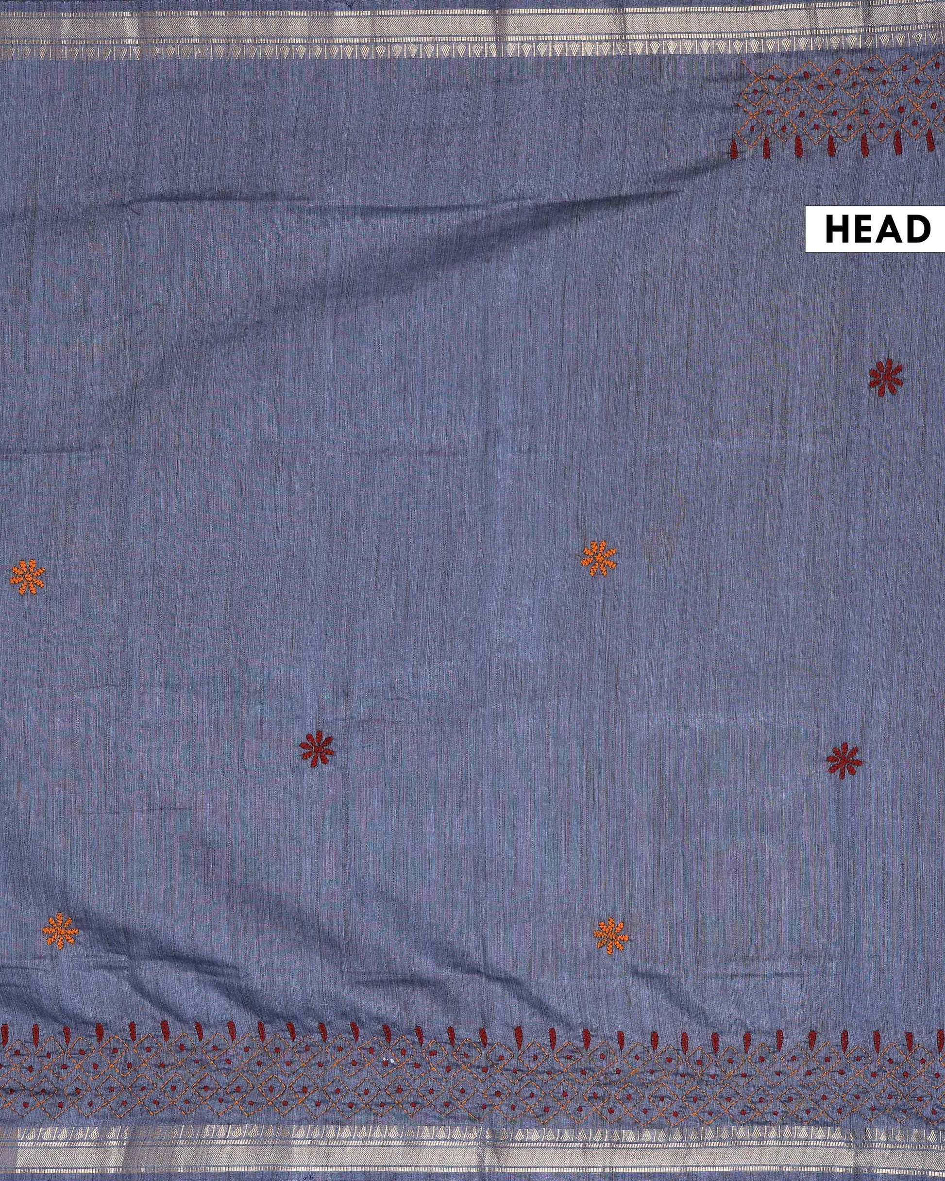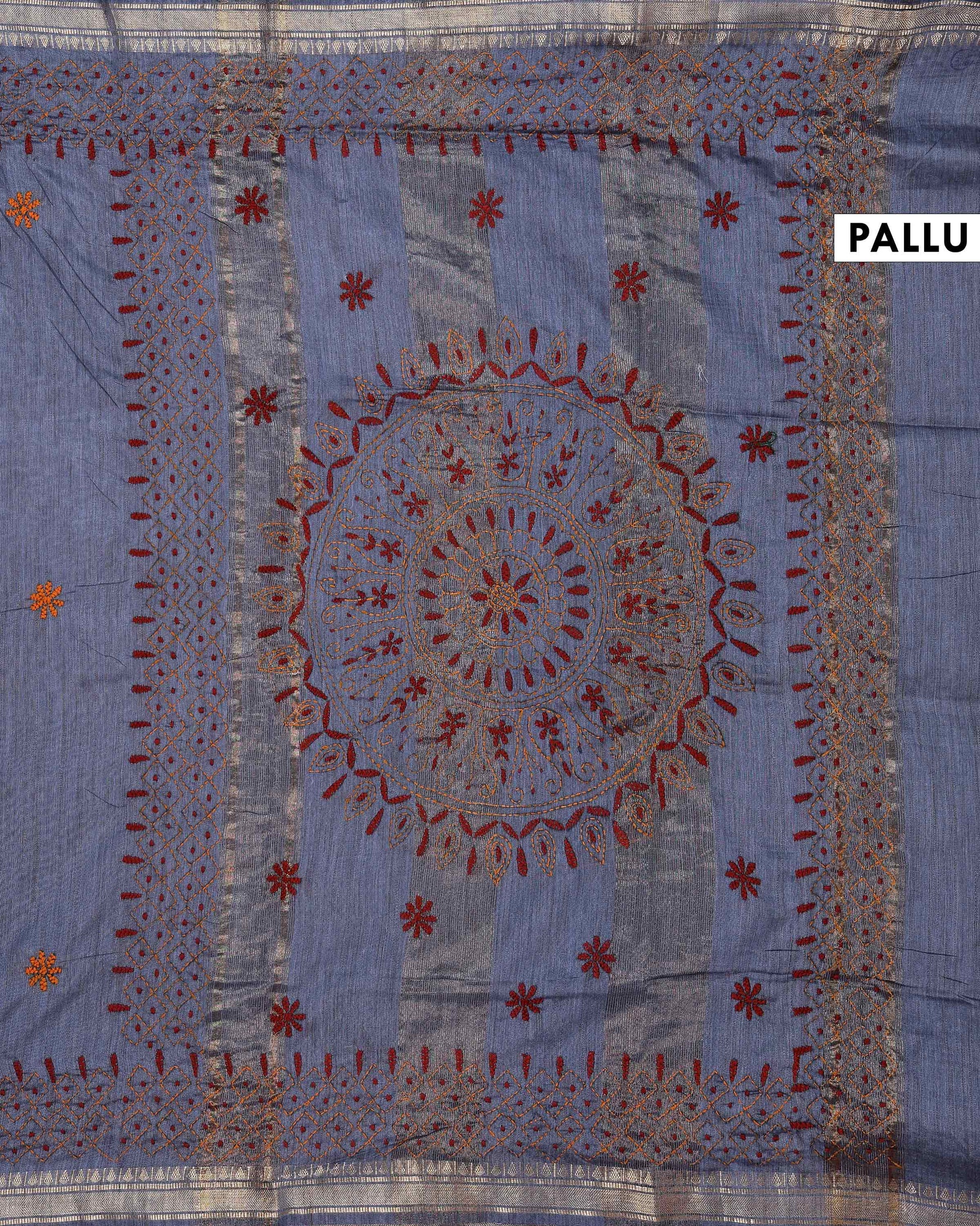- This beautiful Grey Kantha saree features intricate traditional embroidery along the border and pallu